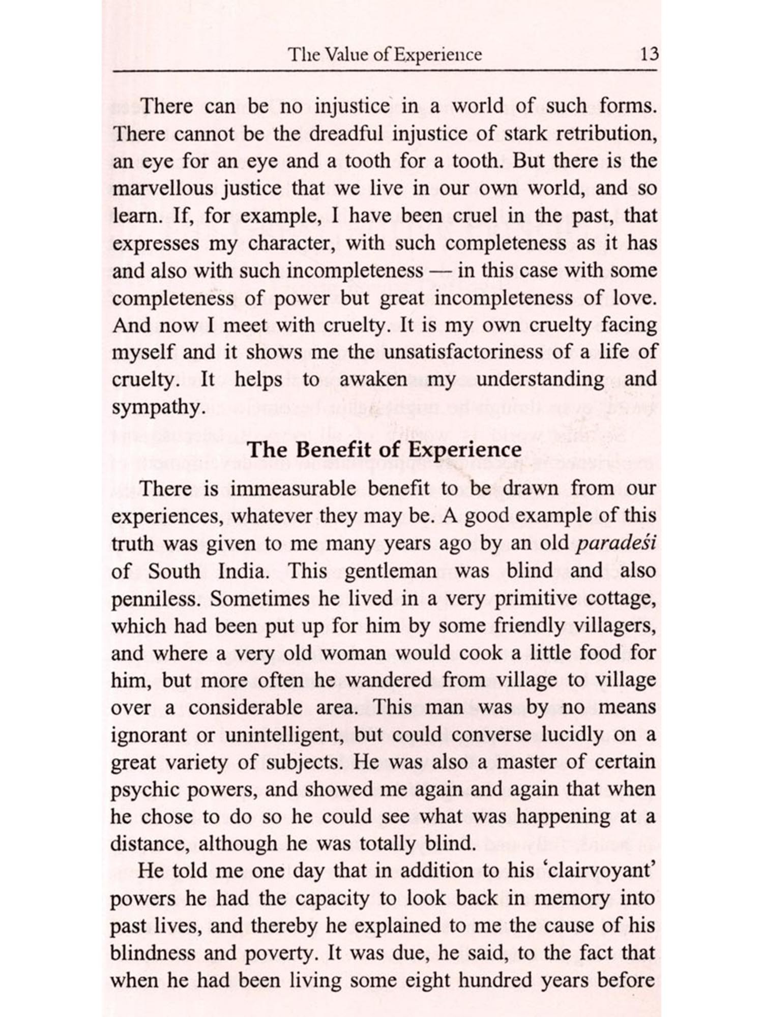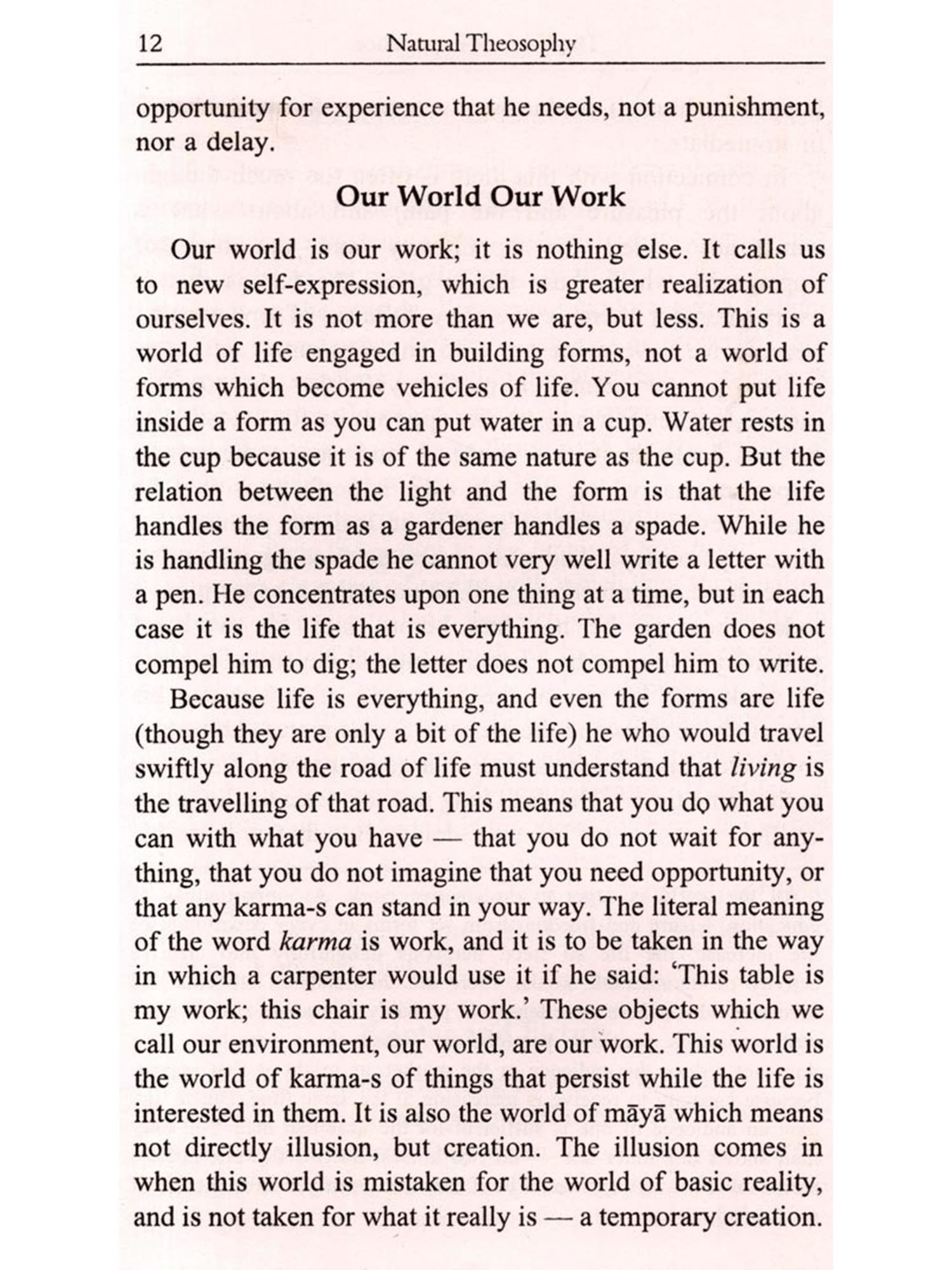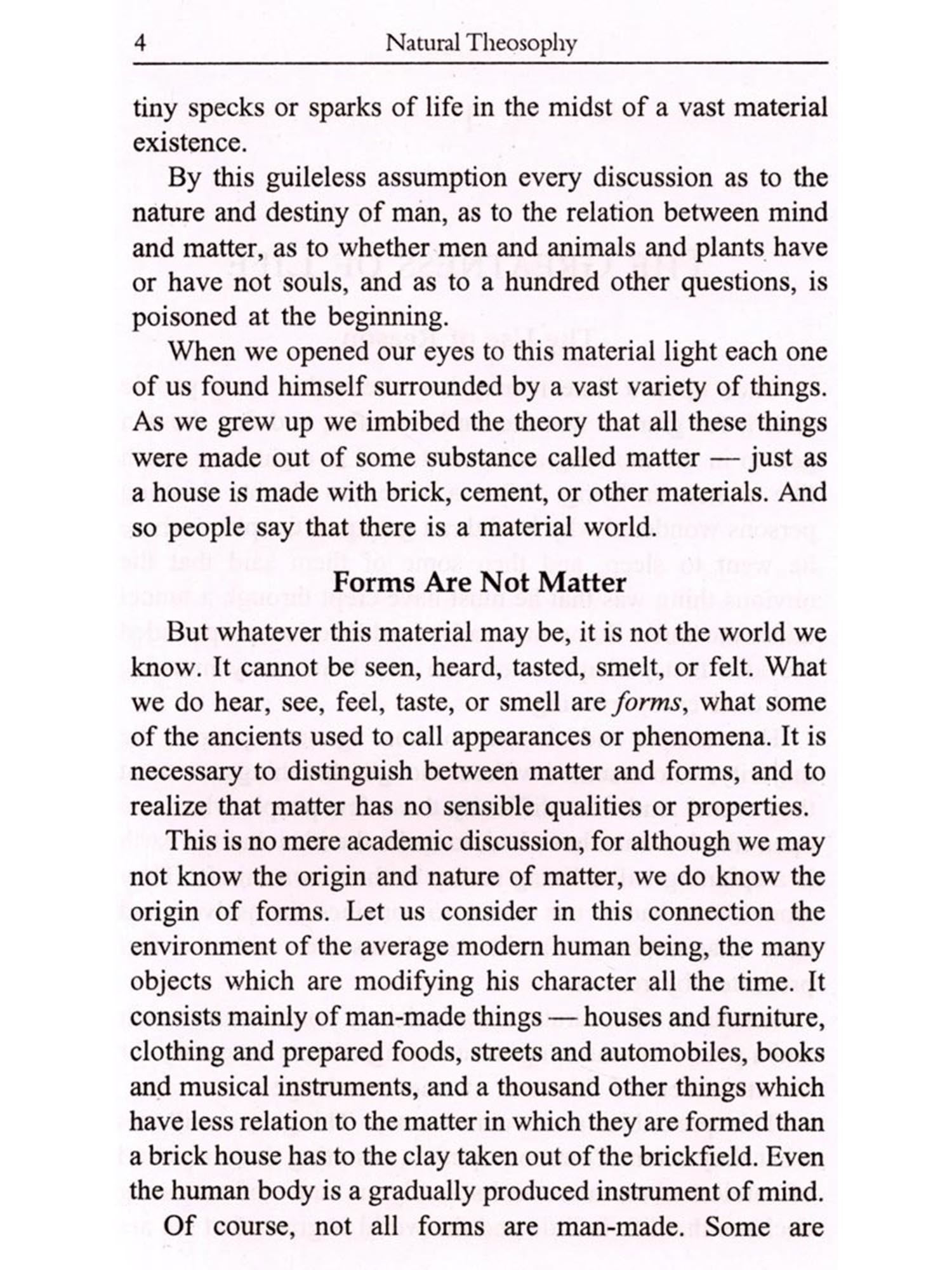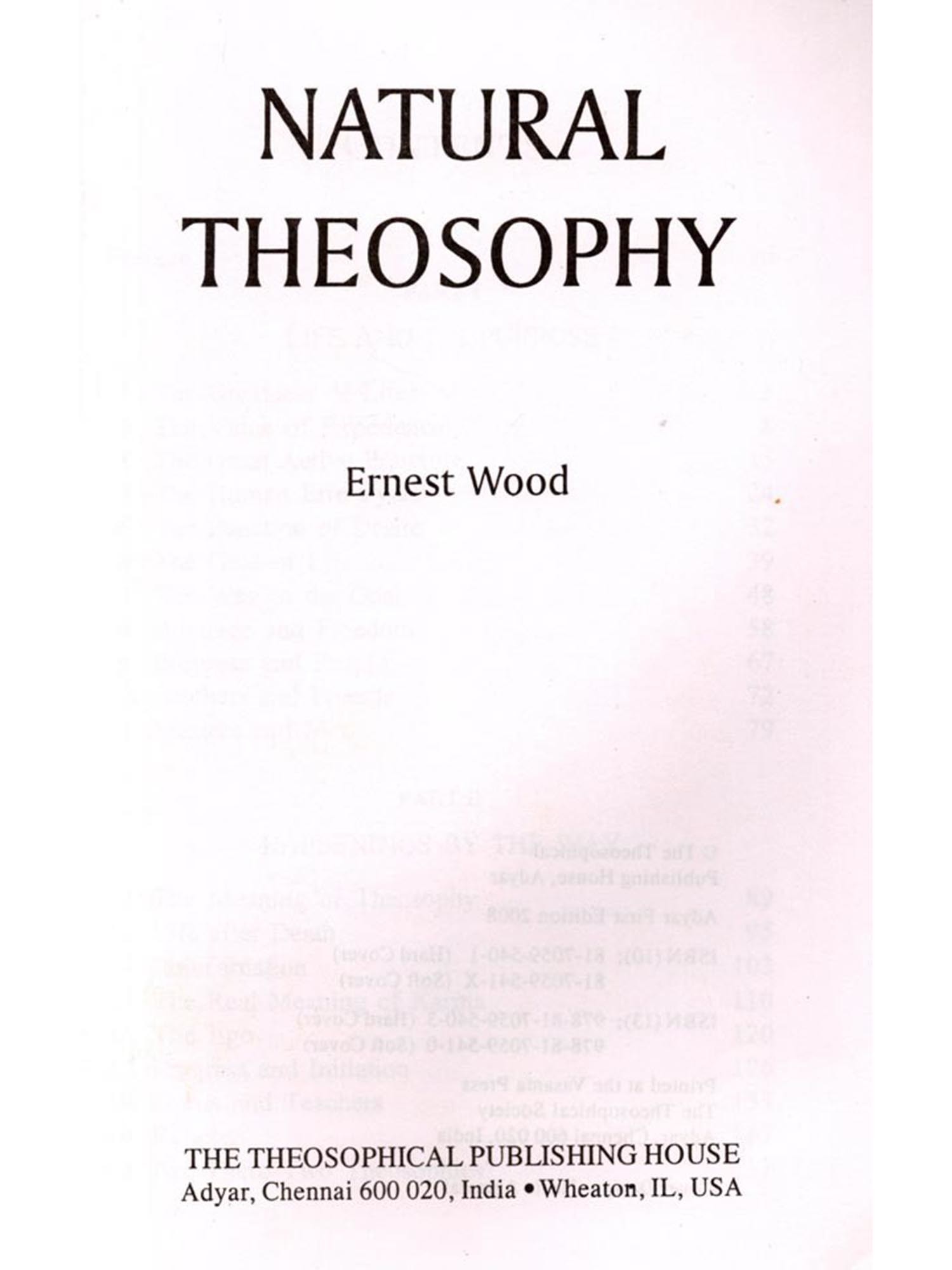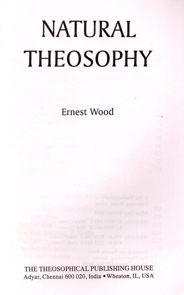 A friend, having looked over the proofs of this volume, cried out, 'Good heavens! Why have you put the word Theosophy on this beautiful book?" He did not see why any label should be attached to the views expressed herein. They could be held by anybody, he said, without his belonging to any sect; Emerson, for example, had this outlook. 'Precisely, I agreed, but this understanding of life should have a name which indicates the opposite of every kind of materialism, both scientific and religious, and "theosophy" is the old word for that, honoured by centuries of use.' It indicates the direct study of the status and source of life, without any acceptance of dogma or tradition. Emerson experimented with the word 'tran-scendentalist'; 'theosophist' would have been a more comprehensive term. This book is divided into two parts. It brings together the material of The New Theosophy, a small volume published in America last year, and Natural Theosophy, a series of articles which I wrote for The Theosophist. Both these have been revised, and I hope that such few repetitions as remain will not be tedious. The term 'natural theosophy' is used in contrast to 'revealed theosophy'. Theosophy cannot be revealed, as is so often assumed. Occult knowledge may be announced or revealed, by those who are in a position to conduct the necessary research, and such 'revelations are useful when they can bear critical examination, and win the assent of reason. But they have never the utility of the science of life which is theosophy, and which can be derived as well from a study of the things visible to the ordinary senses of man, by special persons. This, I hope, will be made clear in the exposition that constitute this book. Theosophy enquires what life is, what is its relation to its environment, and what will be the results of that relation. The world thinks of Theosophy as belief in (1) Reincarnation, or rebirth on earth. (2) Karma, or the repayment in such rebirth of all good and ill; and (3) Evolution, or the progress of the soul through experience in the course of these rebirths. The implications in connection with these are (1) That a man is not his body, which is only an instrument; that he survives death unchanged, and lives on in finer forms or 'higher planes' between death and rebirth. (2) That a man reaps as he sows; there is nothing gained without effort, but nothing once gained can be lost or taken away. (3) That the world is a school for man, wherein he can develop to his perfection, on the attainment of which he need reincarnate no more; nevertheless, there are some who have reached this liberation who do reincarnate in order to help others, and these are Adepts or Masters. There are very sound arguments in support of all these ideas. They may be found in many books. Coupling with these the great amount of solid evidence that exists in favour of belief in subtle bodies.