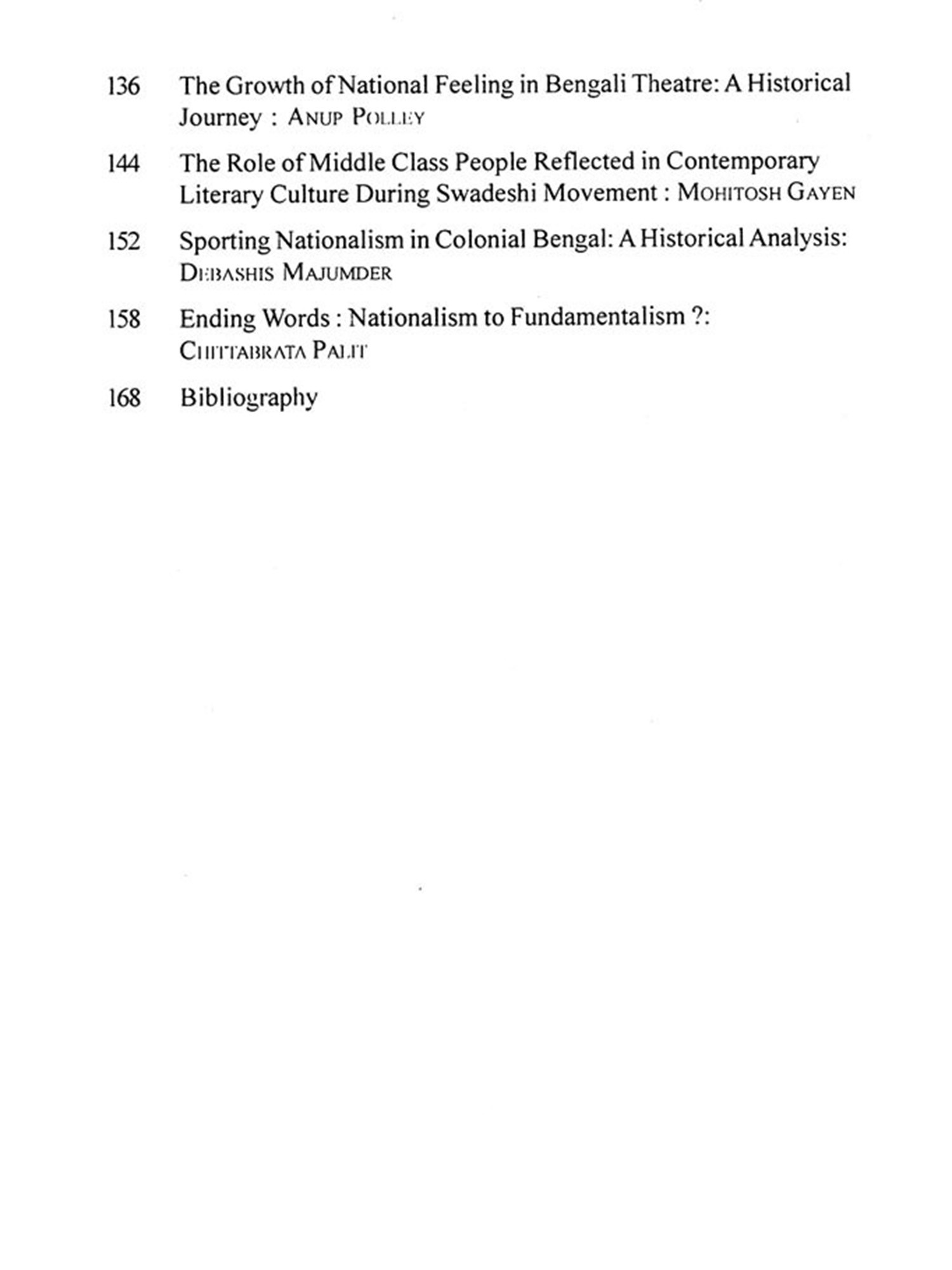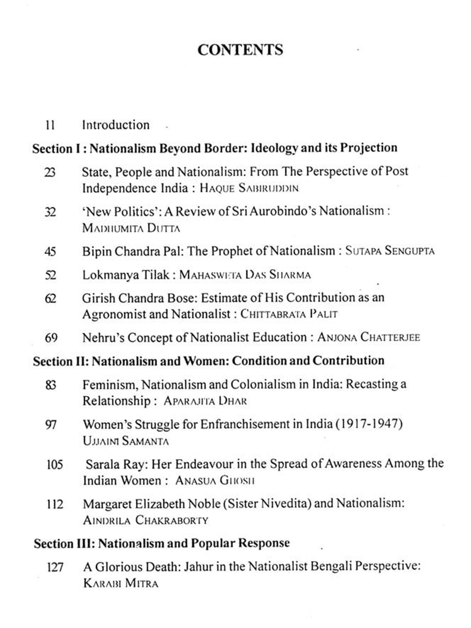 the The first section of this book, 'Nationalism beyond border: Ideology and its projection' focused mainly on consolidation of the nationalist idea and its multi-dimensional projection on education, society agriculture, economy and culture of India. The second section of the book, 'Nationalism and women: Condition and contribution' has attempted to throw light on the contribution made by the womenfolk in different spheres of life from society to polity. The third section of the book has dealt with 'Nationalism and popular response'.