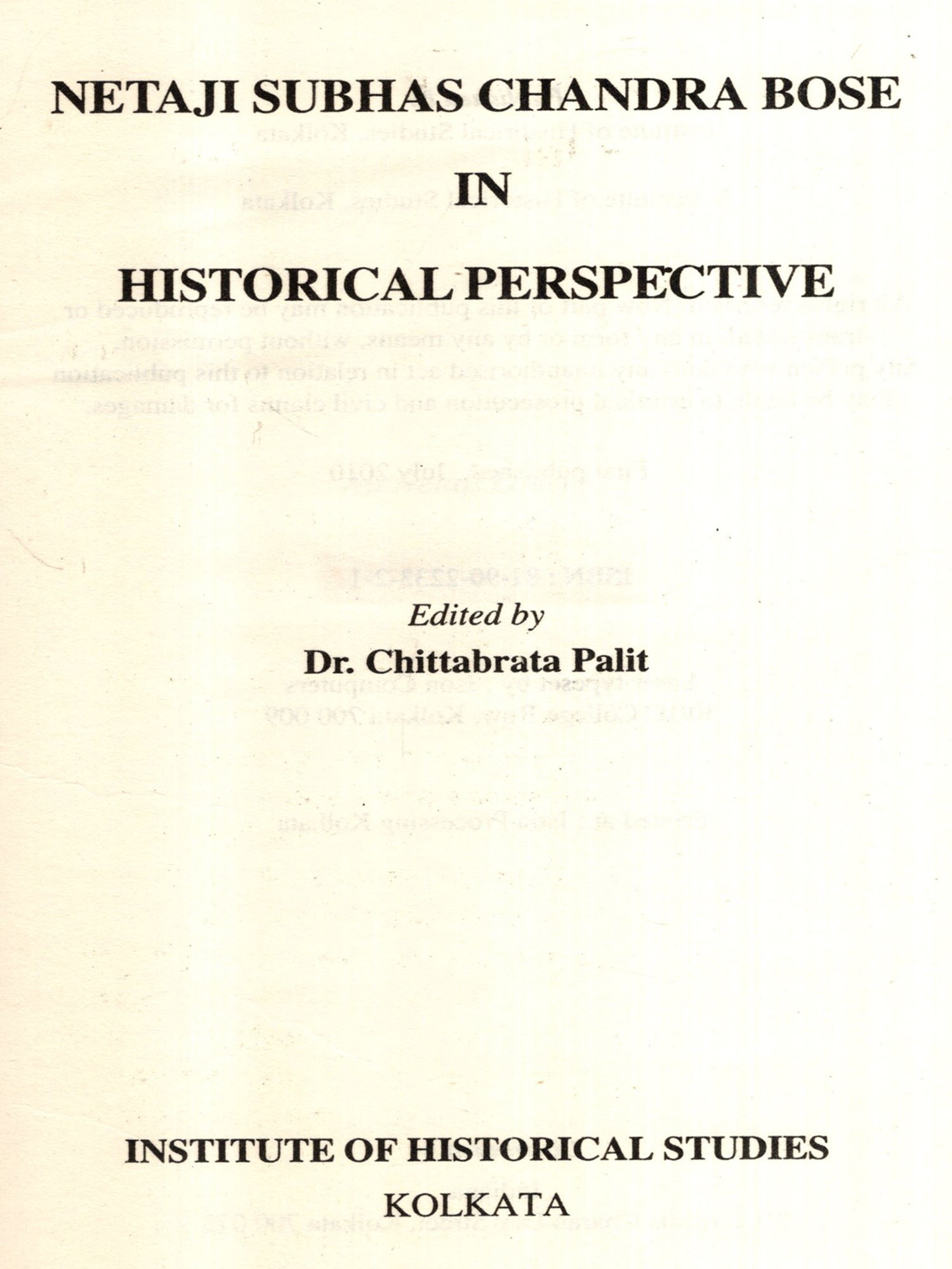 In April 1997, Institute of Historical Studies, Calcutta celebrated the birth centenary of Netaji Subhas Chandra Bose by holding a two day seminar on various aspects of Netaji's personality and work. Altogether twelve papers were published in the first edition written by specialists from various disciplines of social science. On 14th February, 2009 the Institute held another seminar on the life and work of Netaji Subhas Chandra Bose in collaboration with Netaji Bhavana Manch, Kolkata. It also generated ten more papers throwing new light on many other aspects of Netaji's career.