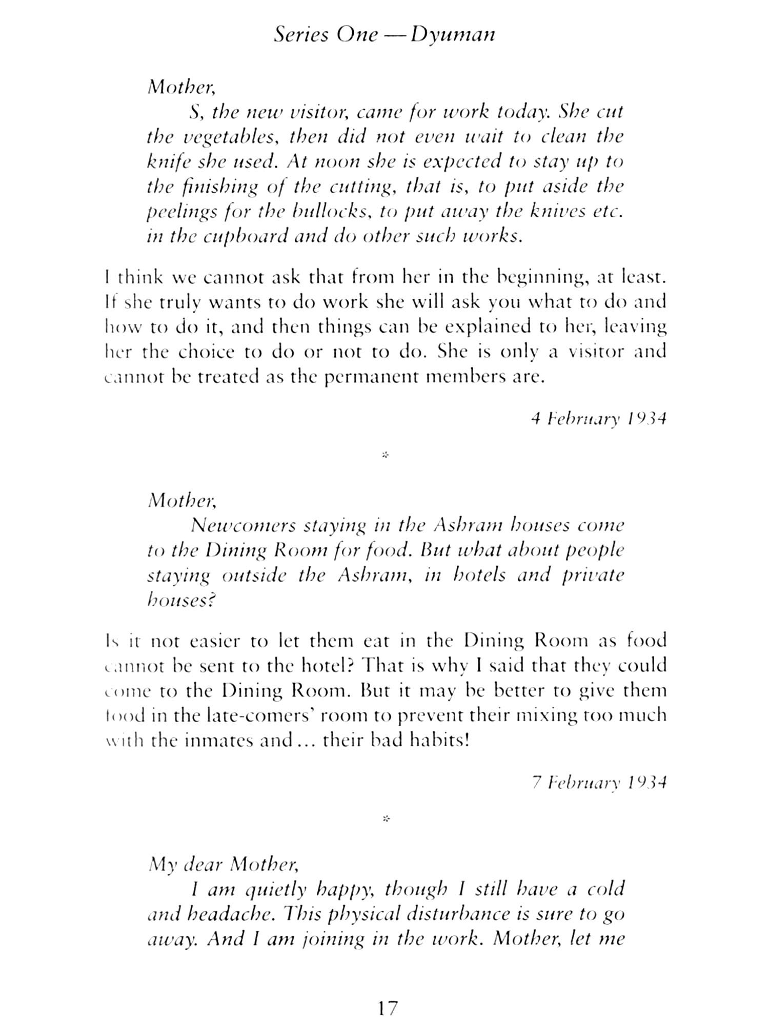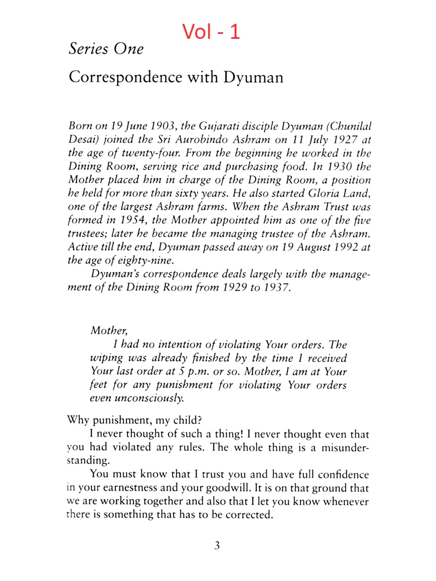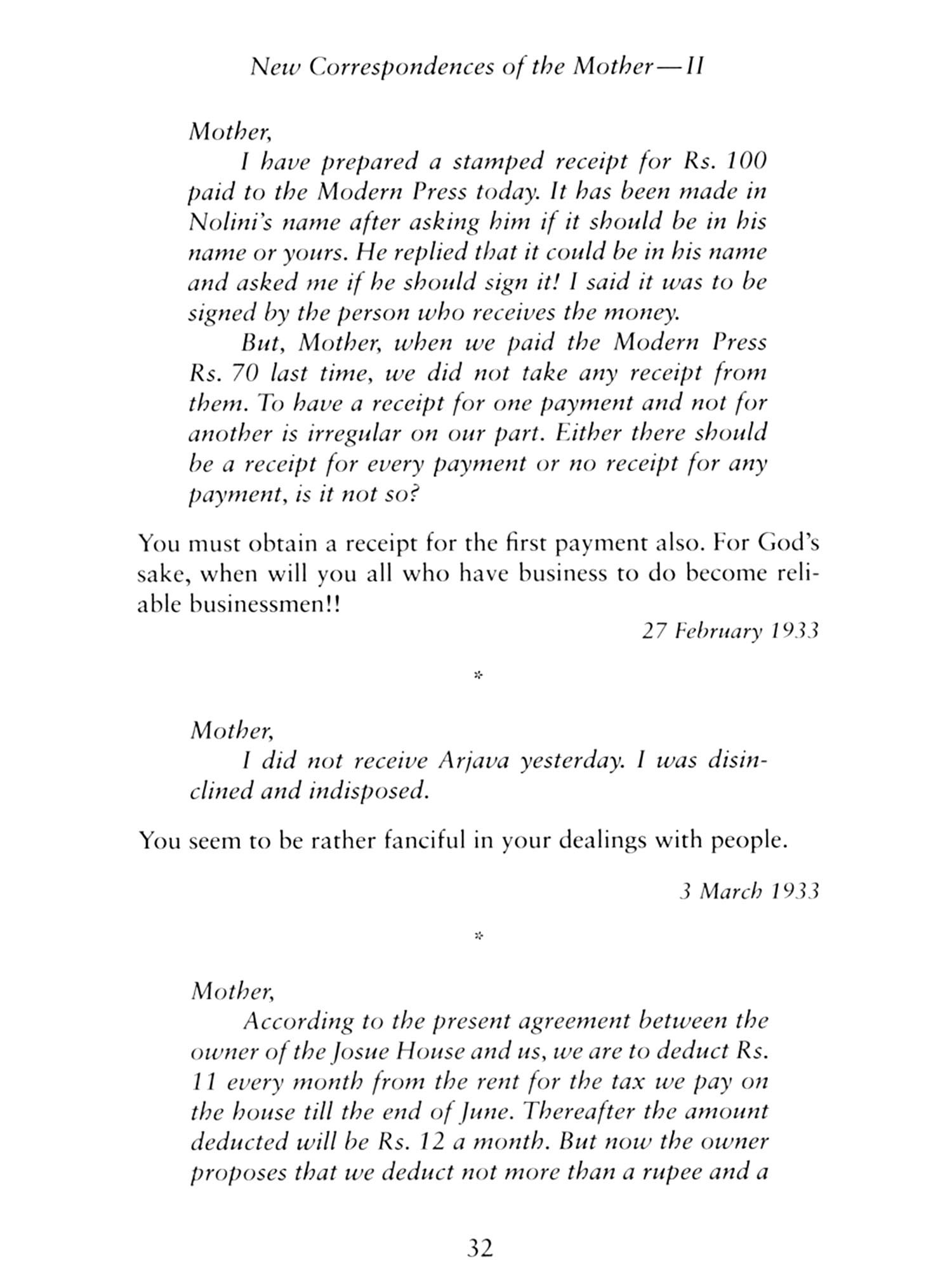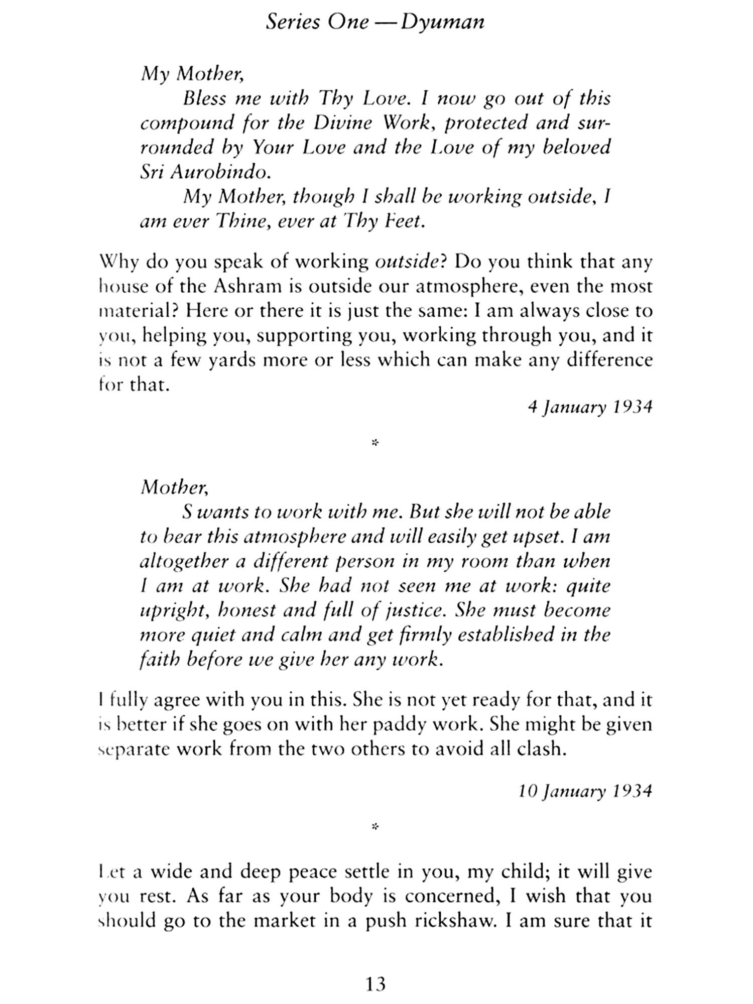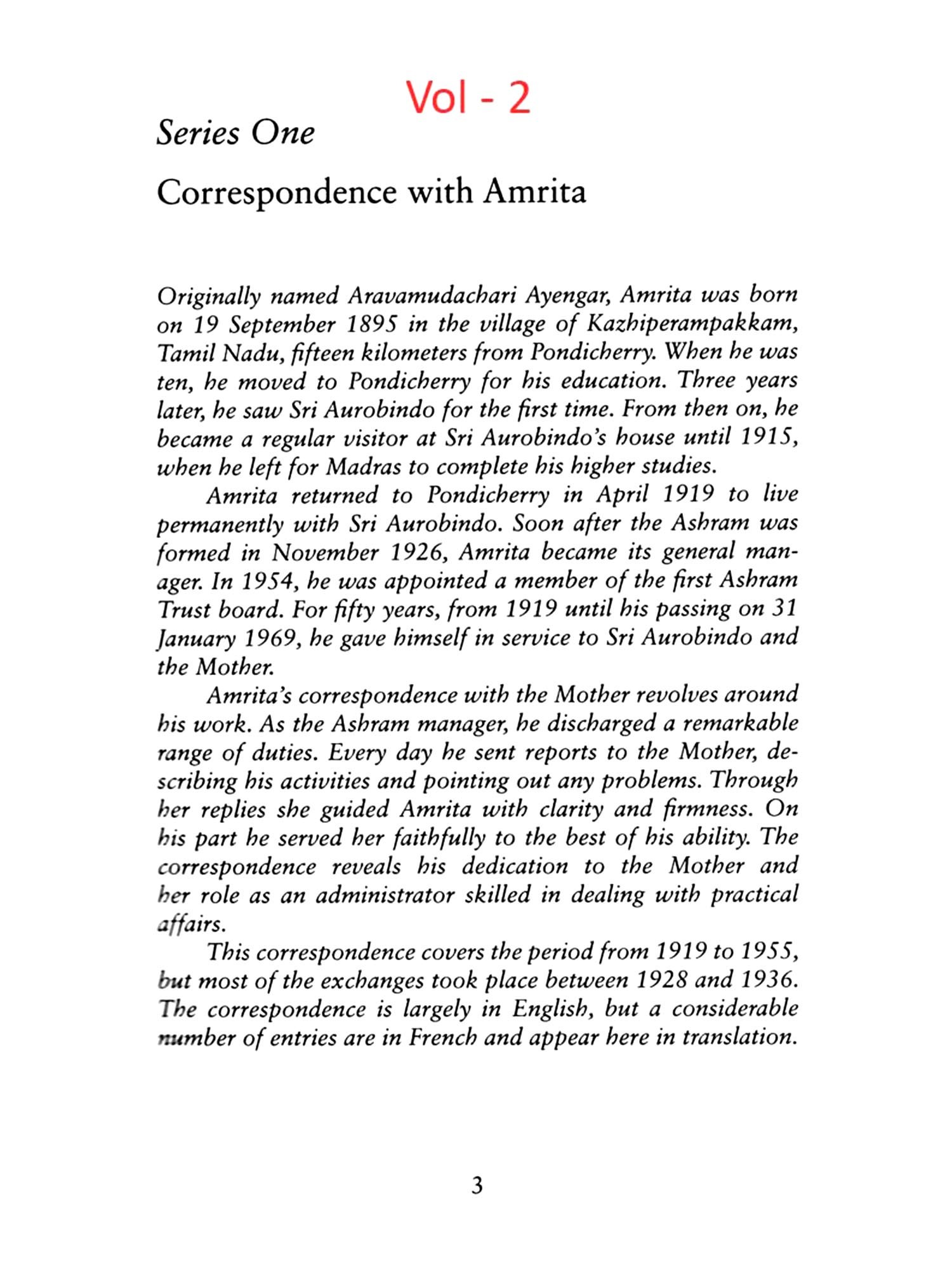 This volume consists of twelve correspondences of the Mother that are not published in her Collected Works. Some correspondences are short, others are long, but each has its own character. With one exception the correspondents were members of the Sri Aurobindo Ashram.
