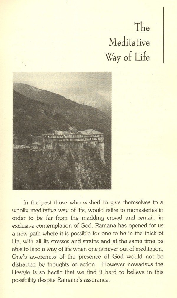 Nowadays life is a mad rush, full of competitive compulsions, thick with media propaganda. In the crosscurrents of these dynamic influences self-enquiry and the understanding of the mind's true nature provides an undercurrent of 'solitude' amidst all this turmoil. Hands are at work but the head is cool, powerful and always aware of the overflowing bliss in the heart. An "unhurried and recollected life" ends the distinction between meditation and action, for one would never be out of the meditative mood.