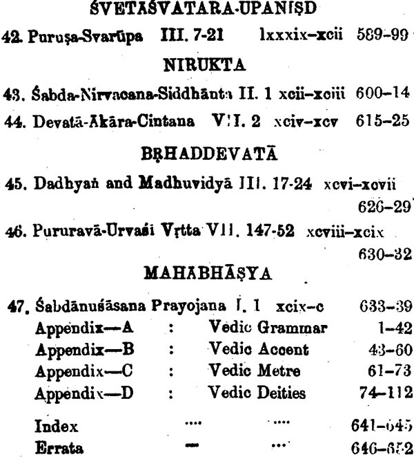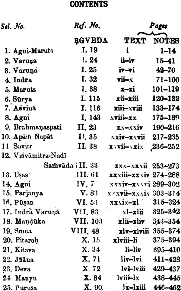 Since The New Vedic Selection contained Vedic Texts prescribed for B.A. as well as for M. A. Classes, it was felt that for the convenience of students the book be published in two parts, separating the relevant portions prescribed for the respective course. The first part included the hymns prescribed for B.A. courses by the Banaras Hindu University but later when the book was under print on the suggestion of Dr Adya Prasad Mishra Professor and Head of the Department of Sanskrit. University of Allahabad, the following hymns covering the courses of B.A. of the Allahabad University were also added: