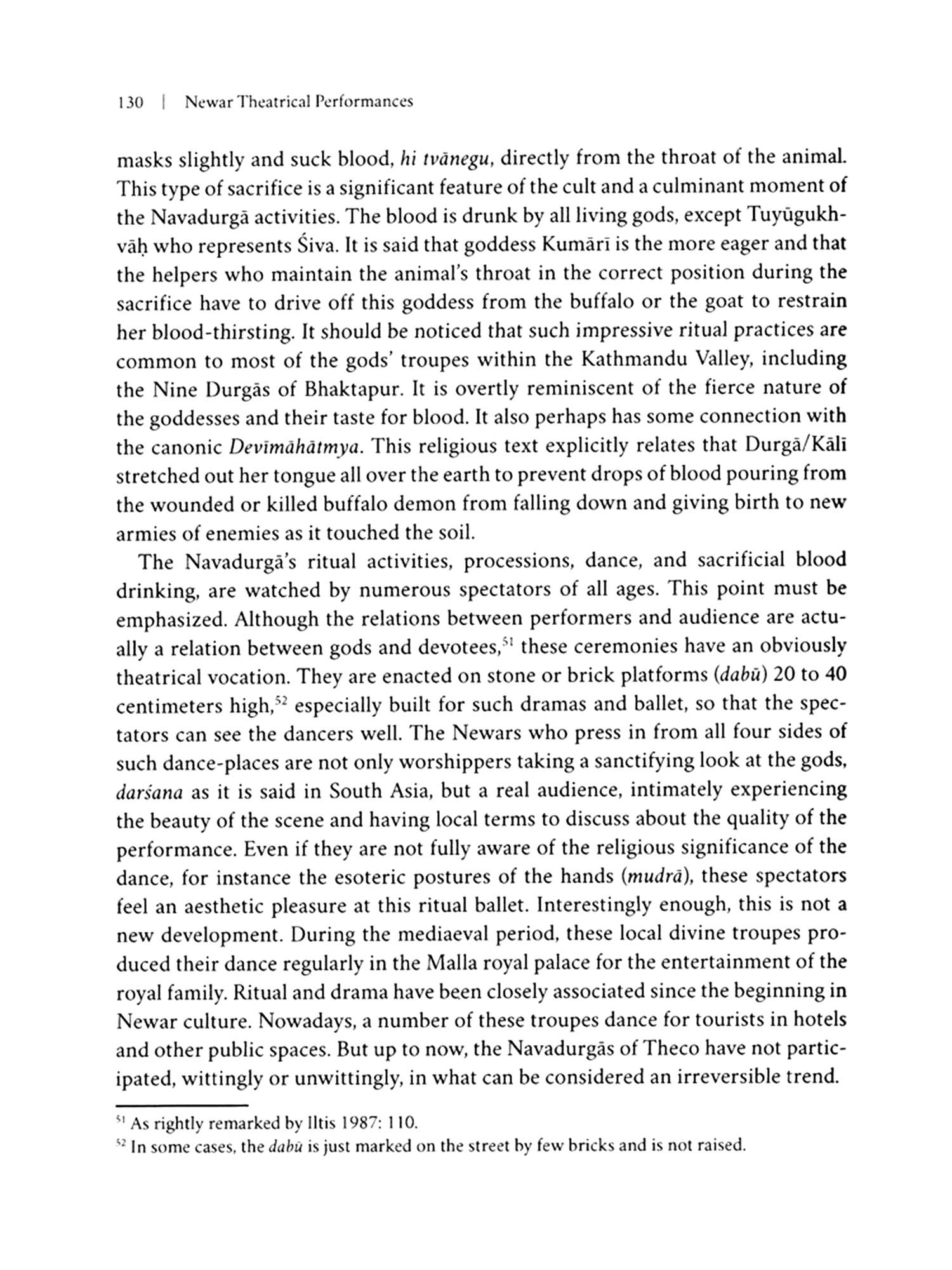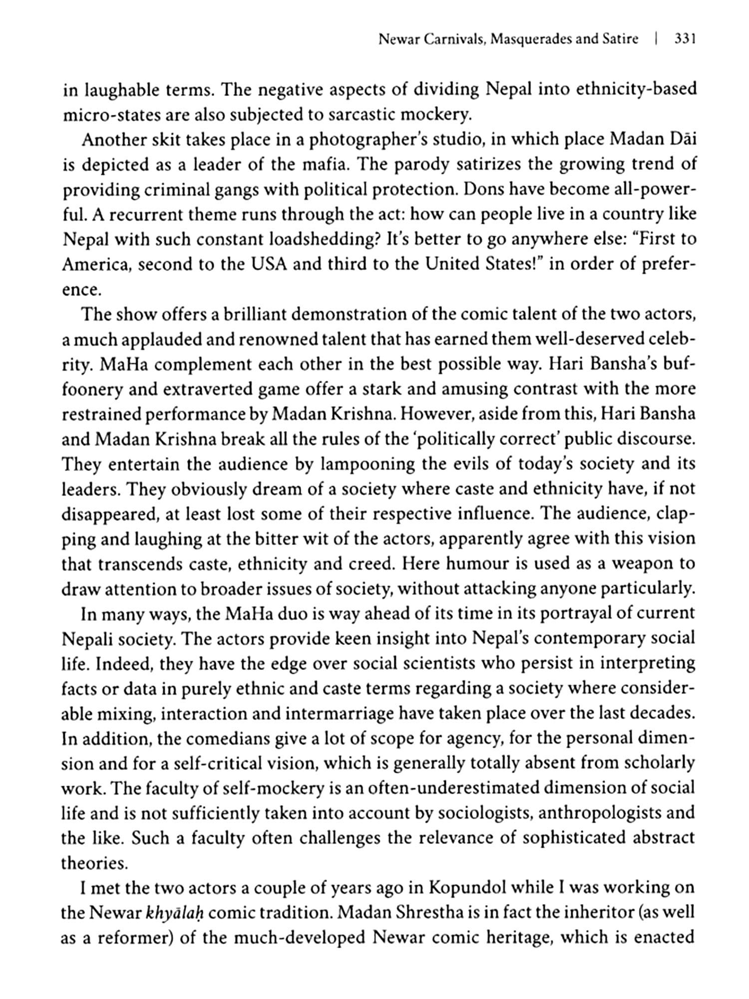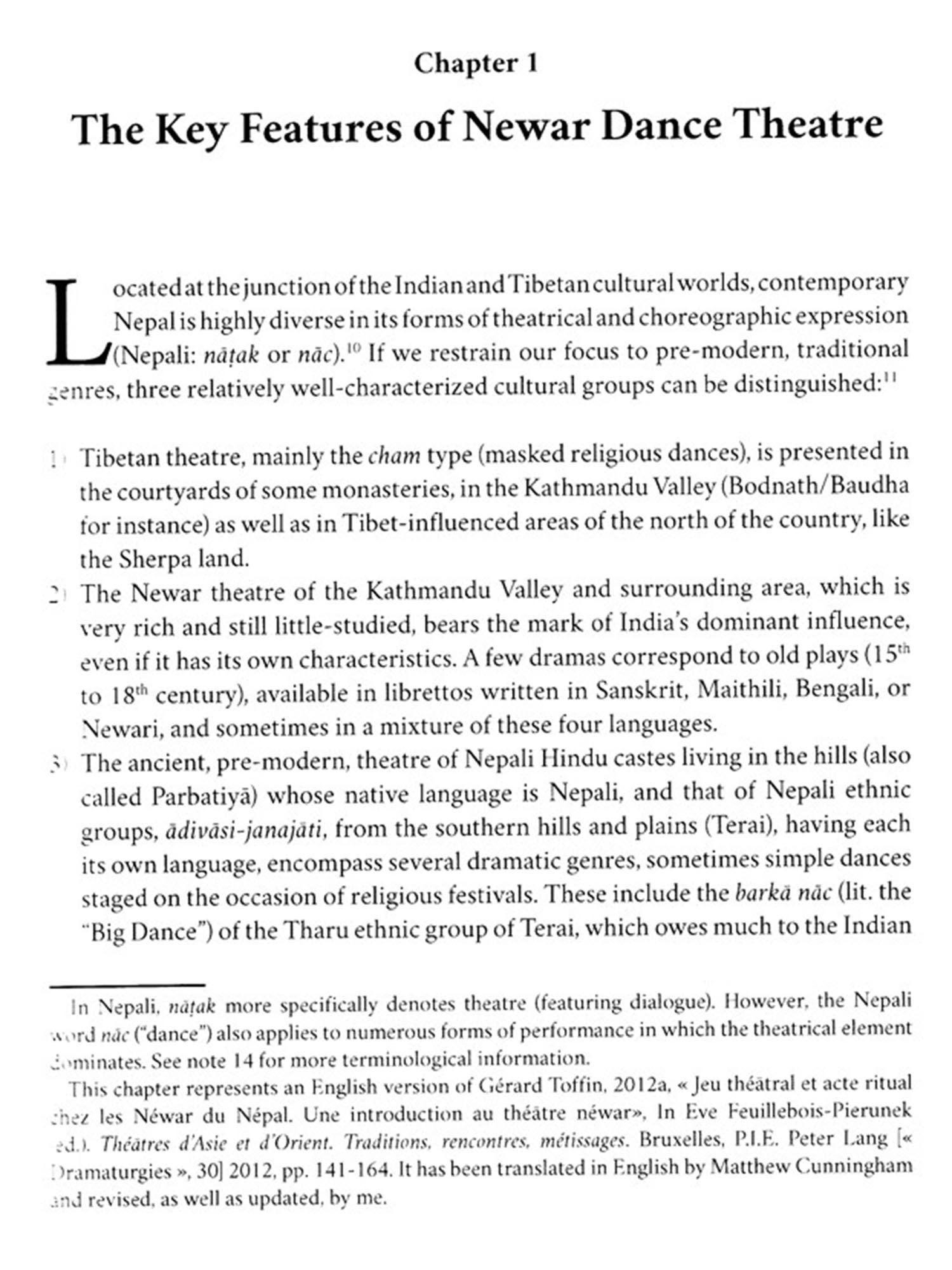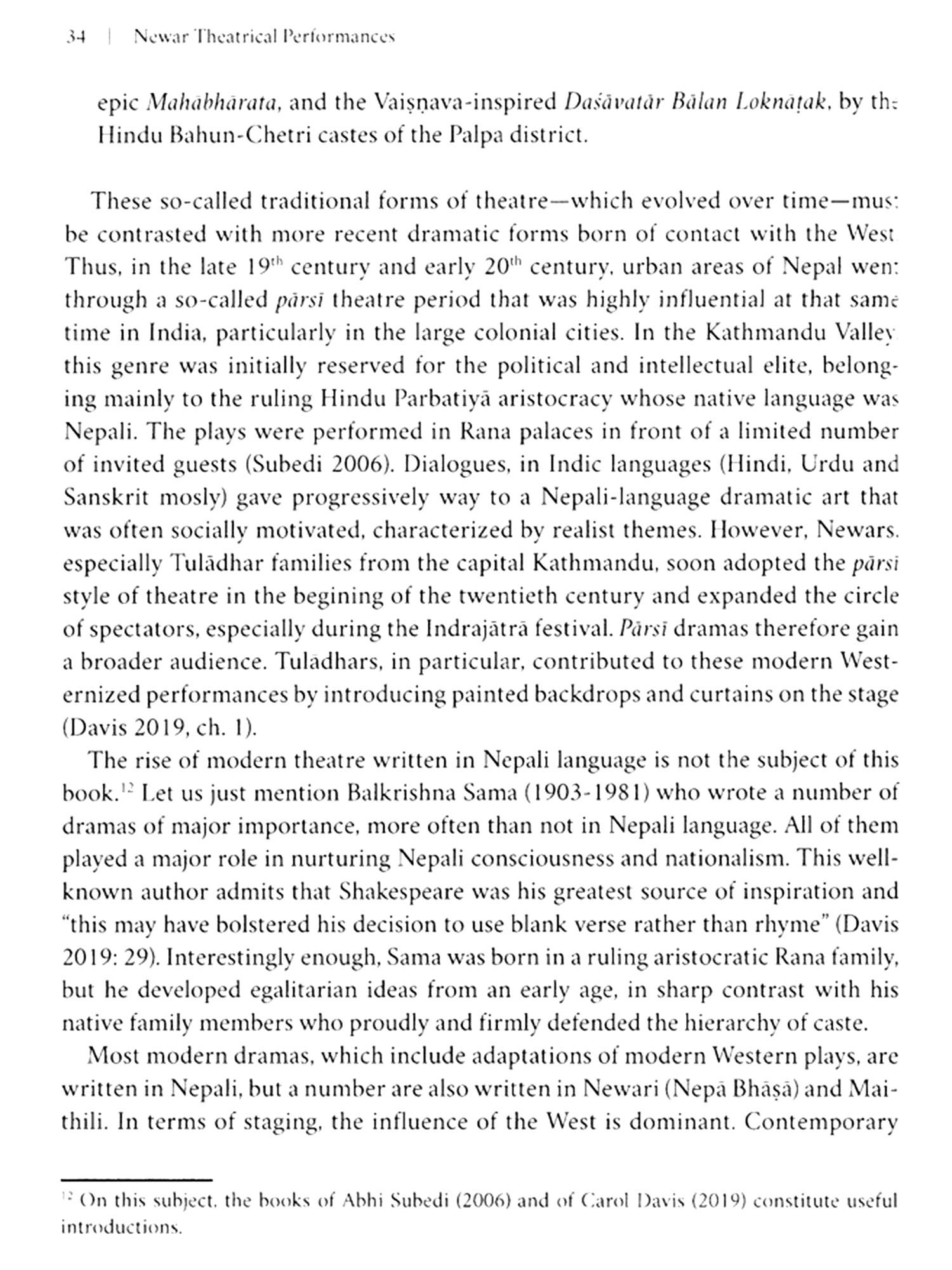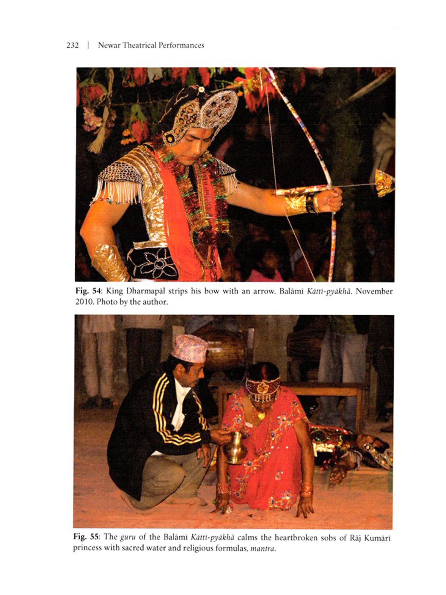 Newar dance theatre belongs to the traditional type of performance. There is limited room for individualism. Reference to the past and to religion dominates. Plays are organized around kinship groups, gender, local territories, and on the ancient caste system. They are governed by premodern rules, they exclude women and rest on a strict hierarchy between the characters, whether divine or royal. In all these topics, they stand in stark contrast to Nepali modern theatre, which is much more concerned with contemporary stakes.