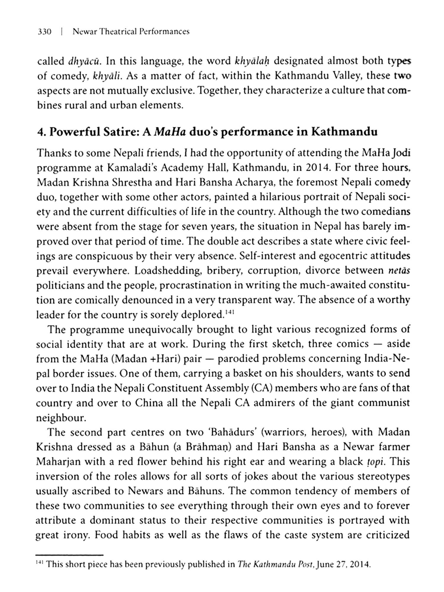 Strikingly enough, this traditional theatre is mainly derived from India but has become fully and genuinely Newarized over the centuries. It gives preference to mythological themes, divine or royal intrigues, far from the daily realities of the people. The performances favor dance, music, stylized gestures, and very rarely includes dialogues. They are fundamentally non-realistic, save, notably, for satirical and comical plays which play a crucial role.