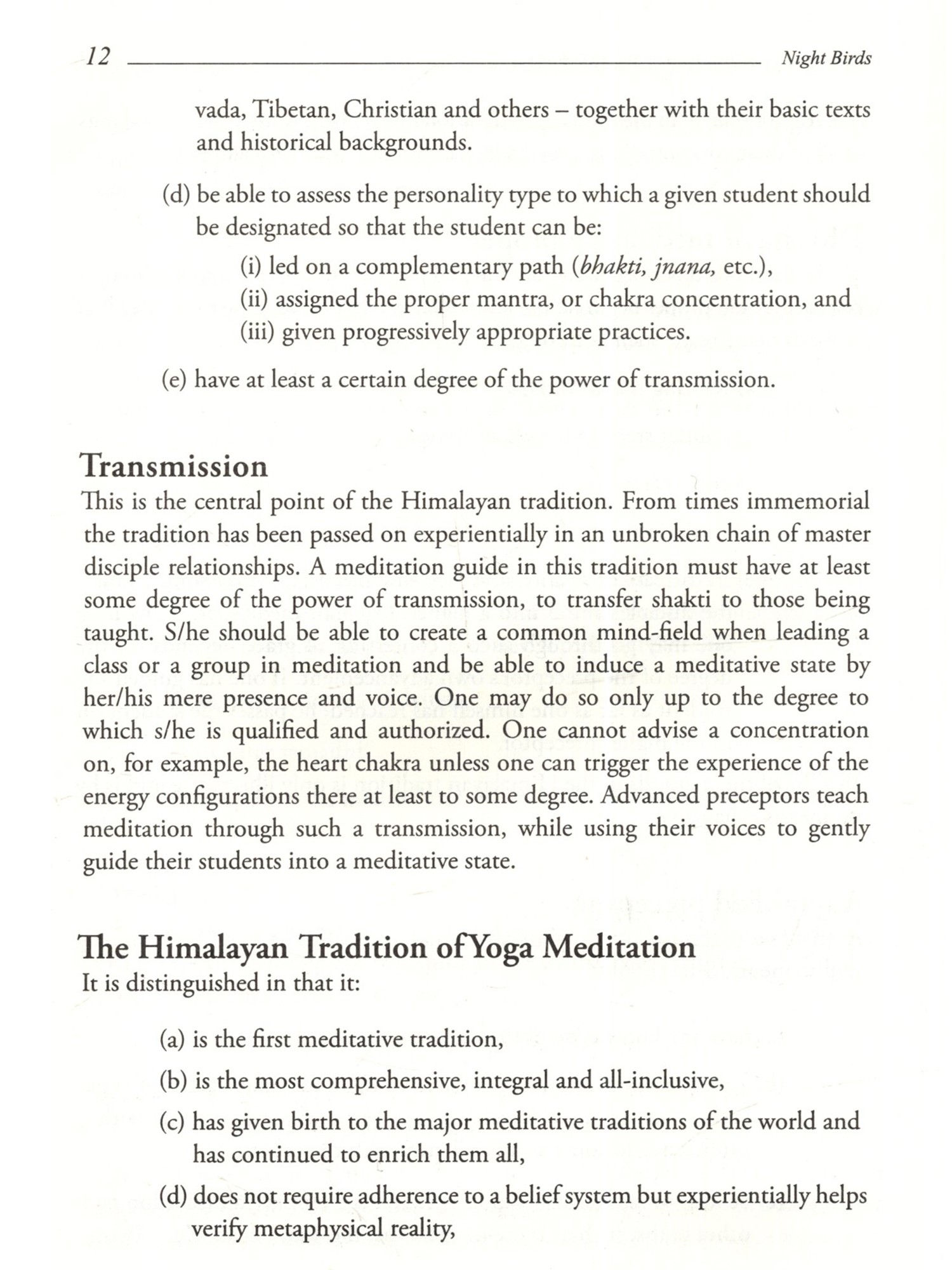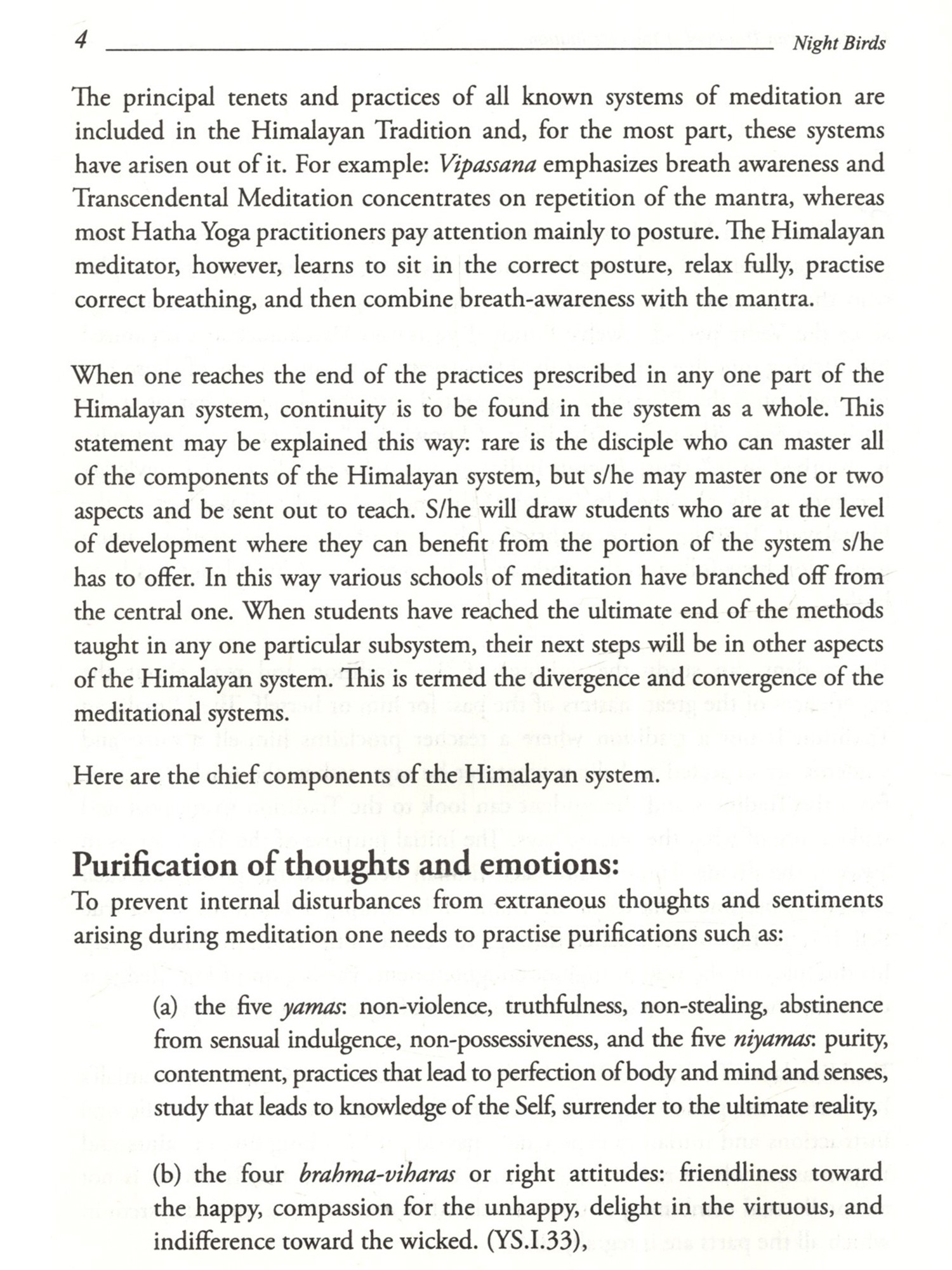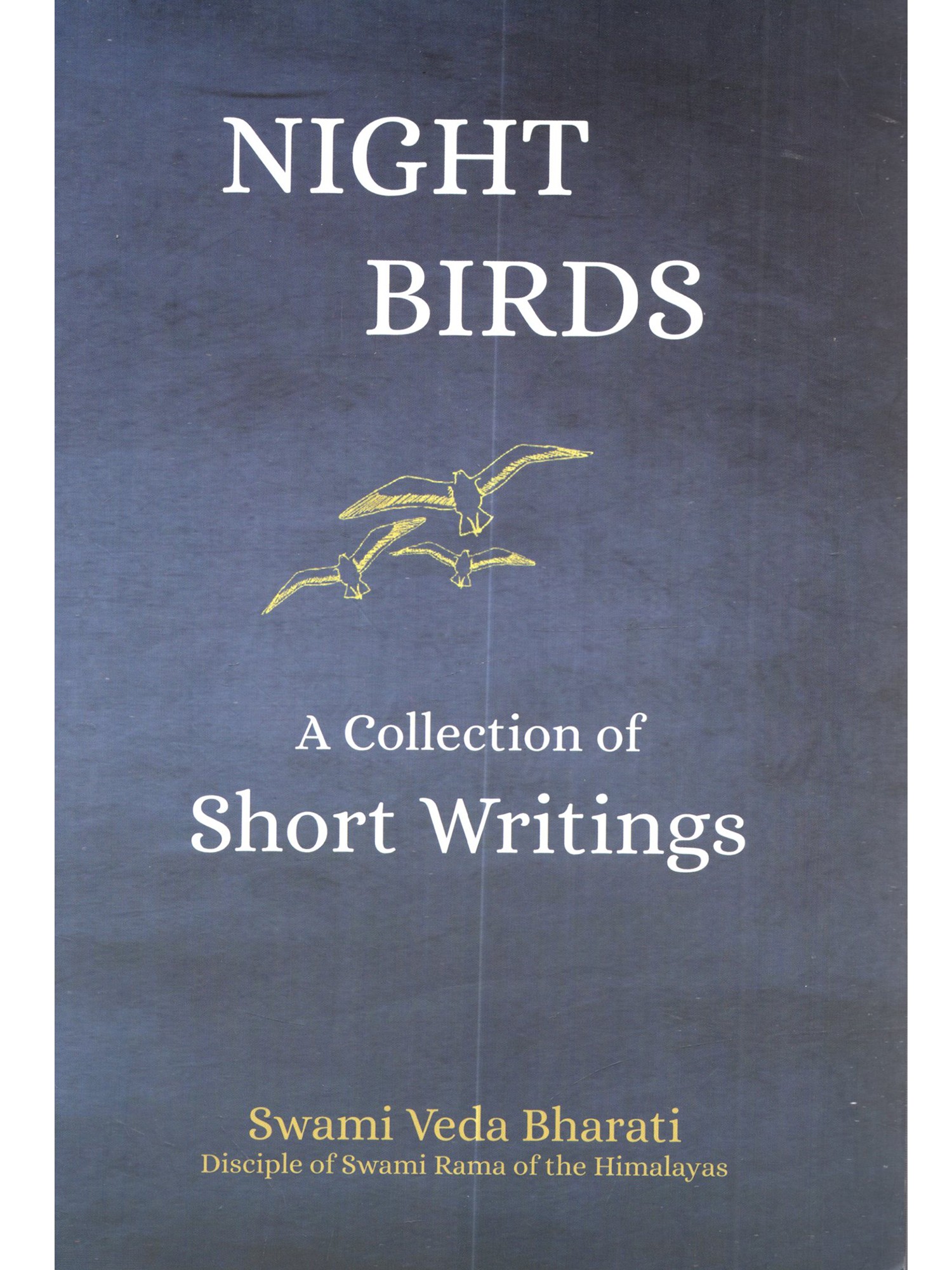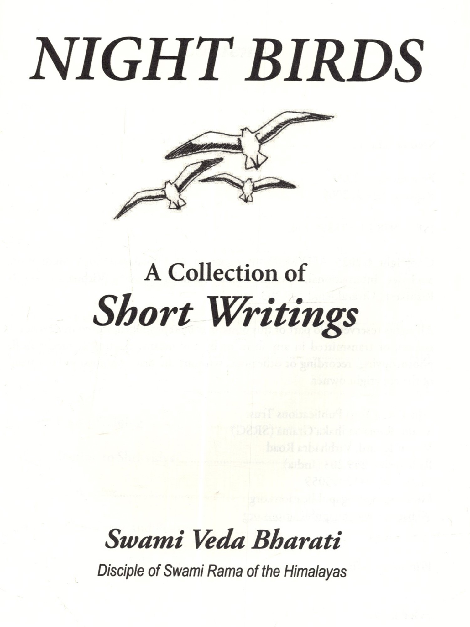Night Birds The birds that fly in the night can see through the dark. Such is the nature of the inspirations that appear by the night. It is the night through which others sleep but the Yogi's mind remains awake. Our Master, Swami Rama of the Himalayas, dictared all his works at night. In his Love Whispers, to the question, What do you do? He answers, 'I gather blossoms dropped by the night.' Ar night a sadhaka's deeper mind is wide awake. Sometimes, in a tired body, the shallows of the mind may fall asleep, yet the depths remain engaged in exploring the treasures within. Soon the treasures, like the cream from milk being churned, rise to the surface, emerge into the shallows to become words. It is the nature of truth, the revelation is beyond thought. After it appears in the inner surface of buddhi, it seeks a garment wherewith to clothe itself, and finds the robe called the thought. The thought emerges and finds for itself the robe called the word. The word wears the garment called sound. Thus the revelations reach the listener and the reader thrice enrobed, camouflaged. To reach the essence of revelation one must doff the sound and come to the word; must divest the word and reach the thought; must drop the thought and reach the revelation. The thoughtless, wordless, soundless are the truth that are shown to the sadhaka at night. Even through the tired body, one awakens one's shallows to work. Whether one has a feather pen or a computer at hand, the "moving finger writes" as said the Sufi Omar, the son of Khayyam the tentmaker. One must become the child of a shelter-giver to be qualified to fly with these night birds, to fully inhale the fragrance of these blossoms dropped by the night, to savour the feasts that God serves to his disciple all the night through. The free-winged birds of revelation that can see through the dark, fly only in that night whose other name is Dawn in the Hymn to the Night in the Rig-veda. Here, then, I, son of a Master Shelter-giver, offer you the breezes blown by the flutter of the wings of the night birds; sounds, words, thoughts. Short ones. There is not time at present to record the long works that appear; they are etched in memory to come forth to you later. There is not time now. Nor resources to print. Nor a printing press. No funding. This collection comes to you in a limited edition as a delicate bouquet of the tiniest blossoms. Please accept these incompletes. Some day they will complete themselves. These are but faint echoes of what is sent forth from the Masters. For the original, go direct to the Master's writings. May the night birds fly through your mind also and wake you up from sleep each night to the display of the treasures of the Himalayan wisdom. May your deeper mind never sleep again. Invoking upon you the blessings and grace of the Himalayan Masters, Swami Veda Bharati Disciple of Swami Rama of the Himalayas.