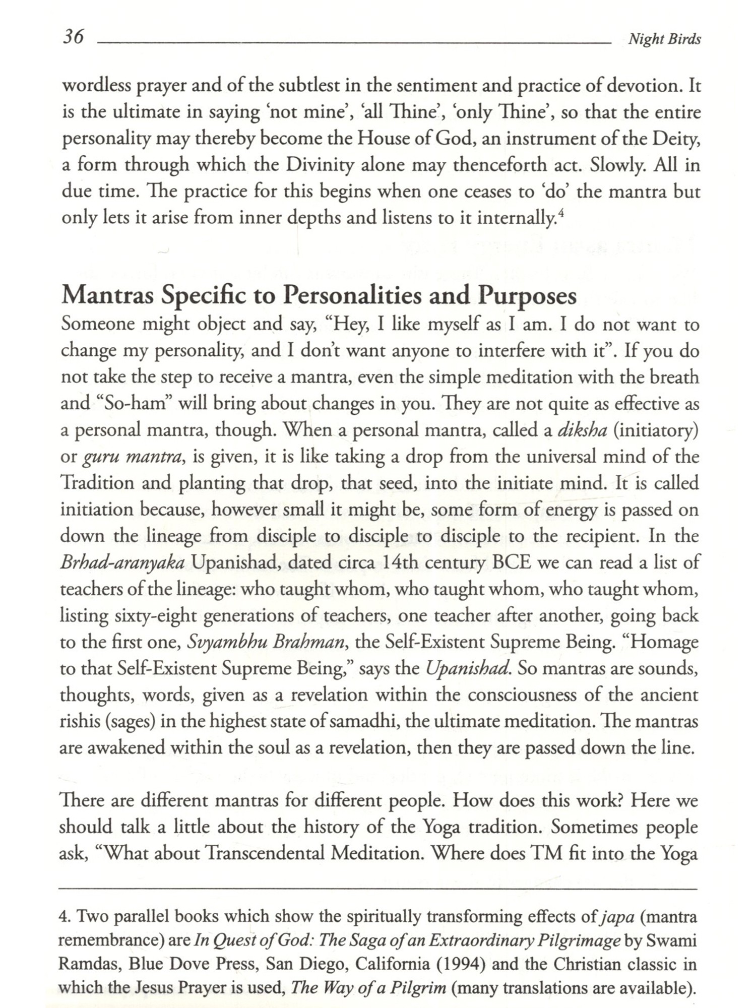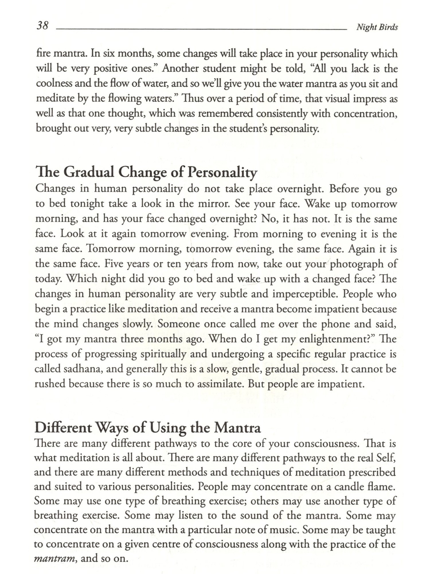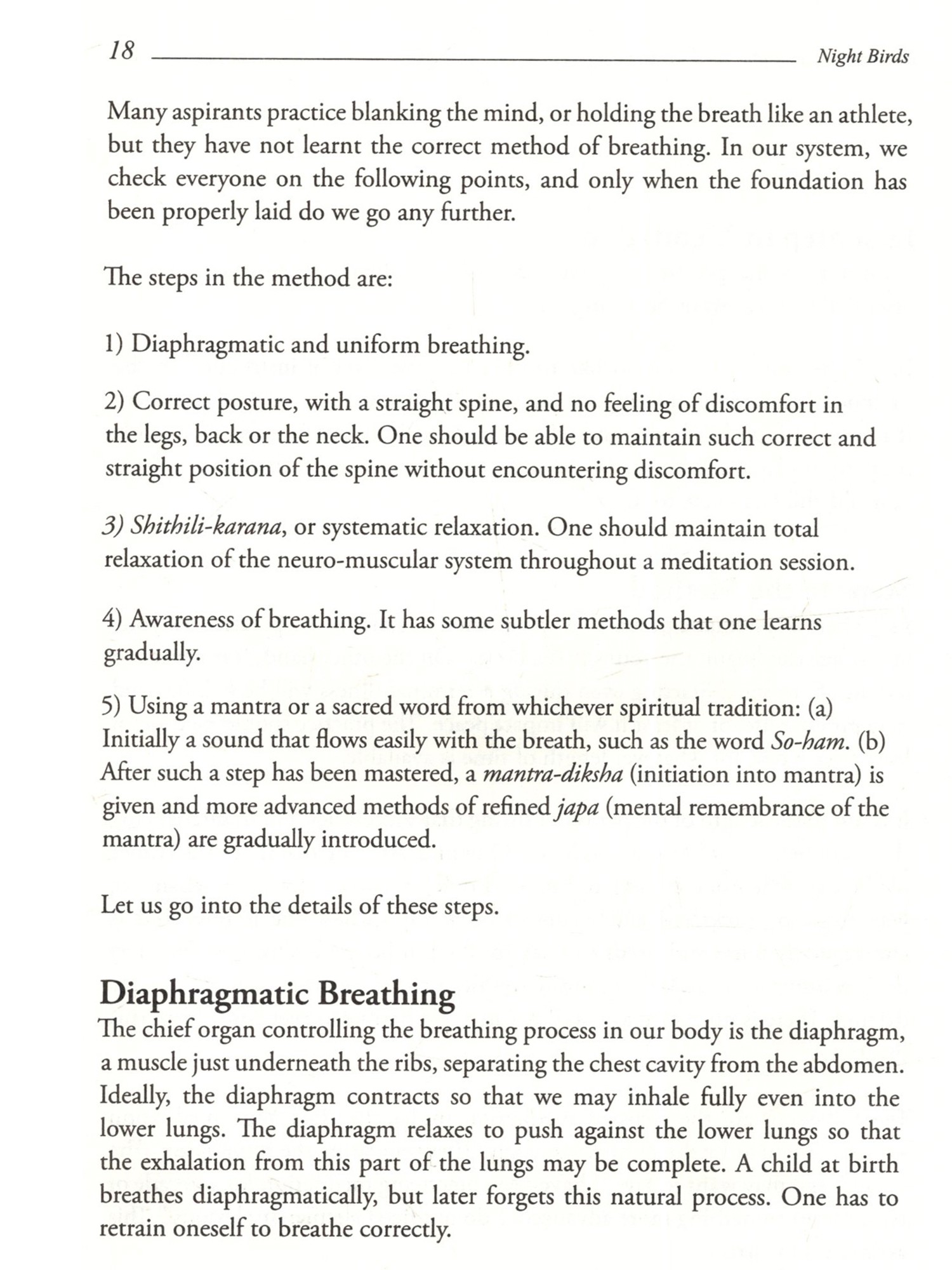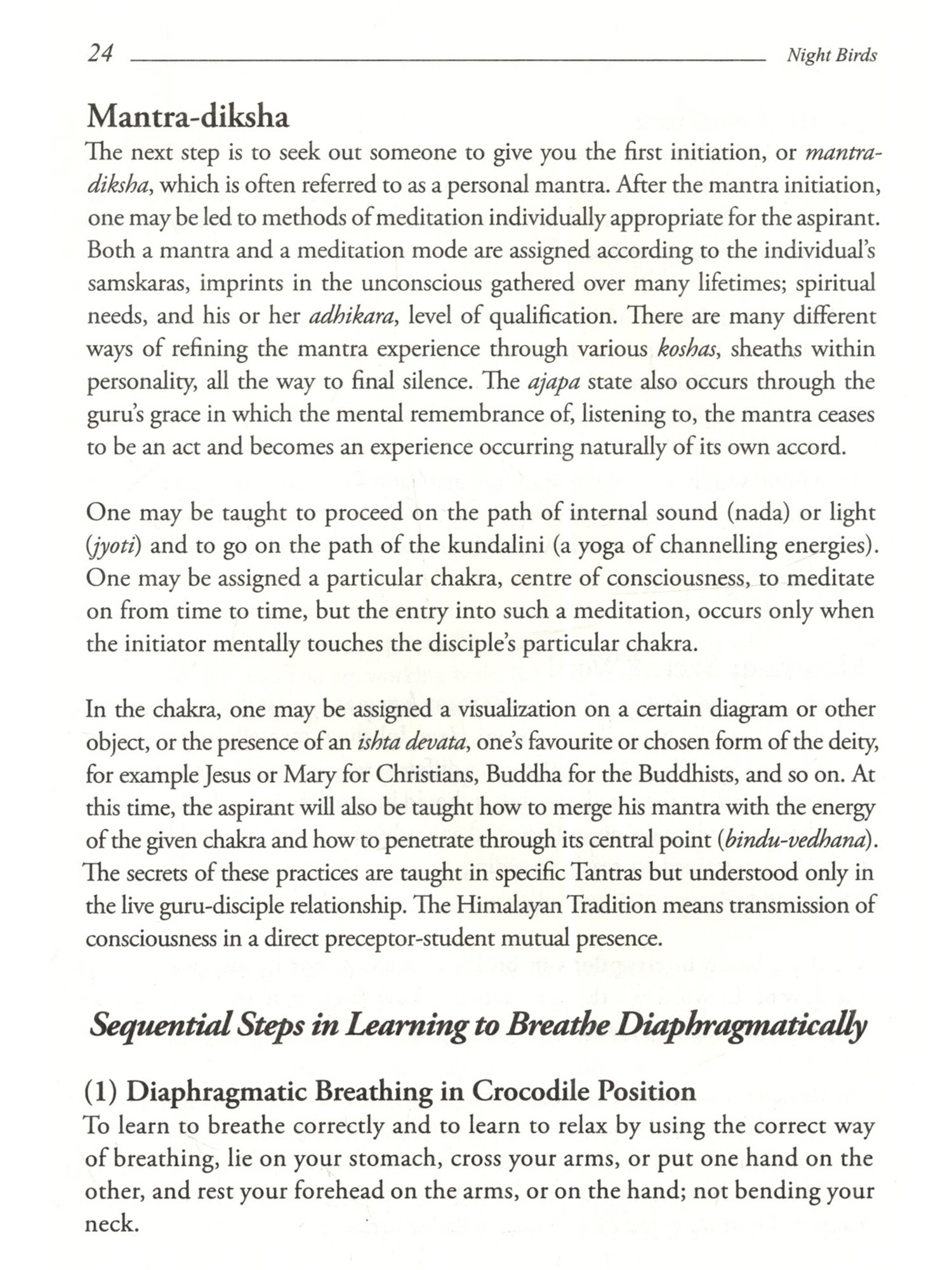 Night Birds The birds that fly in the night can see through the dark. Such is the nature of the inspirations that appear by the night. It is the night through which others sleep but the Yogi's mind remains awake. Our Master, Swami Rama of the Himalayas, dictared all his works at night. In his Love Whispers, to the question, What do you do? He answers, 'I gather blossoms dropped by the night.' Ar night a sadhaka's deeper mind is wide awake. Sometimes, in a tired body, the shallows of the mind may fall asleep, yet the depths remain engaged in exploring the treasures within. Soon the treasures, like the cream from milk being churned, rise to the surface, emerge into the shallows to become words. It is the nature of truth, the revelation is beyond thought. After it appears in the inner surface of buddhi, it seeks a garment wherewith to clothe itself, and finds the robe called the thought. The thought emerges and finds for itself the robe called the word. The word wears the garment called sound. Thus the revelations reach the listener and the reader thrice enrobed, camouflaged. To reach the essence of revelation one must doff the sound and come to the word; must divest the word and reach the thought; must drop the thought and reach the revelation. The thoughtless, wordless, soundless are the truth that are shown to the sadhaka at night. Even through the tired body, one awakens one's shallows to work. Whether one has a feather pen or a computer at hand, the "moving finger writes" as said the Sufi Omar, the son of Khayyam the tentmaker. One must become the child of a shelter-giver to be qualified to fly with these night birds, to fully inhale the fragrance of these blossoms dropped by the night, to savour the feasts that God serves to his disciple all the night through. The free-winged birds of revelation that can see through the dark, fly only in that night whose other name is Dawn in the Hymn to the Night in the Rig-veda. Here, then, I, son of a Master Shelter-giver, offer you the breezes blown by the flutter of the wings of the night birds; sounds, words, thoughts. Short ones. There is not time at present to record the long works that appear; they are etched in memory to come forth to you later. There is not time now. Nor resources to print. Nor a printing press. No funding. This collection comes to you in a limited edition as a delicate bouquet of the tiniest blossoms. Please accept these incompletes. Some day they will complete themselves. These are but faint echoes of what is sent forth from the Masters. For the original, go direct to the Master's writings. May the night birds fly through your mind also and wake you up from sleep each night to the display of the treasures of the Himalayan wisdom. May your deeper mind never sleep again. Invoking upon you the blessings and grace of the Himalayan Masters, Swami Veda Bharati Disciple of Swami Rama of the Himalayas.