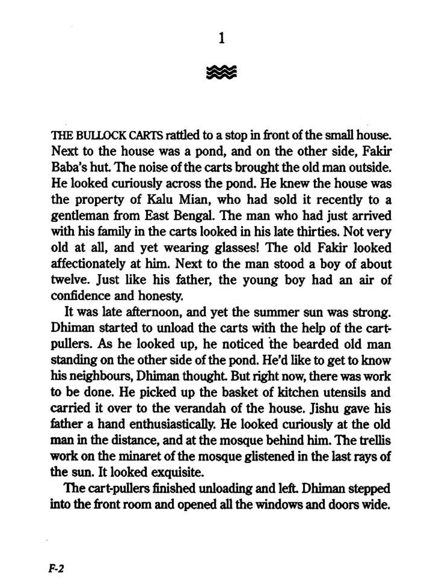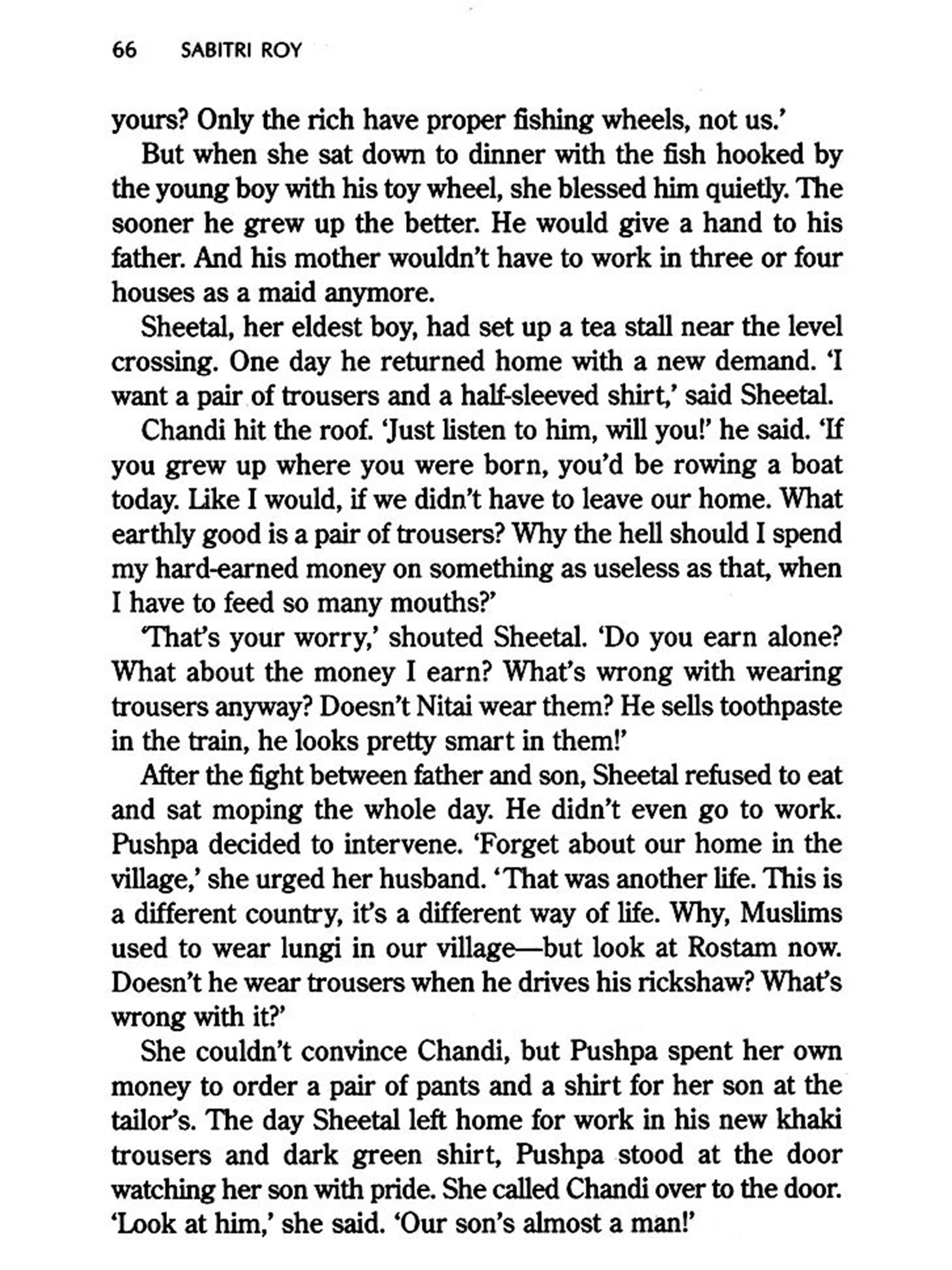 As the family settles down and strikes roots, they develop relations of respectful intimacy with local Muslim residents who receive them with warm hospitality. The family network expands as an Algerian student joins their circle with tidings from their war of independence, as Seemanta, a neighbour, works together with Dhiman, and as local unemployed and deeply frustrated youths-Bandhan and Sagar-find release and meaning in Party work. The maid who serves the family expands its horizon in a different way. She narrates the raw experiences of subaltern refugees, who clear jungles and face wild boars in order to construct their meagre hutments.