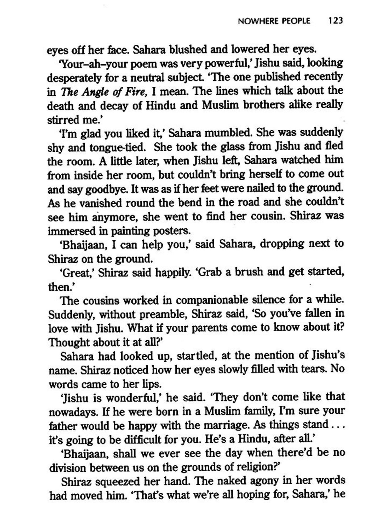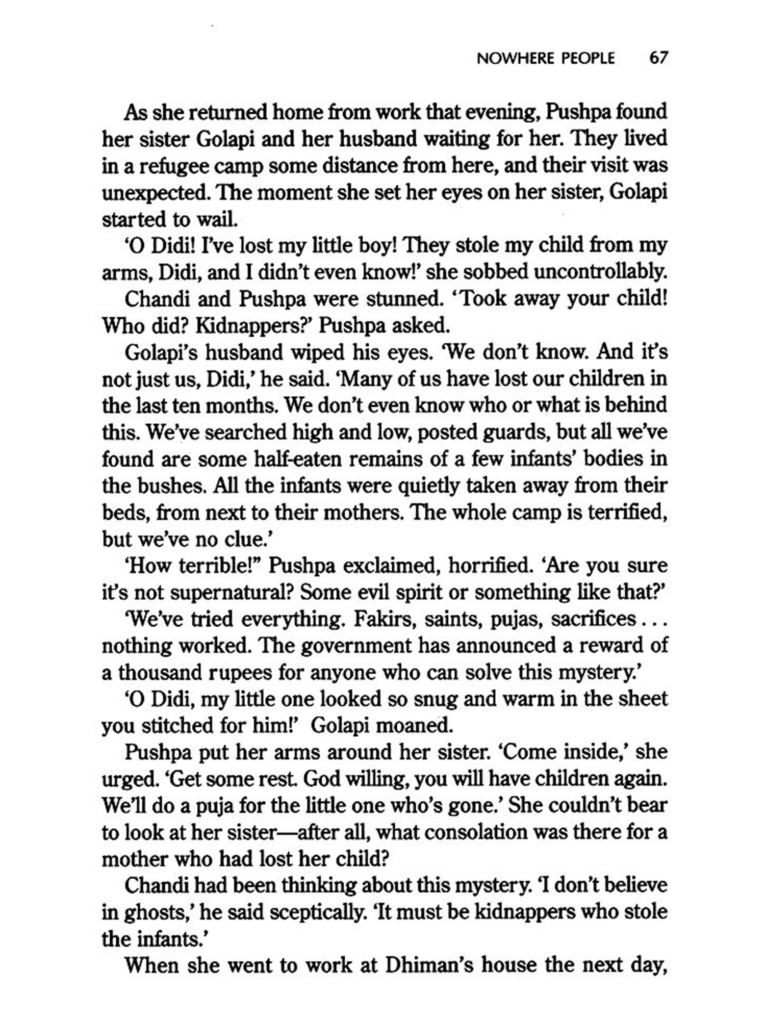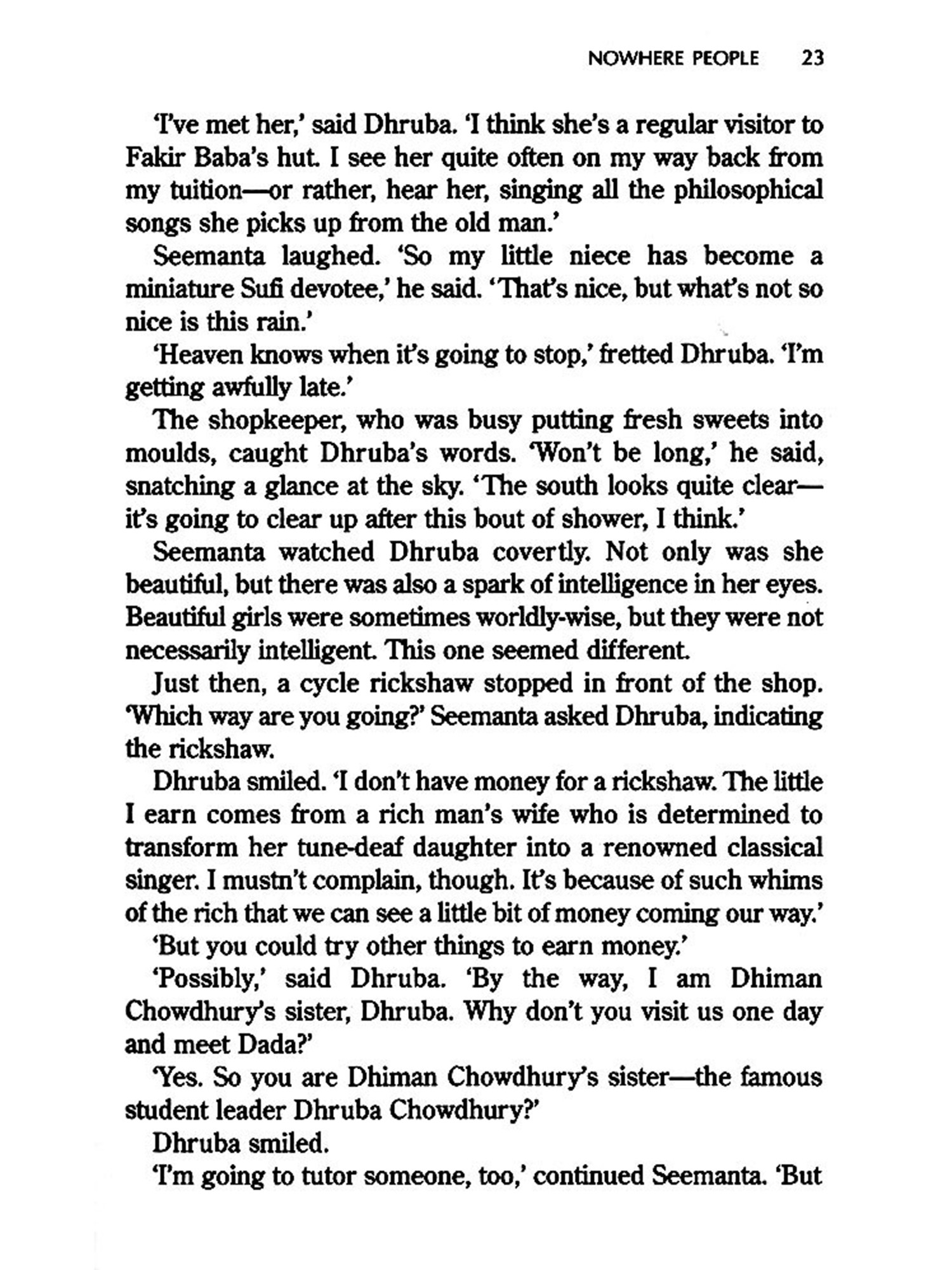 The Bangla name of Nowhere People is Badwip which literally means an estuary. The novel is, indeed, constructed like a piece of land, cast adrift among unruly waters. It begins with terrorized Hindus uprooted from East Pakistan in the early 1950s. They build up a refugee colony on the southern suburbs of Calcutta, with little support from the government. The heart of the novel is a communist family: Dhiman, a teacher-activist, Khana, his artist wife who has abandoned her art in their new shrunken circumstances, and their young son, Jishu, increasingly drawn to his parent's worldview. High-spirited young Dhruba is Dhiman's sister and a Party activist.