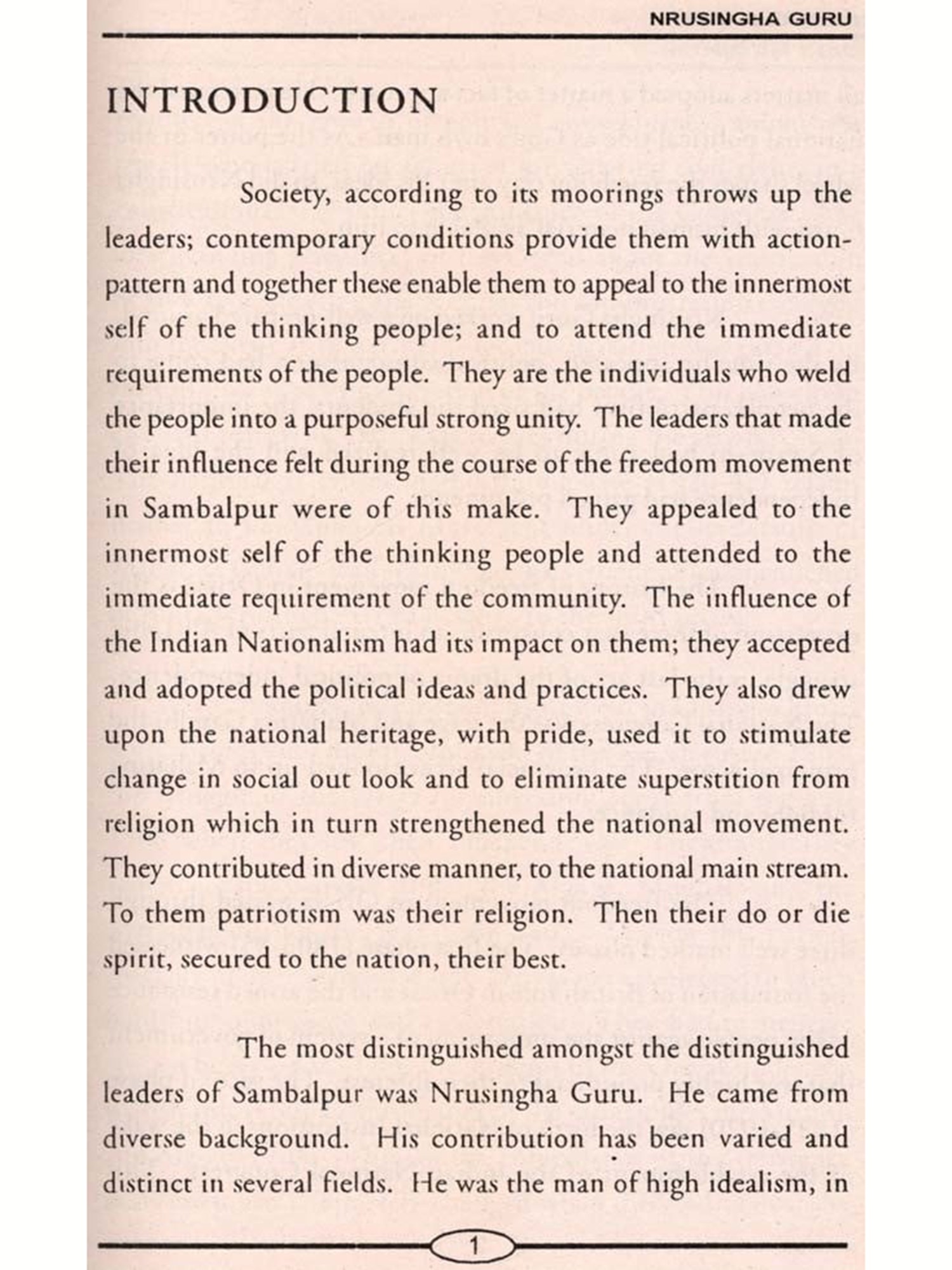 This handy volume Nrusingha Guru is a portrayal concise and clear of the role the commanding personality played in the struggle for National Independence. It presents also his ideas on the socio-political system and on the National order. The reader is introduced directly to the contributions, rich and direct, in the particular field. The presentation has not been wedged by unnecessary details, descriptions and comments. The effort has been to pick up the grain without getting lost in the chaff. Observations emphasizing particular aspects have been of course made here and there.