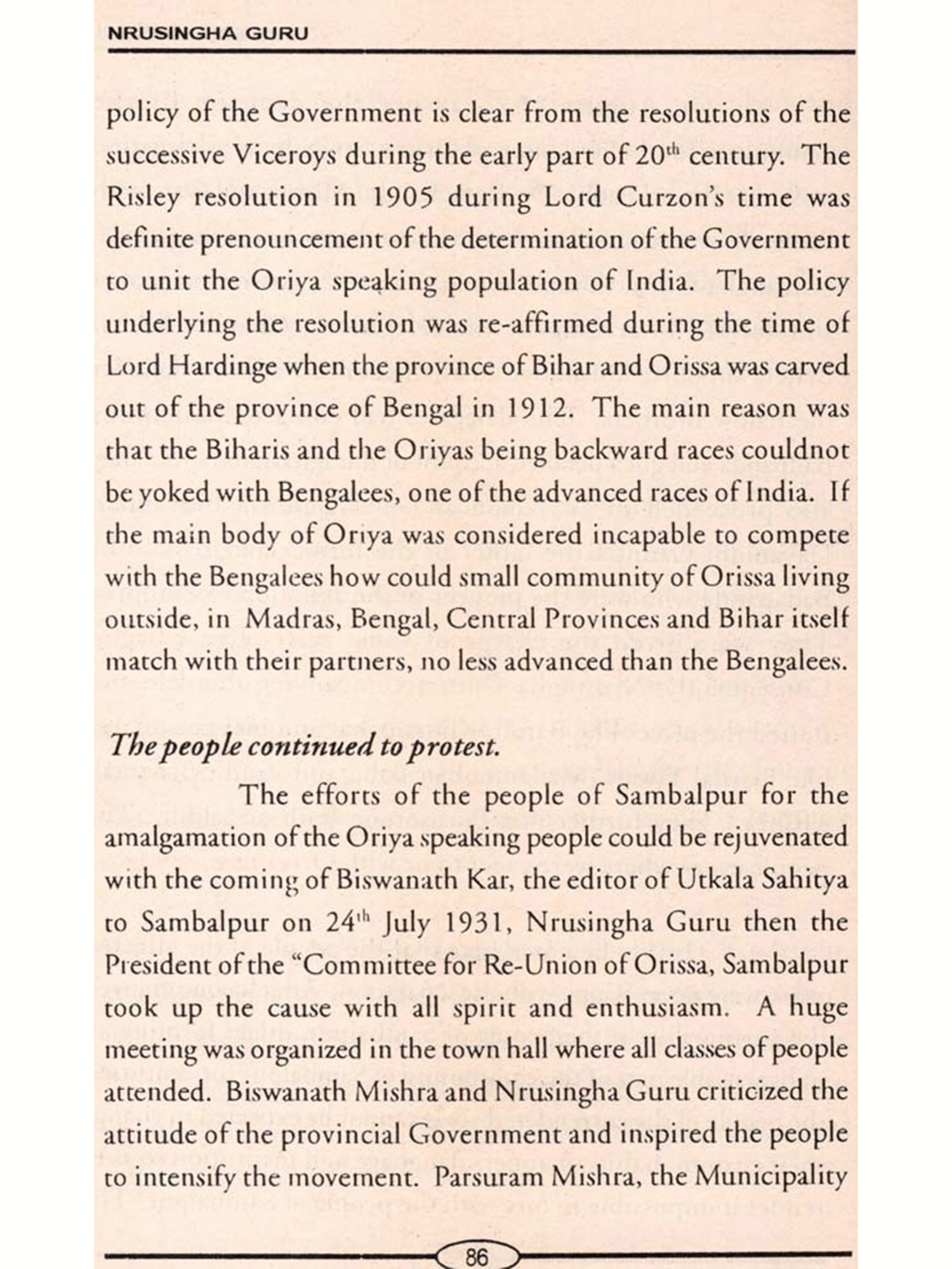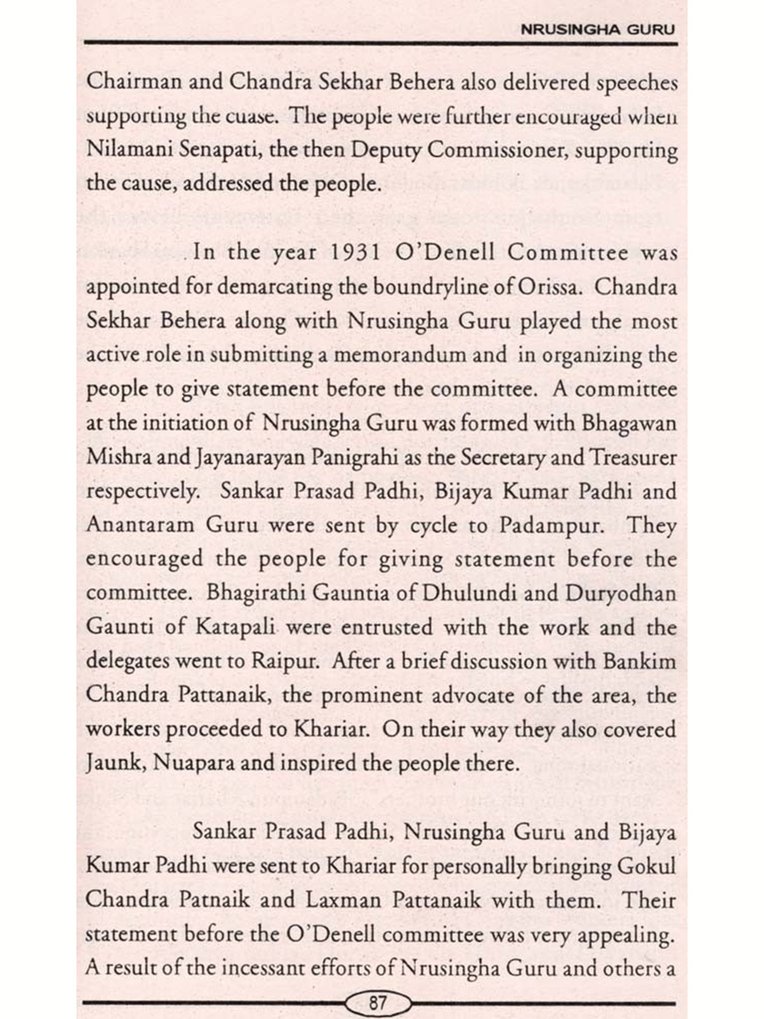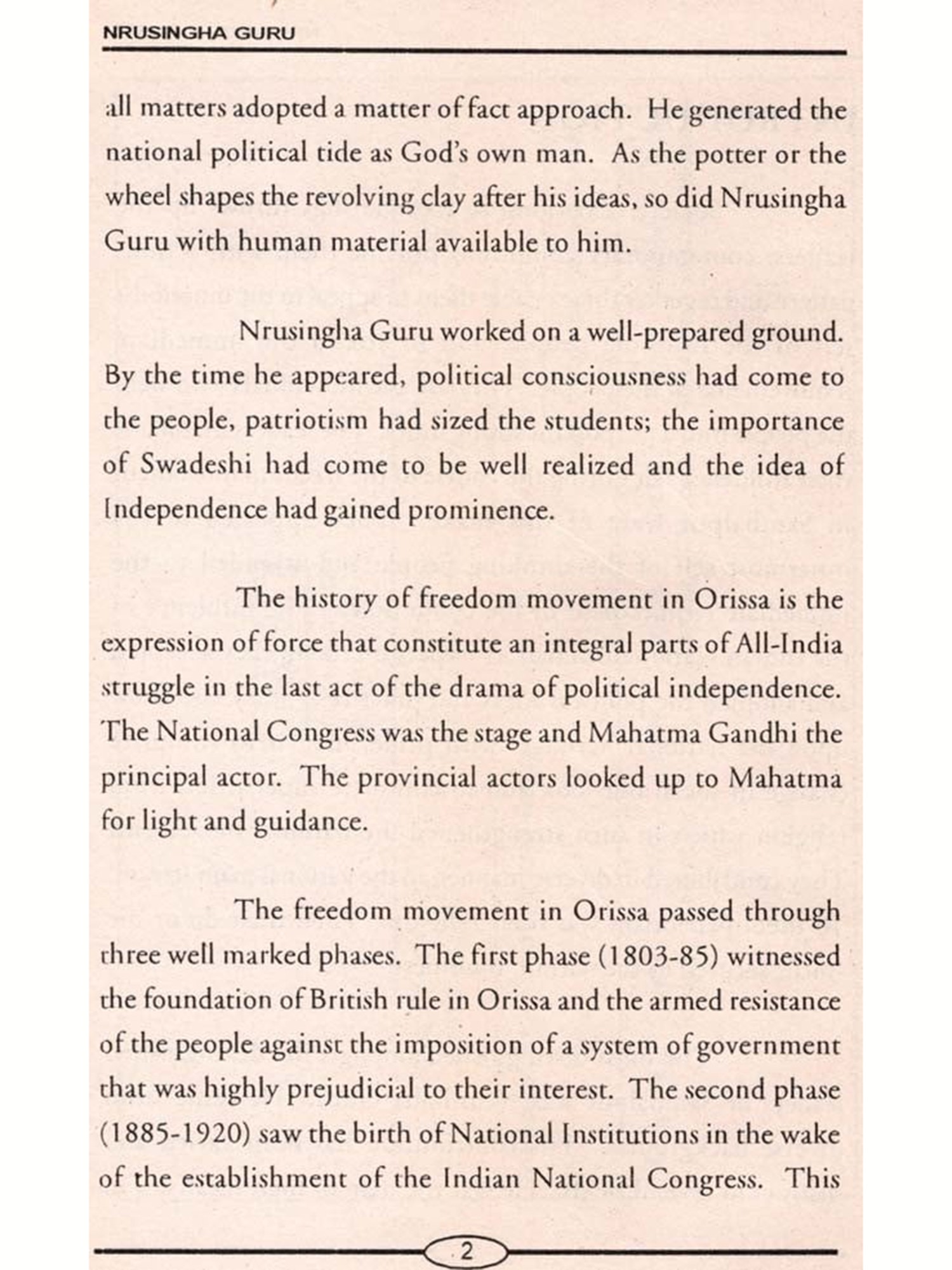 Since Nrusingha Guru has been dealt indepen-dently, repeated reference to some of the common events, in relation to him, obviously were unavoidable. Also reference to the events had to be segmented due to the nature of work. To indicate the proper co-relation of events during the Non Co-operation Movement and Civil Disobedience Movement covering the national events indicating the impact on the freedom struggle has been provided for better understanding and clarity. It adds to narration a distinct comprehensiveness.