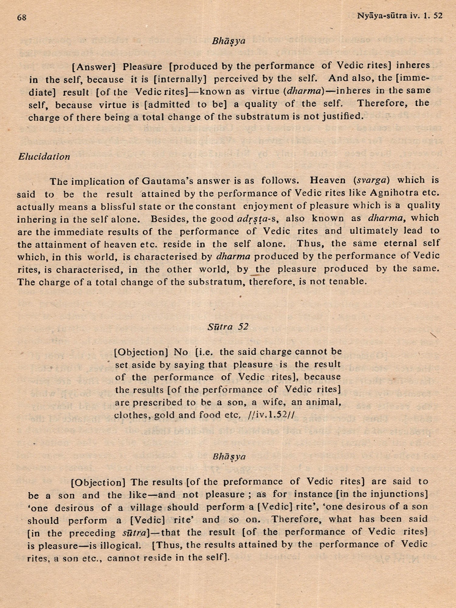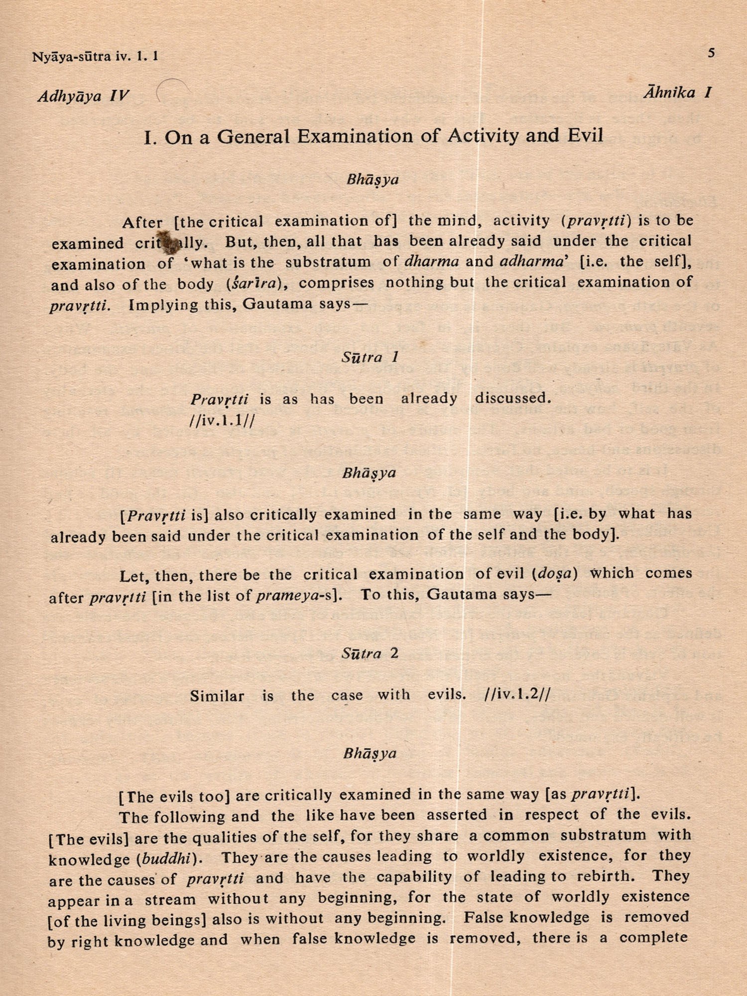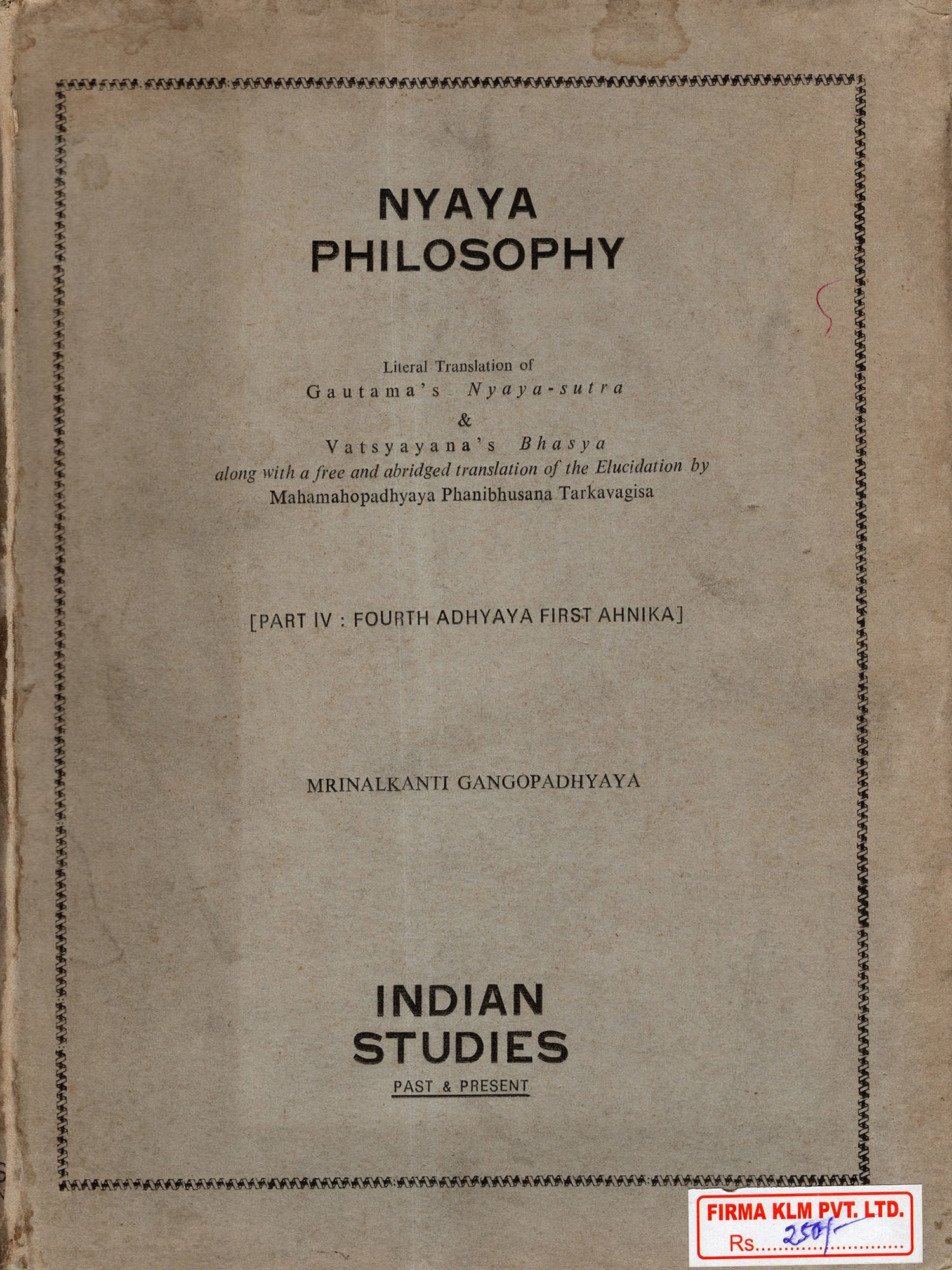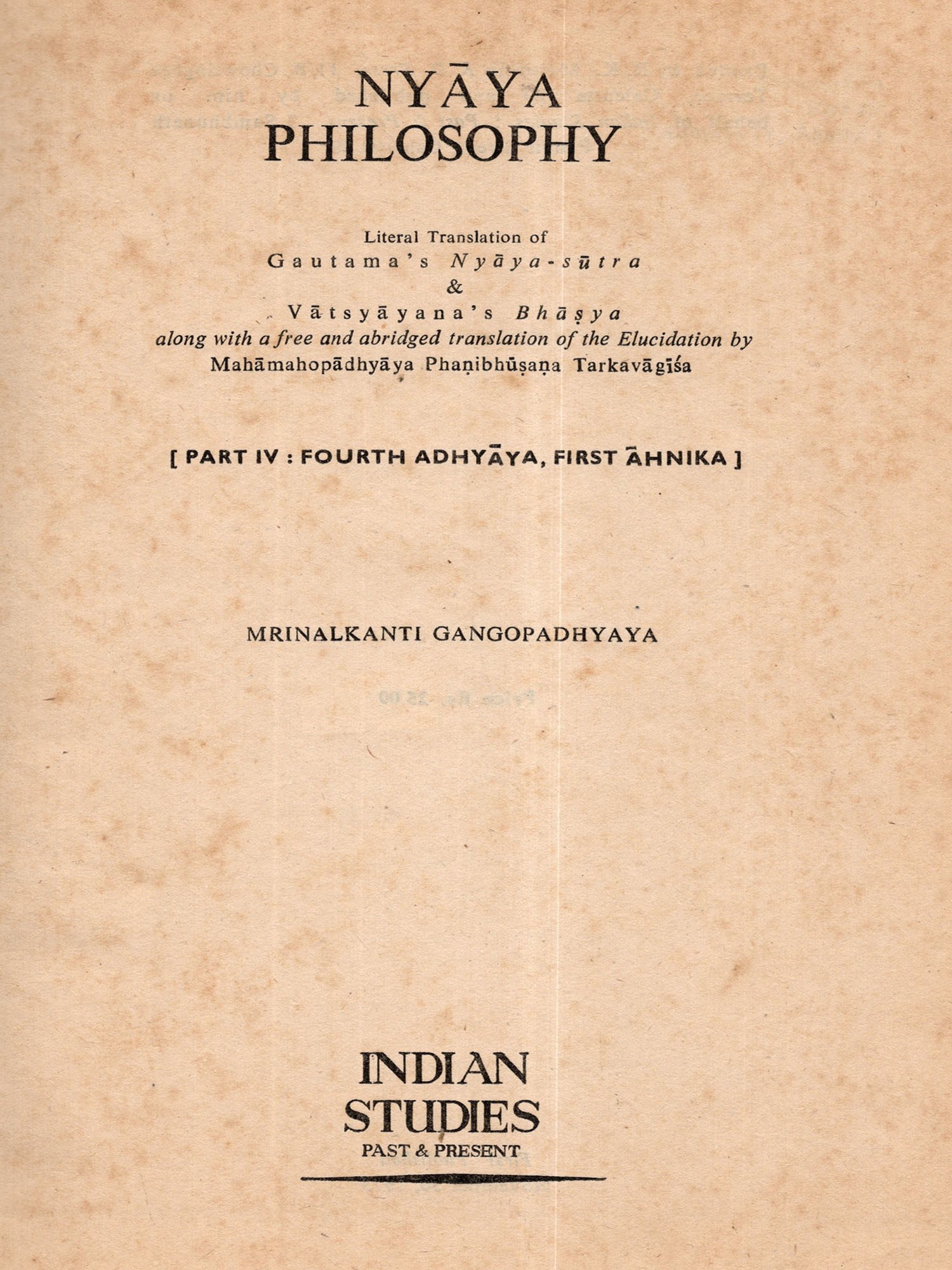 Nyaya Philosophy- Literal Translation of Gautama's Nyaya-Sutra & Vatsyayana's Bhasya (Part IV: Fourth Adhyaya, First Ahnika) An Old and Rare Book