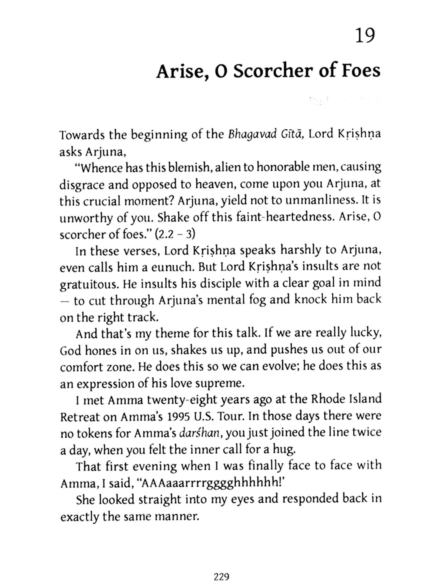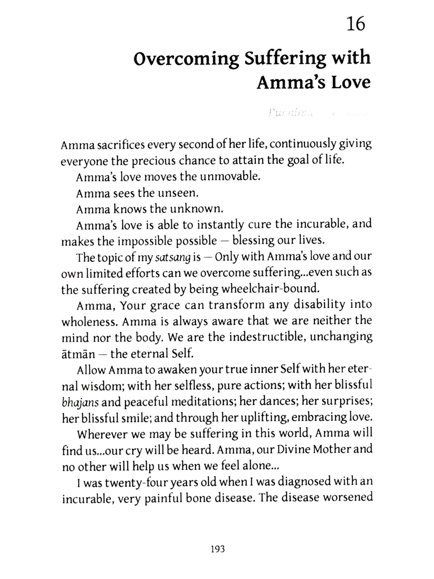 During this time, Amma instructed the ashram residents to start giving half-hour long satsangs every day at the evening programs, after meditation. The resultant satsang series started on March 30, 2020, and continues to this day. Once the Covid-19 travel restrictions were lifted, Amma's grihasthashrami children also started participating.