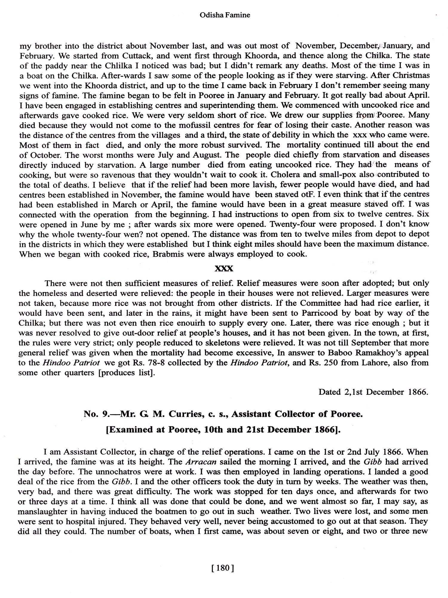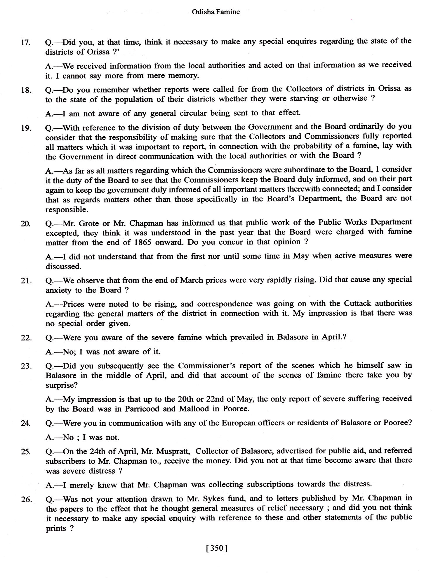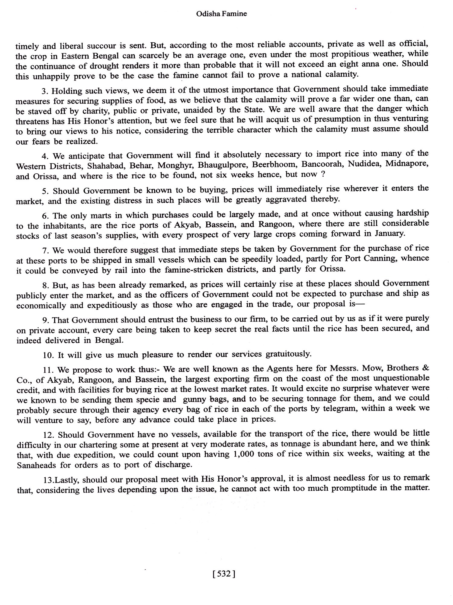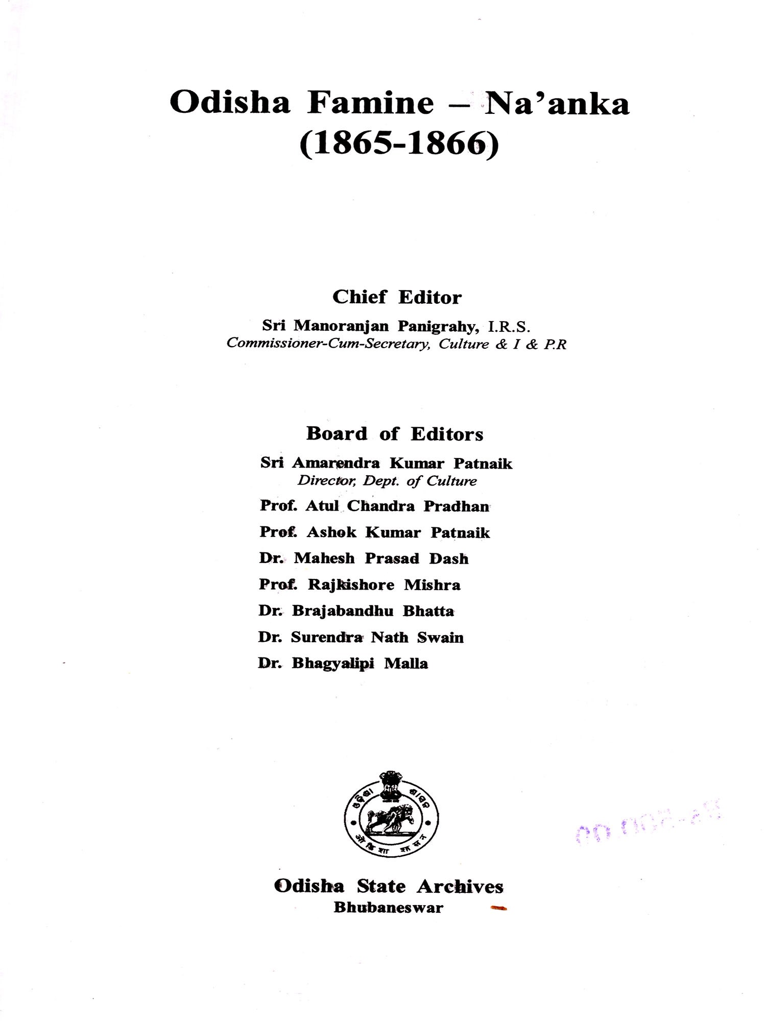 The Famine of 1866 was a turning point in the history of modern Odisha for several reasons. It exposed the British negligence of Odisha and marked the beginning of efforts for the building of a regenerated Odisha. Traditionally, besides administrative negligence, Odisha has been a victim of natural calamities like drought, flood and cyclone. Loss of crops caused by natural calamities has proved economically ruinous to the people of the State, as our agriculture is hopelessly dependent on the vagaries of monsoon. The conservation of water resources for irrigation can be the only effective remedy against drought. In Odisha, in the early sixties of 19th century, before the Famine of 1866, East India Irrigation Company had been set up to explore the possibility of irrigation by taming the rivers. This necessity was confirmed by the experience of the famine of 1866. Odisha State Archives has preserved the official reports and non-official response on the famine of 1866. The Archives has made a commendable job by bringing out compilation of documents on the famine of 1866. It will not only enlighten the general readers but also will prove helpful to the experts entrusted with the responsibility of tackling the natural calamities like drought, flood and famine.