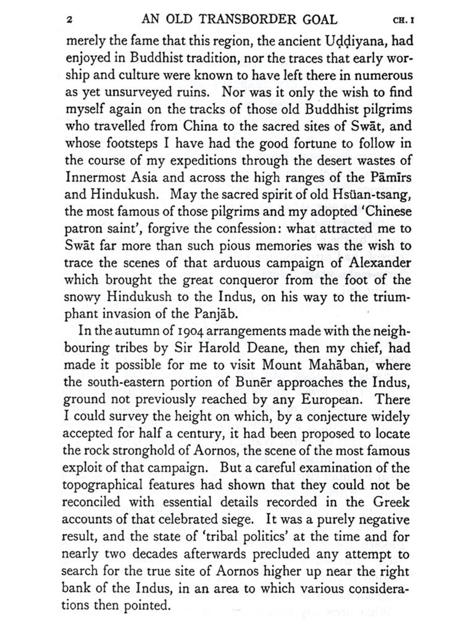 A kindly Fate, and sympathetic comprehension on the part of those who officially dispense it, have enabled me, during intervals of my forty-one years' Indian service, to carry out explorations over the greater part of Innermost Asia, and along the whole of those north-western borderlands of India which by their historical past have powerfully attracted me since my early youth. These travels, devoted to antiquarian and geographical research, have taken me from westernmost China right through Central Asia and from the snowy Pamir ranges down to the desolate coast of the Ikhthyophagoi by the Arabian Sea. But nowhere did they touch ground so replete with historical interest as in that comparatively small area to the west of the Indus which Alexander's march of conquest towards India for a brief span of time illuminates as it were with the light of a meteor.