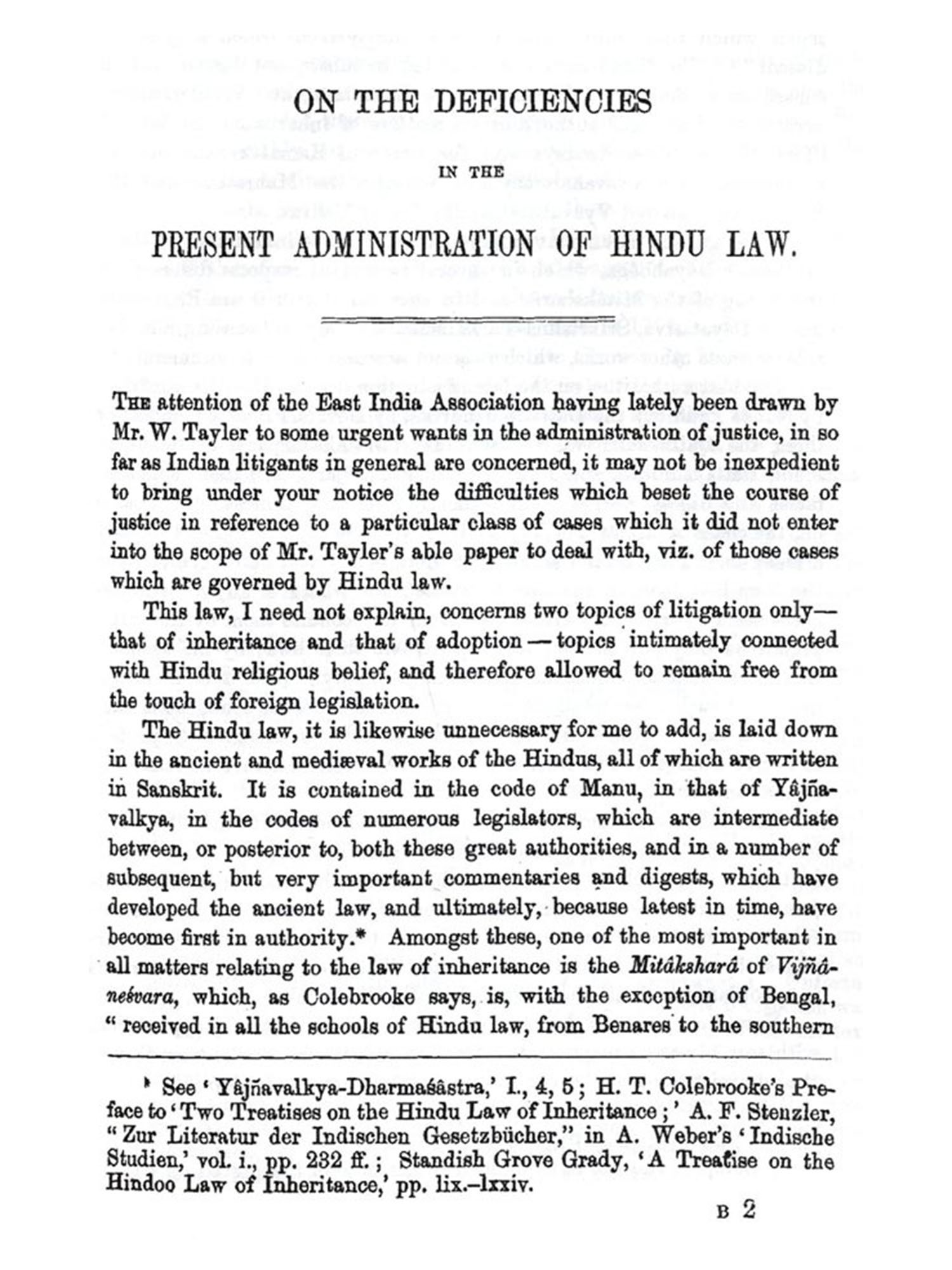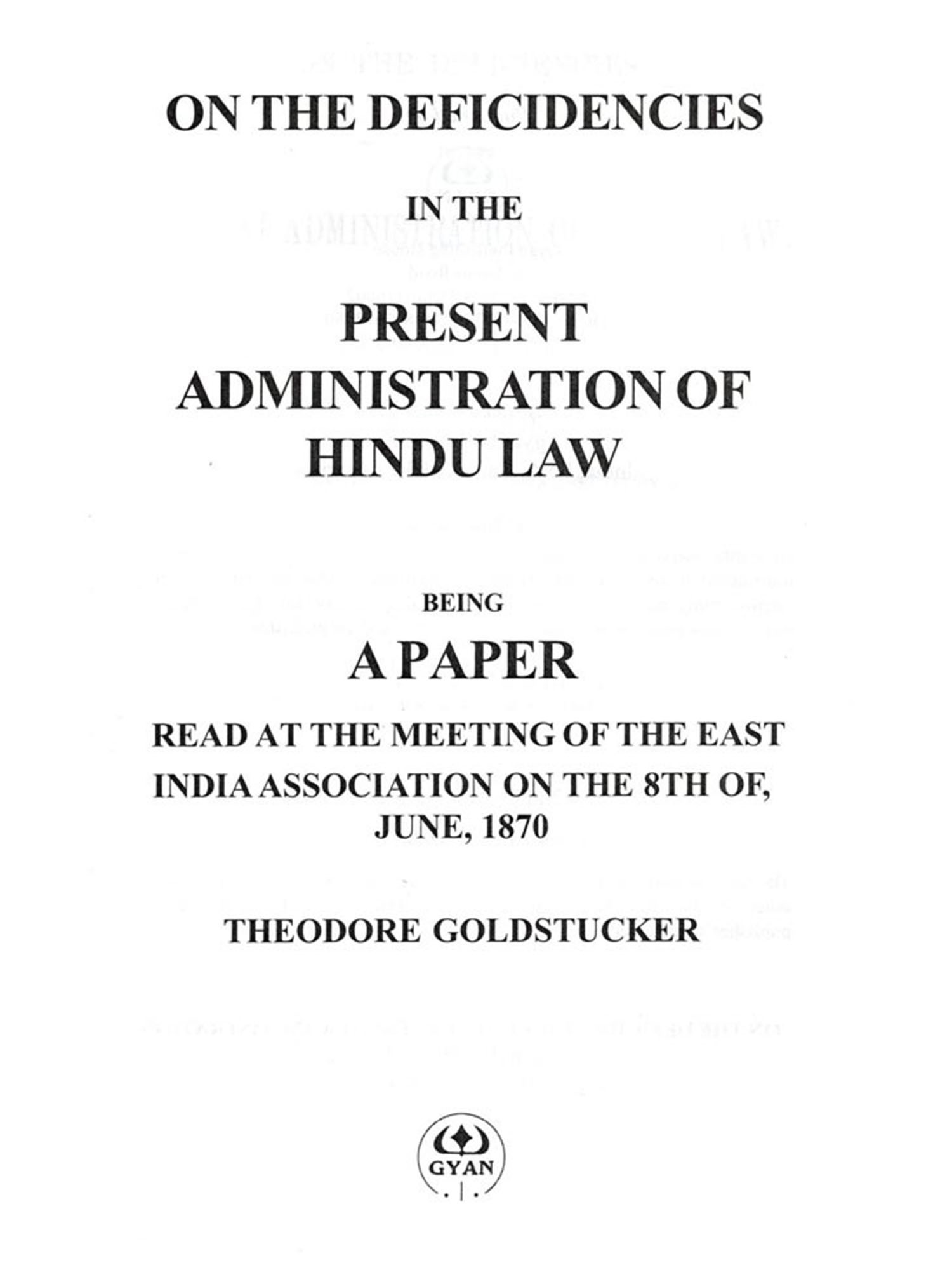 In On the Deficiencies in the Present Administration of Hindu Law (1870), Theodor Goldstucker critiques the British administration of Hindu law in India. Delivered at the East India Association, the paper highlights the inadequacies and inconsistencies in the legal system, especially its failure to effectively integrate Hindu customs and legal practices with British colonial law. Goldstucker argues for a more informed and culturally sensitive approach to administering Hindu law, stressing the importance of understanding traditional Hindu legal principles.