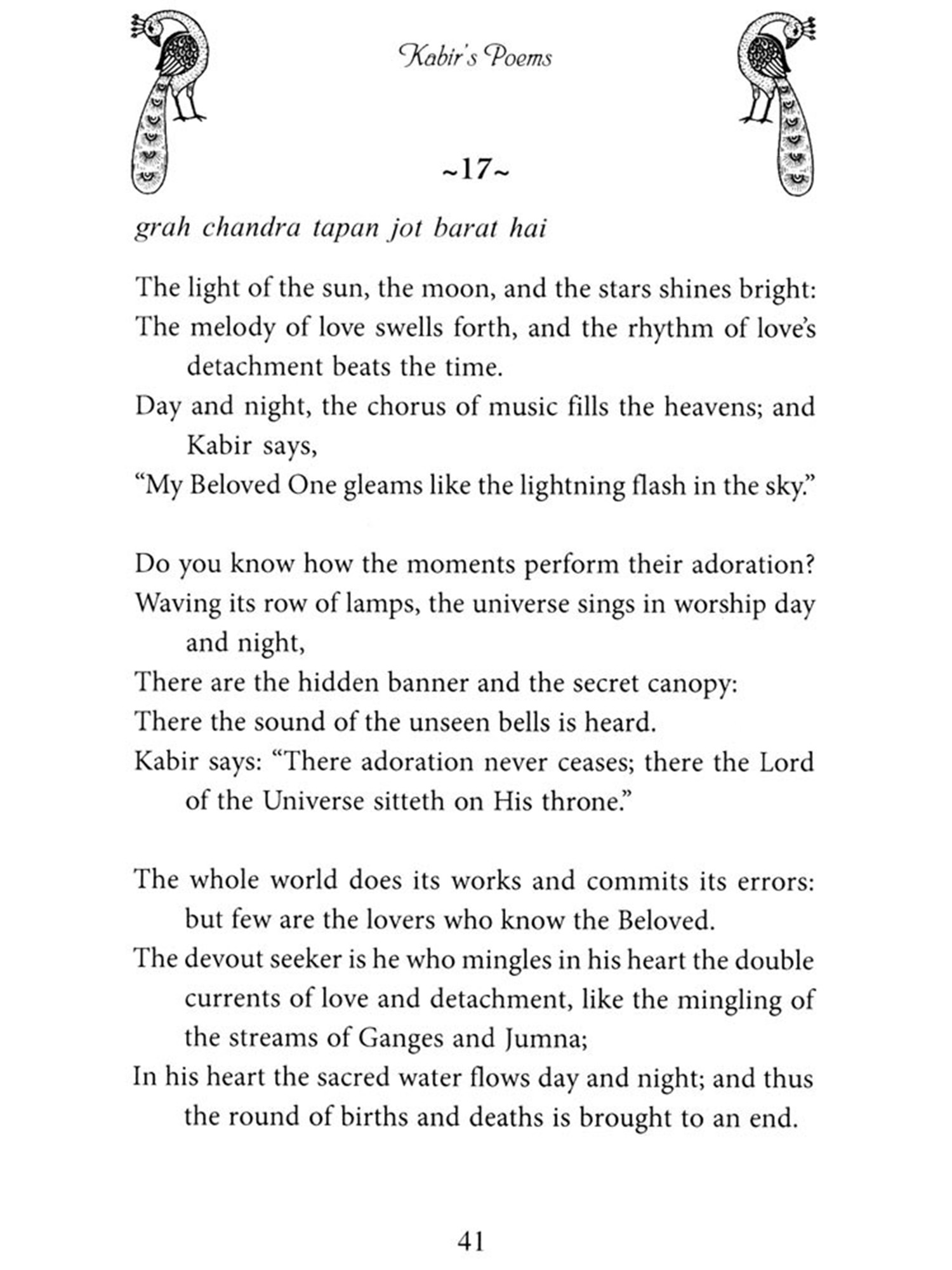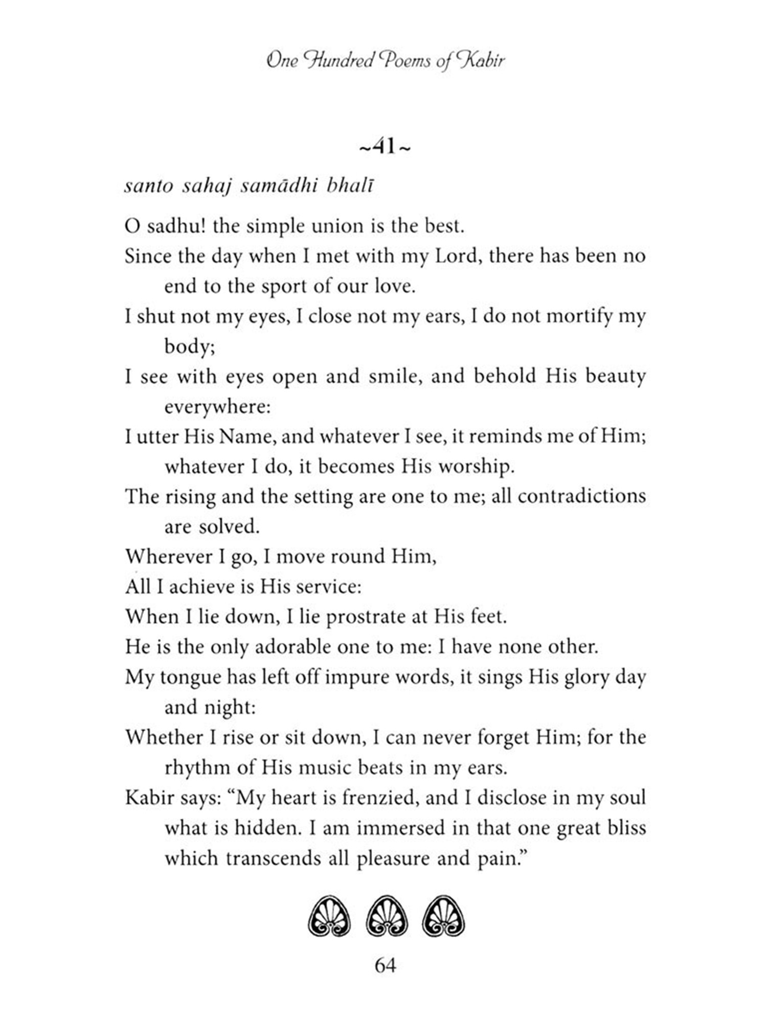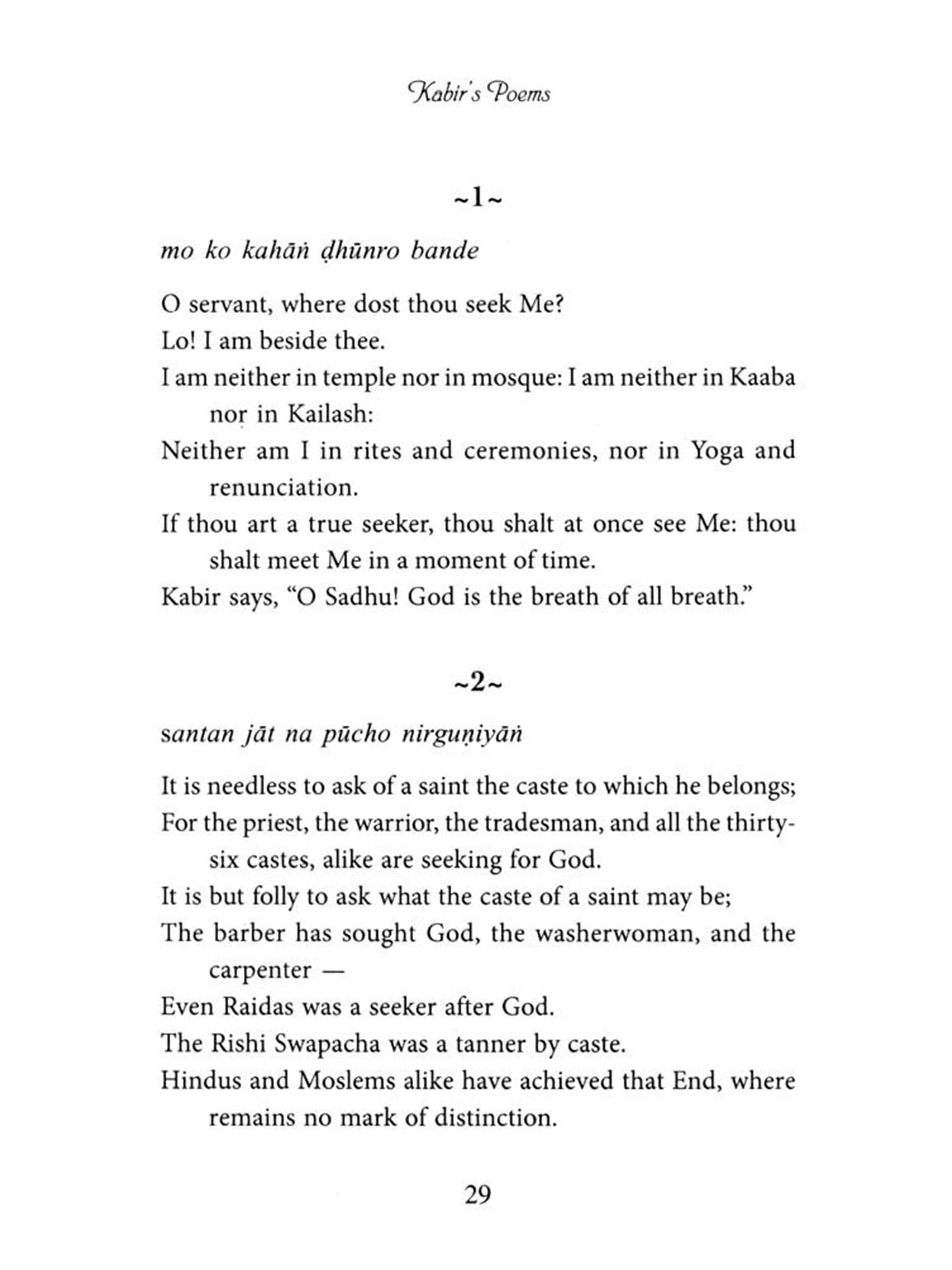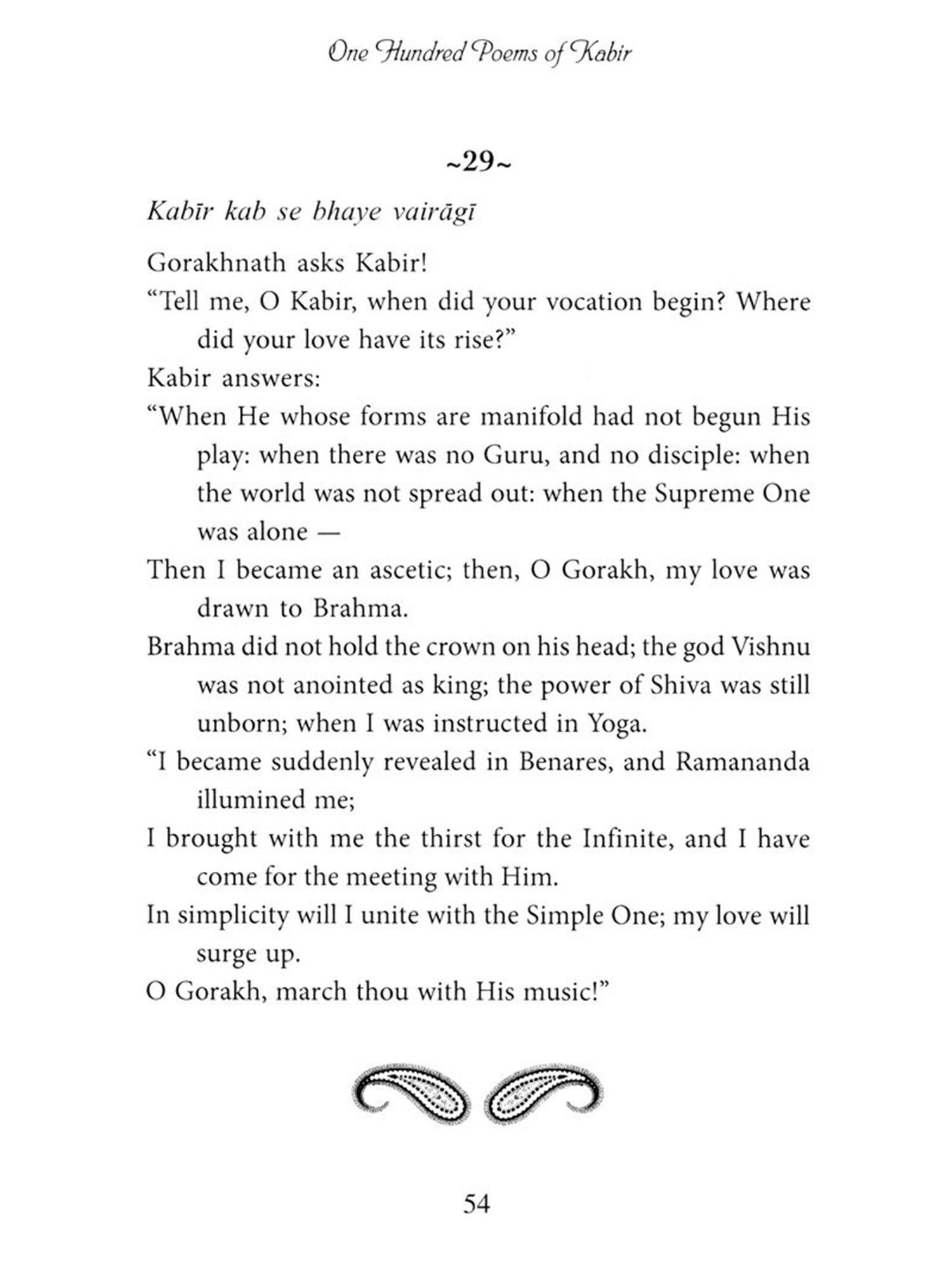 The poet Kabir, a selection from whose songs is here for the first time offered to English readers, is one of the most interesting personalities in the history of Indian mysticism. Born in or near Benares, of Mohammedan parents, and probably about the year 1440, he became in early life a disciple of the celebrated Hindu ascetic Ramananda. Ramananda had brought to Northern India the religious revival which Ramanuja, the great twelfth century reformer of Brahmanism, had initiated in the South. This revival was in part a reaction against the increasing formalism of the ortho-dox cult, in part an assertion of the demands of the heart as against the intense intellectualism of the Vedanta philosophy, the exaggerated monism which that philosophy proclaimed. It took in Ramanuja's preaching the form of an ardent personal devotion to the God Vishnu, as representing the personal aspect of the Divine Nature: that mystical "religion of love" which everywhere makes its appearance at a certain level of spiritual culture, and which creeds and philosophies are powerless to kill.
