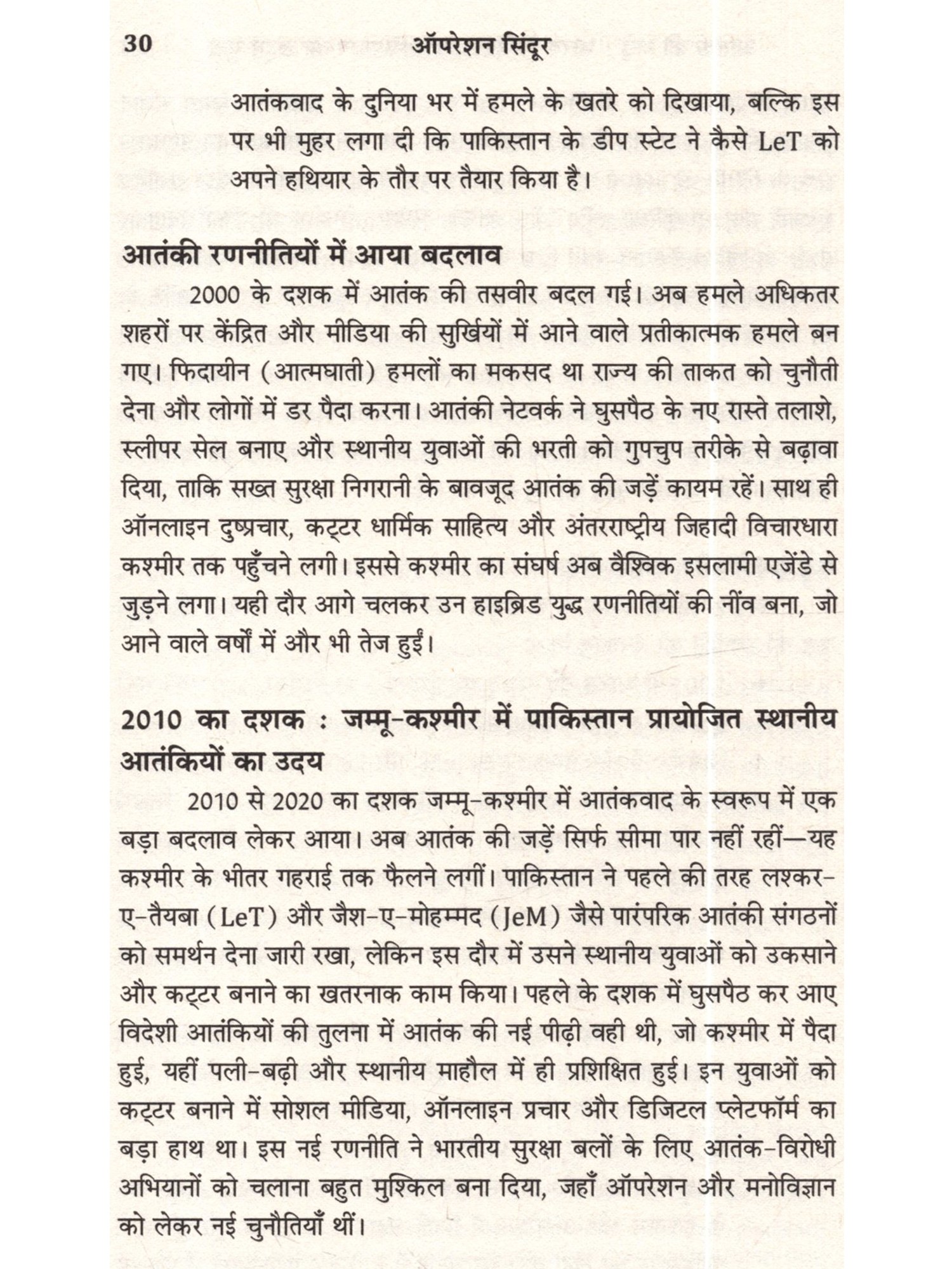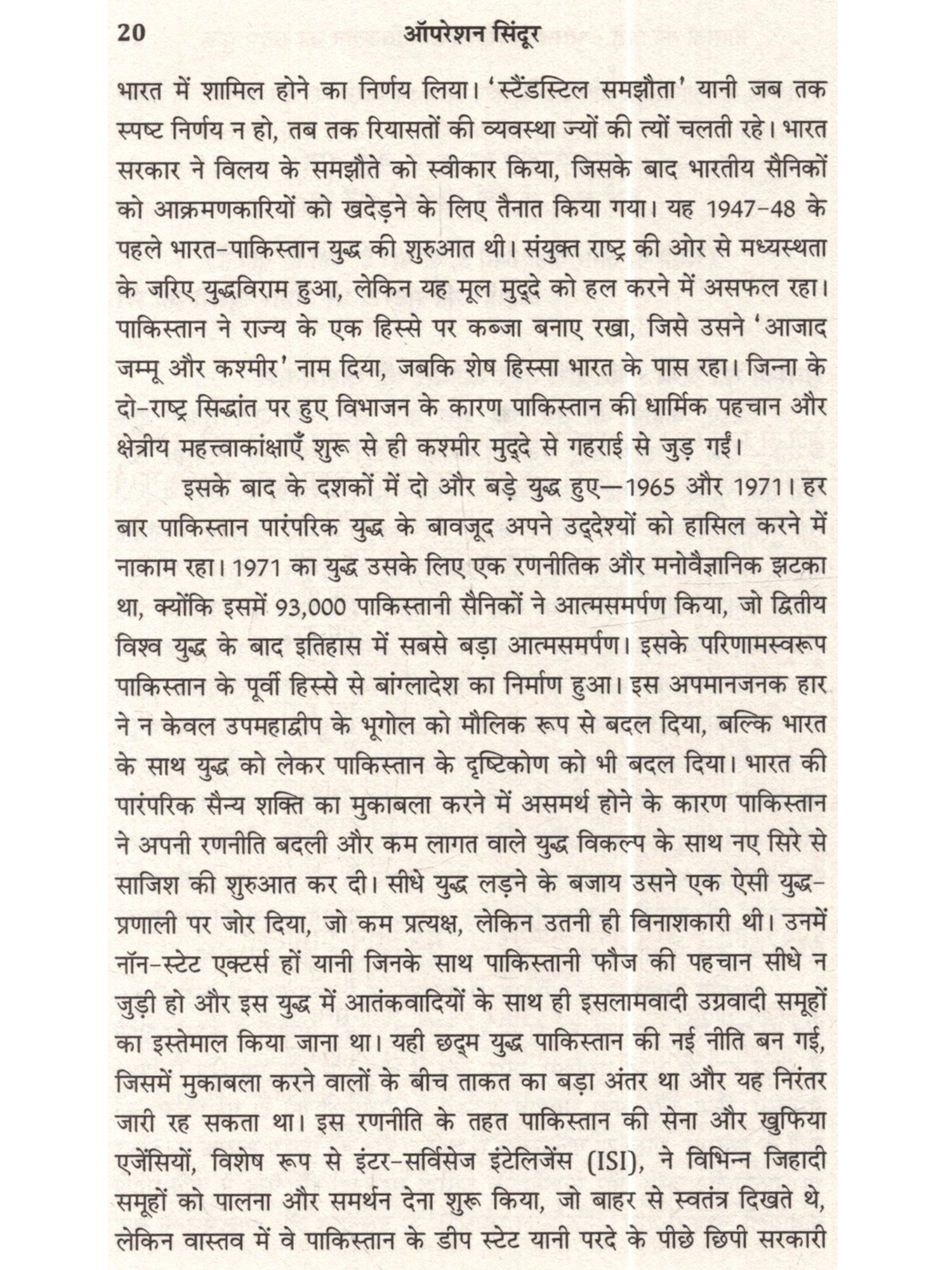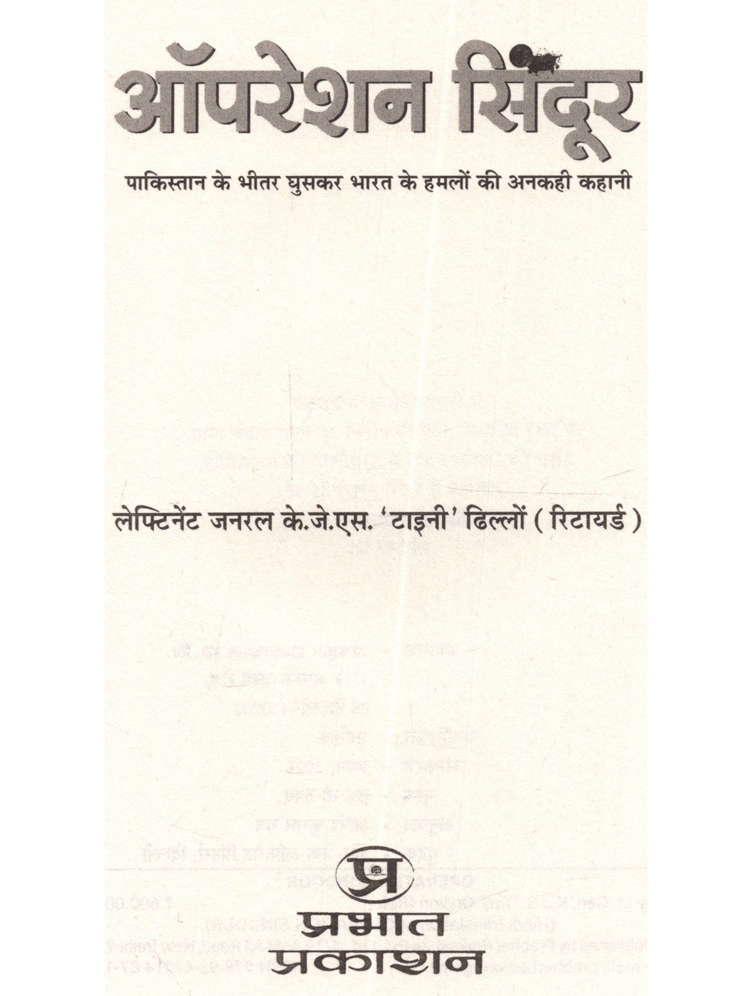 22 अप्रैल, 2025 को दक्षिण कश्मीर के पहलगाम की बैसरन घाटी में एक भयानक हमला हुआ। पाकिस्तानी सेना और उसकी खुफिया एजेंसी, इंटर-सर्विसेज इंटेलिजेंस (ISI) की ओर से प्रायोजित लश्कर-ए-तैयबा (LeT) के प्रॉक्सी आतंकी संगठन, द रेसिस्टेंस फ्रंट (TRF) ने घाटी की शांति को भंग करते हुए भारी हथियारों के साथ गोलीबारी की, जिसमें 26 निदर्दोष पर्यटक मारे गए और कई अन्य घायल हो गए। यह हमला भारत के धार्मिक सौहार्द की तहस-नहस करने और पूरे देश में व्यापक आक्रोश पैदा करने का एक कुत्सित प्रयास था। भारत ने तय किया कि वह इस घटना का उचित जवाव देगा।' ऑपरेशन सिंदूर' से दिए गए जवाव ने न केवल देश बल्कि पूरी दुनिया को झकझोर दिया। अपने इस मिशन में भारत ने अपने सैन्य आधुनिकीकरण और शक्ति का जबरदस्त प्रदर्शन किया। इस अभियान ने जैश-ए-मोहम्मद और लश्कर-ए-तैयबा से जुड़े बहावलपुर और मुरीदके के आतंकी कैंपों और पाकिस्तान अधिकृत कश्मीर में आतंकी लॉञ्च पैड्स को निशाना बनाकर पाकिस्तान और आतंक की फैक्टरी के खिलाफ एक कड़ा संदेश दिया। यह पुस्तक परमाणु शक्तिसंपन्न दो दुश्मन देशों के बीच हुए चार दिनों के युद्ध की बारीक जानकारी और घटनाक्रम को प्रस्तुत करती है। लेखक ने नैरेटिव की जंग में मीडिया और सोशल मीडिया का इस्तेमाल चतुराई से करने के महत्त्व को बताया है। साथ ही न्यू नॉर्मल और युद्ध के सामने आते नए नियमों के बीच आगे का रास्ता भी सुझाया है। अब तक जो जानकारियों सामने नहीं आई हैं, उनसे परदा उठाते हुए लेफ्टिनेंट जनरल टाइनी ढिल्लों ने ऑपरेशन सिंदूर की एक ऐसी झलक पेश की है, जो भारतीय सेना की ताकत और प्रतिकूल परिस्थितियों में भारत की एकता का प्रमाण है। नष्ट किए गए ठिकानों की तसवीरों के साथ यह पुस्तक आतंकवाद के गहरे प्रभाव और शांति व न्याय की उम्मीद बनाए रखने का मुद्दा जोरदार ढंग से उठाती है।