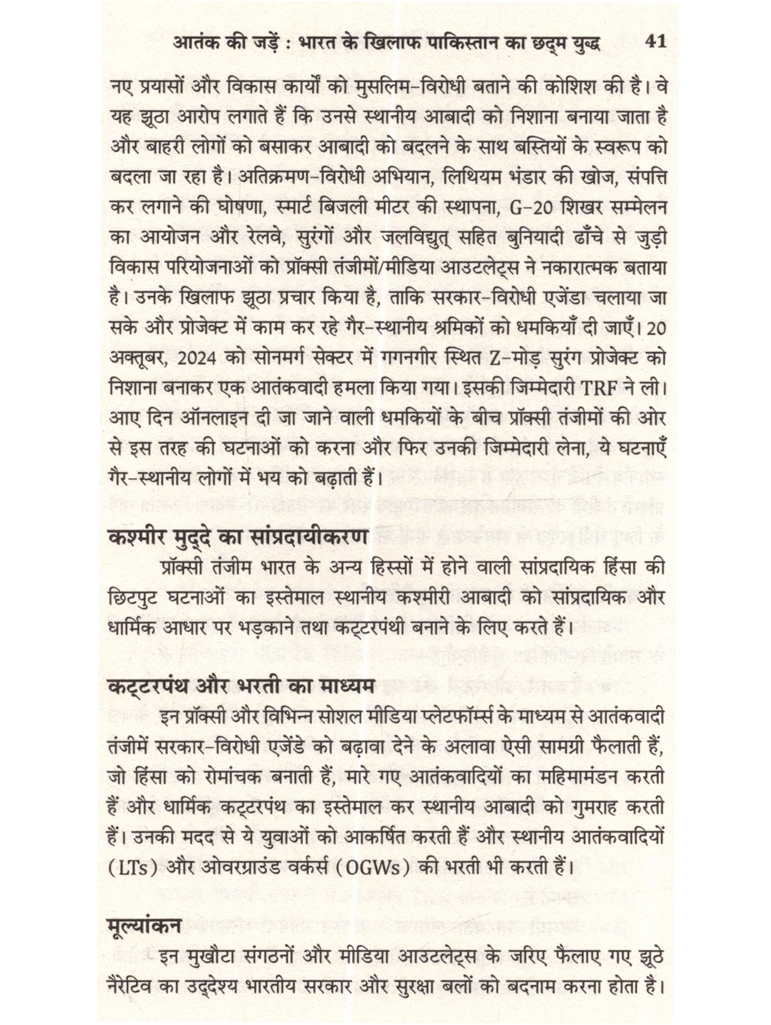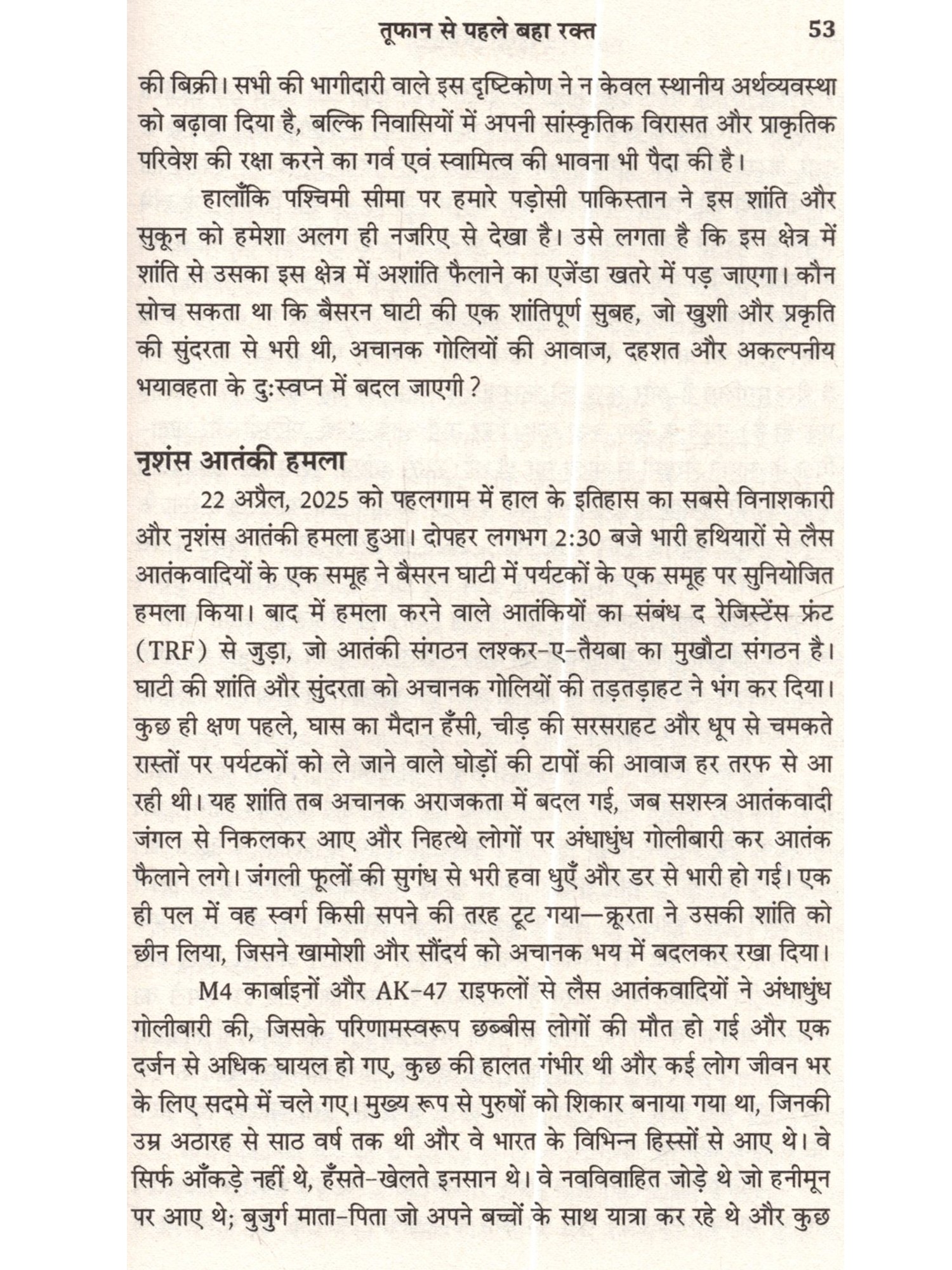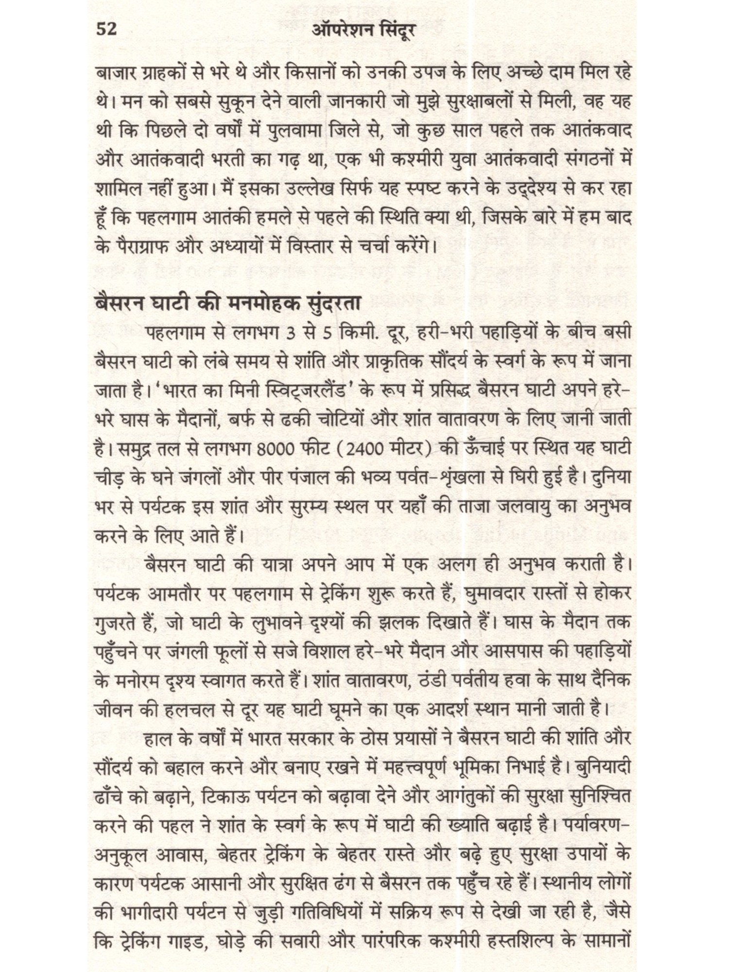22 अप्रैल, 2025 को दक्षिण कश्मीर के पहलगाम की बैसरन घाटी में एक भयानक हमला हुआ। पाकिस्तानी सेना और उसकी खुफिया एजेंसी, इंटर-सर्विसेज इंटेलिजेंस (ISI) की ओर से प्रायोजित लश्कर-ए-तैयबा (LeT) के प्रॉक्सी आतंकी संगठन, द रेसिस्टेंस फ्रंट (TRF) ने घाटी की शांति को भंग करते हुए भारी हथियारों के साथ गोलीबारी की, जिसमें 26 निदर्दोष पर्यटक मारे गए और कई अन्य घायल हो गए। यह हमला भारत के धार्मिक सौहार्द की तहस-नहस करने और पूरे देश में व्यापक आक्रोश पैदा करने का एक कुत्सित प्रयास था। भारत ने तय किया कि वह इस घटना का उचित जवाव देगा।' ऑपरेशन सिंदूर' से दिए गए जवाव ने न केवल देश बल्कि पूरी दुनिया को झकझोर दिया। अपने इस मिशन में भारत ने अपने सैन्य आधुनिकीकरण और शक्ति का जबरदस्त प्रदर्शन किया। इस अभियान ने जैश-ए-मोहम्मद और लश्कर-ए-तैयबा से जुड़े बहावलपुर और मुरीदके के आतंकी कैंपों और पाकिस्तान अधिकृत कश्मीर में आतंकी लॉञ्च पैड्स को निशाना बनाकर पाकिस्तान और आतंक की फैक्टरी के खिलाफ एक कड़ा संदेश दिया। यह पुस्तक परमाणु शक्तिसंपन्न दो दुश्मन देशों के बीच हुए चार दिनों के युद्ध की बारीक जानकारी और घटनाक्रम को प्रस्तुत करती है। लेखक ने नैरेटिव की जंग में मीडिया और सोशल मीडिया का इस्तेमाल चतुराई से करने के महत्त्व को बताया है। साथ ही न्यू नॉर्मल और युद्ध के सामने आते नए नियमों के बीच आगे का रास्ता भी सुझाया है। अब तक जो जानकारियों सामने नहीं आई हैं, उनसे परदा उठाते हुए लेफ्टिनेंट जनरल टाइनी ढिल्लों ने ऑपरेशन सिंदूर की एक ऐसी झलक पेश की है, जो भारतीय सेना की ताकत और प्रतिकूल परिस्थितियों में भारत की एकता का प्रमाण है। नष्ट किए गए ठिकानों की तसवीरों के साथ यह पुस्तक आतंकवाद के गहरे प्रभाव और शांति व न्याय की उम्मीद बनाए रखने का मुद्दा जोरदार ढंग से उठाती है।