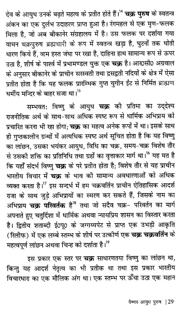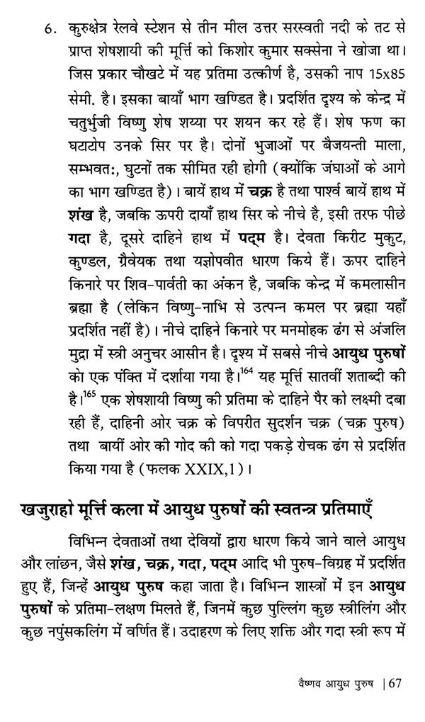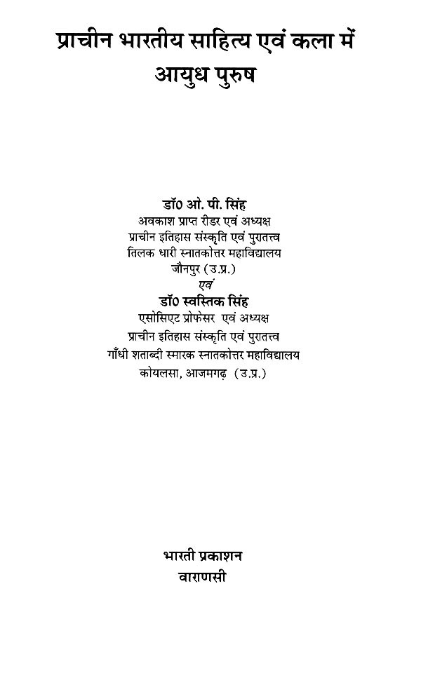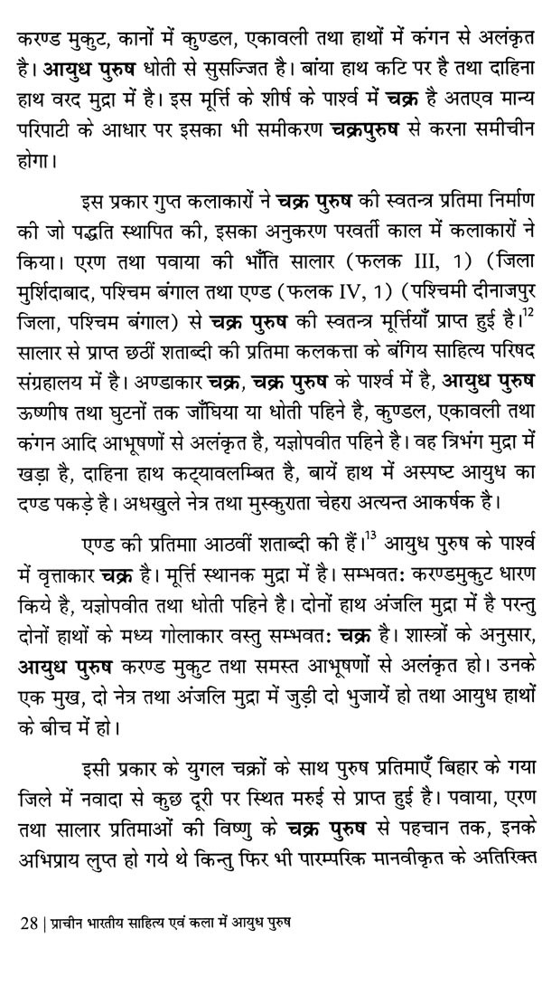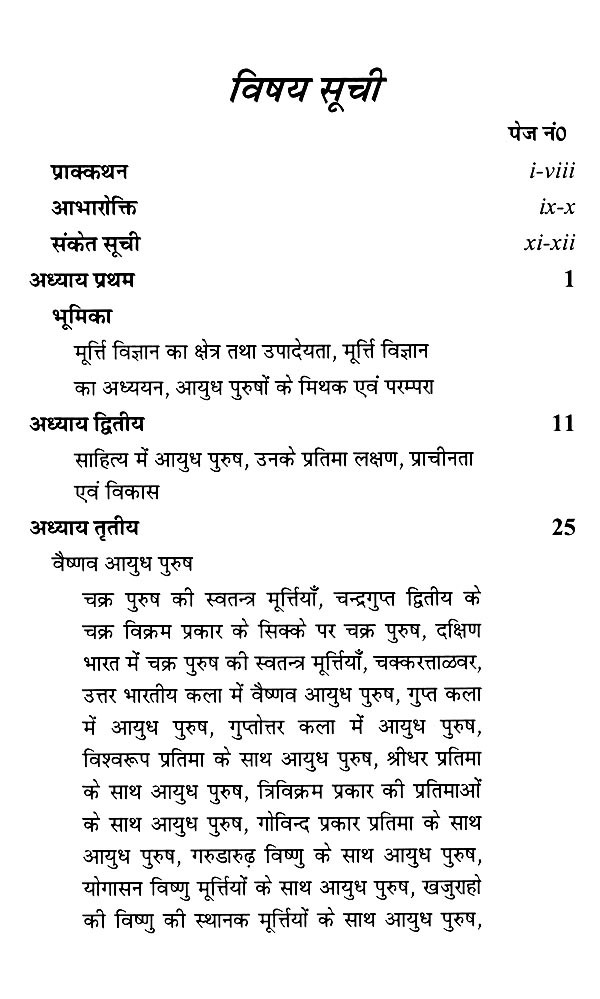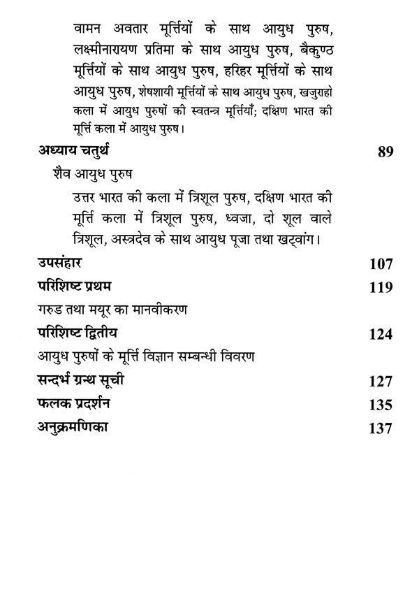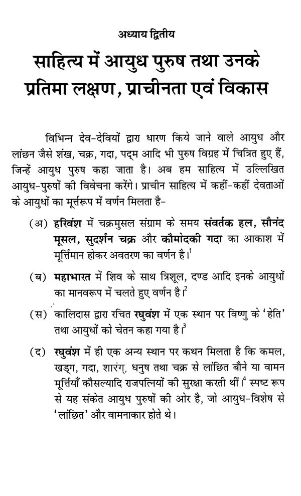 इसके अतिरिक्त डब्ल्यू० ई० बेग्ली ने 'विष्णु'ज फ्लेमिंग ह्वील : दि आइकोनोग्राफी आफ दि सुदर्शन चक्र' तथा सी० शिवराम मूर्ति ने 'दि वीपन्स ऑफ विष्णु' प्रकाशित किया। बेग्ली, मुख्यतः विष्णु के सुदर्शन चक्र पर ही केन्द्रित रहे हैं। नी०पु० जोशी तथा आर०सी० अग्रवाल ने भी केवल कुछ ही आयुध पुरुषों तक अपने को सीमित रखा। बी०आर० मणि ने रोचक मोनोग्राफ तो अवश्य प्रकाशित किया है लेकिन उत्तर भारतीय कला में आयुध पुरुषों का गहन अध्ययन प्रस्तुत करने में असफल रहे हैं। उन्होंने दक्षिण भारतीय कला को अपना केन्द्र बिन्दु बनाया। अतः प्रस्तुत ग्रन्थ में इन कमियों को दूर कर 'प्राचीन भारतीय साहित्य एवं कला में आयुध पुरुषों' का सूक्ष्म एवं गहन अध्ययन करने का प्रयास किया गया है।