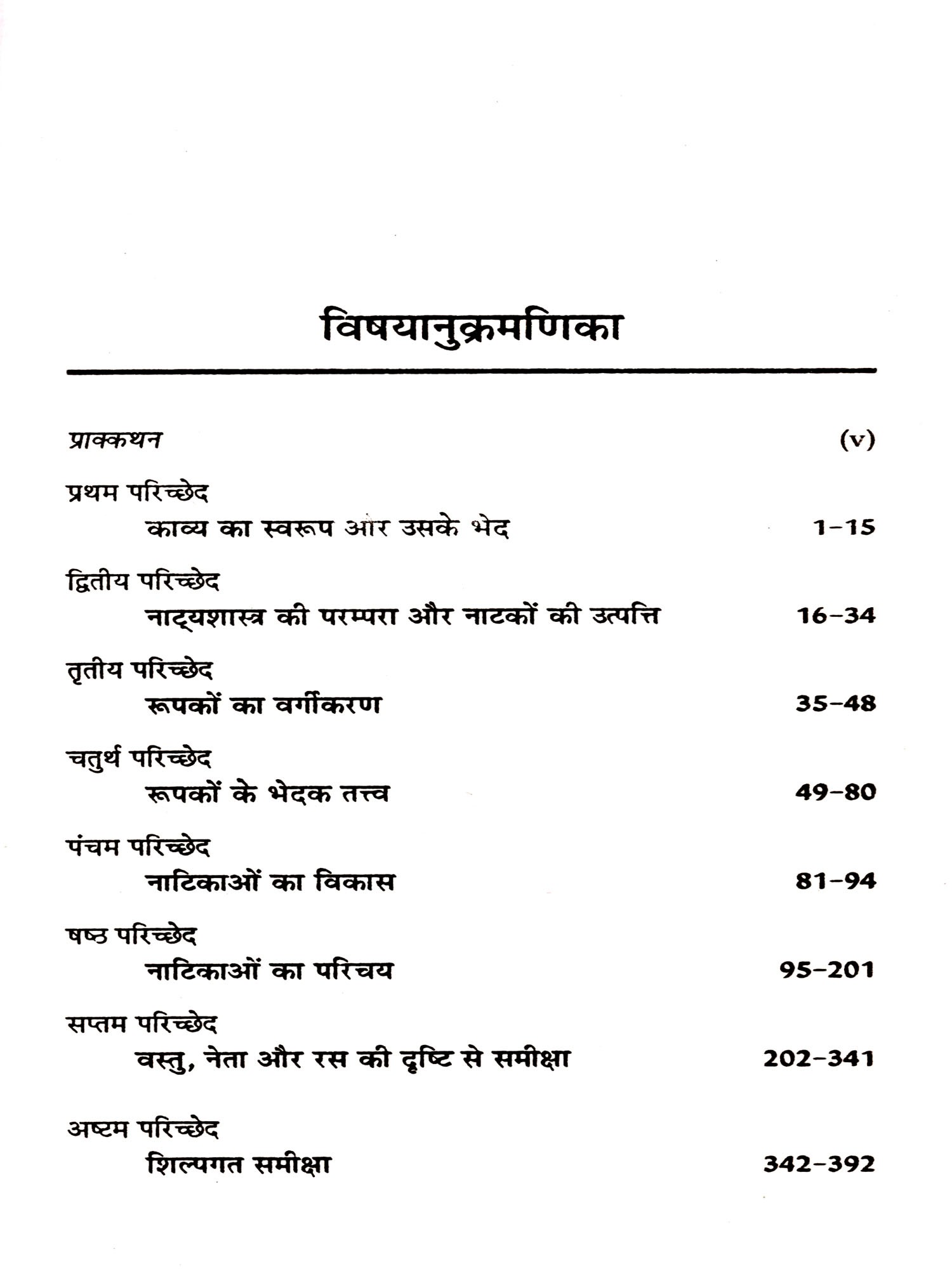 इस ग्रन्थ में कुल दस परिच्छेद हैं। प्रथम परिच्छेद में काव्य का स्वरूप और उसके भेद, दृश्य काव्य की महत्ता तथा इसके लिये प्रयुक्त होने वाले नाटक, रूपक, रूप इत्यादि नामों की सार्थकता पर विचार किया गया है। द्वितीय परिच्छेद में नाट्यशास्त्र की परम्परा और नाटकों की उत्पत्ति पर प्रकाश डाला गया है। तृतीय परिच्छेद में रूपकों का वर्गीकरण तथा उसमें नाटिका का वैशिष्ट्य स्पष्ट किया गया है। चतुर्थ परिच्छेद में रूपकों के भेदक-तत्व-वस्तु, नेता और रस का विवेचन किया गया है। पंचम परिच्छेद में नाटिकाओं के विकास के विषय में विवेचन किया गया है। षष्ठ परिच्छेद में उपलब्ध नाटिकाओं का परिचय दिया गया है। सप्तम परिच्छेद में वस्तु, नेता और रस की दृष्टि में उपर्युक्त नाटिकाओं का अध्ययन किया गया है। अष्टम परिच्छेद में उक्त नाटिकाओं के शिल्पगत-विधान पर प्रकाश डाला गया है। नवम् परिच्छेद में उपलब्ध नाटिकाओं में प्रकृति-चित्रण का वर्णन किया गया है। दशम परिच्छेद में उक्त नाटिकाओं की उपलब्धियाँ तथा उपसंहार की प्रतिष्ठा की गयी है।