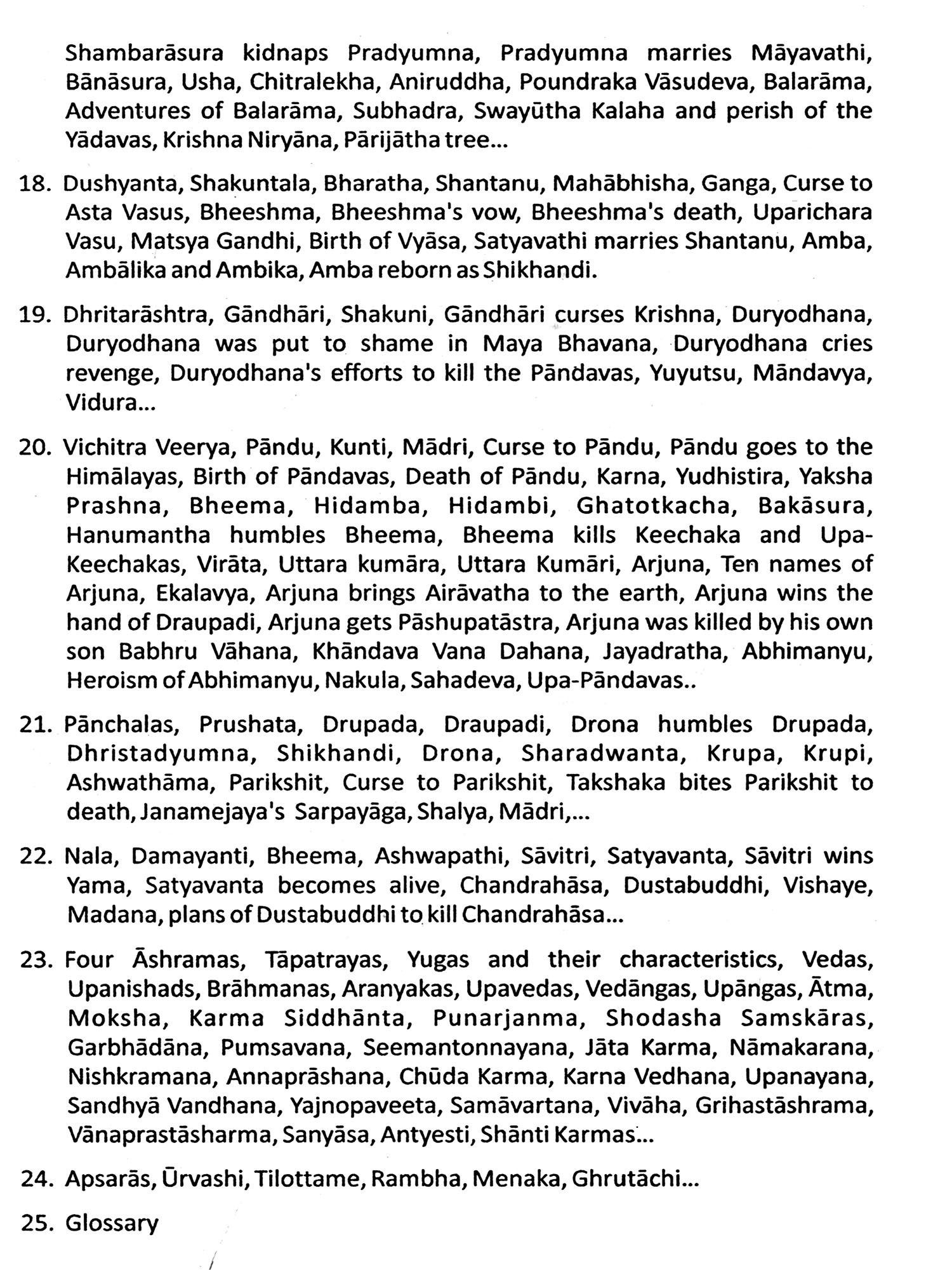 Four Vedas, sixteen Puranas, Upanishads, Ramayana and Mahabharatha form the basic foundation of Hinduism. They are as ancient as they are modern in their appeal to the young and the old alike. All these have innumerable stories and characters whose experiences cause pleasure as well as pain in the minds of their readers. Billions of times they must have been recited, narrated, played or read. Yet they continue to evoke undying interest in the minds of their audiences and readers. It is because they are so familiar and down to earth in content as well as in expression that everyone who reads or listens to these Puranas is, irrespective of his social or economic status, able to identify himself with one or more of the Puranic characters or to find himself in situations similar to the ones in which the Puranic characters are portrayed. Characters depicted in the Hindu holy texts can be divided into several groups. Good, Evil, Godly, Devilish, Neutral and Unconcerned of what happens around. Destruction of Evil by Good is the main theme of the principal and the sub stories in these holy texts of Hindu religion. Narration of cause of conflict between Good and Evil, course of struggle by Good and its final triumph over Evil in these holy texts is interspersed with moral teachings and guidance for good living, individual and collective. Need to lead a righteous life is emphasized in these holy texts. Language and method of presentation may differ but essence is the same. Righteousness is always desirable because it always wins over wickedness. Precepts and guidance found in them are as effectively applicable to all types of situations today as they were in the past.