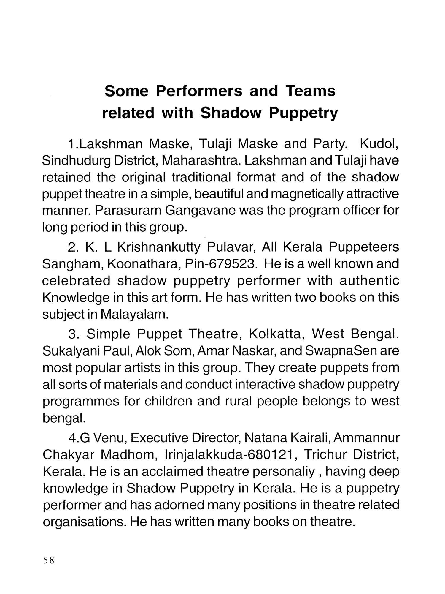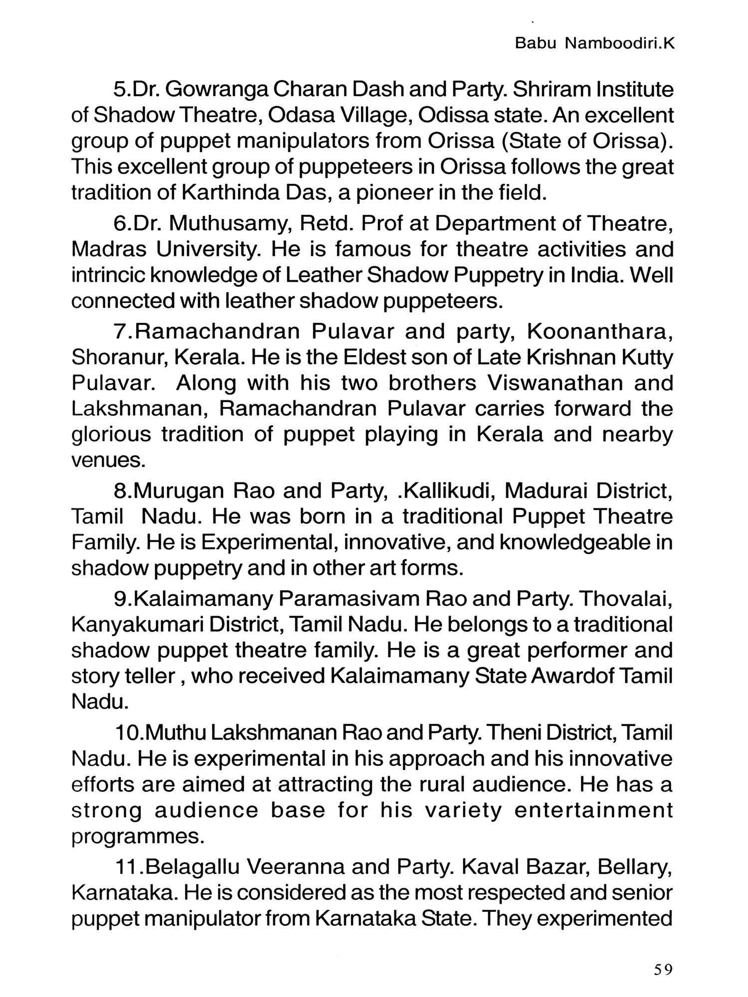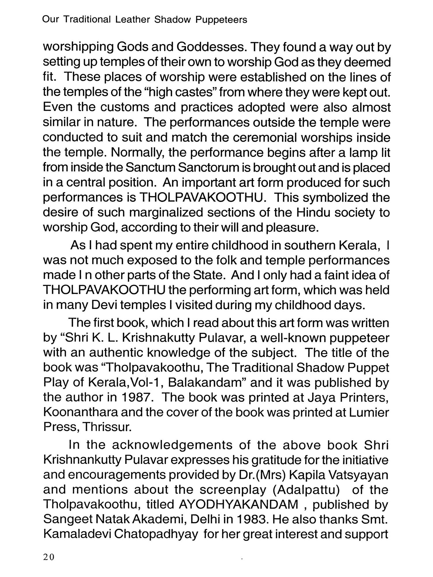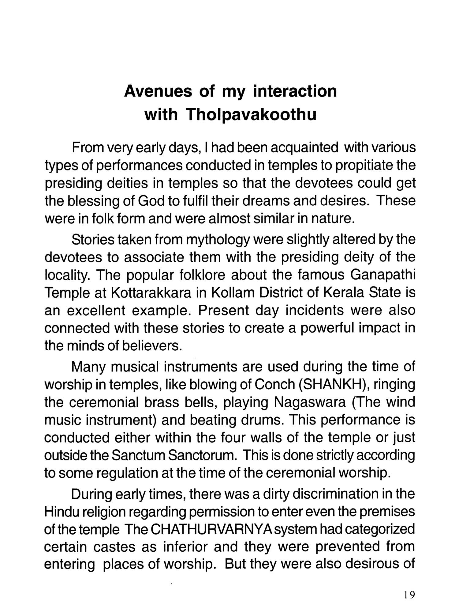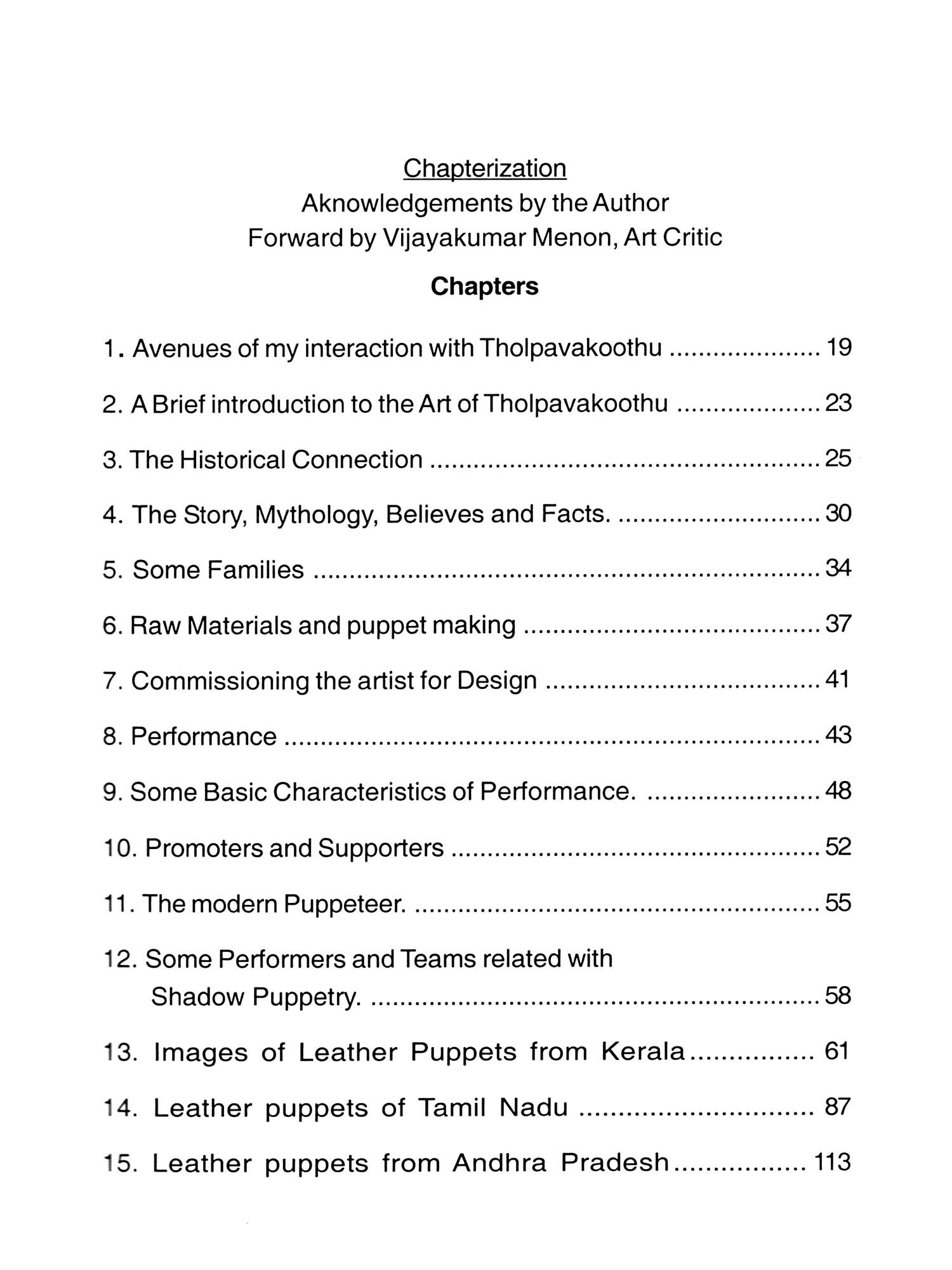 Krishnankutty Pulavar, the 20th century maestro of Tholppavakkoothu scientifically choreographed the play in the form we could see today and Kamaladevi Chatopadhyaya, Kapila Vatsyayan, Venu. G and others promoted it at such a level that now it has attained a universal acclaim as Kutiyattam, Kathakali, Krishnanattam, Theyyam, Mutiyettu have received. Unfortunately very few studies are there about the details of the art form though there are attempts. This unique art form has elements of theatre, music, instrumental accompaniment; narration in a particular pattern, scientific light and shade arrangement, dramatic animation movement etc and each component is a topic for detailed study. Here BabuNamboodiri. K. has ventured to go into the essence of Tholppavakkoothu. Being a painter himself BabuNamboodiri can very well theorise the intricacies of the forms of the puppets, space used for the shadow on the screen (Ayapputava) and also the nature of animation. Though Babu's study is not an exhaustive one as he himself admits, it is an analytical introduction to the unique shadow puppetry which has universal appeal because of the language of performance as one of the oldest theatrical and animation forms in the world. History, myths, making of the puppets, colouring of the puppets, details of the theatre, performance details etc are dealt with by the author with considerable authority. As a painter when Babu studies the visual aspects of the theatre it gives an additional value than a study by a literary scholar.