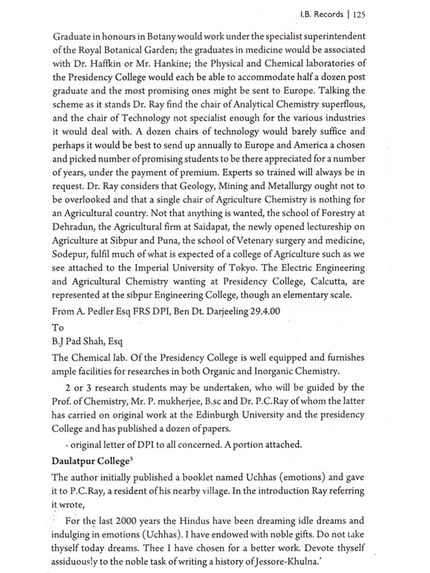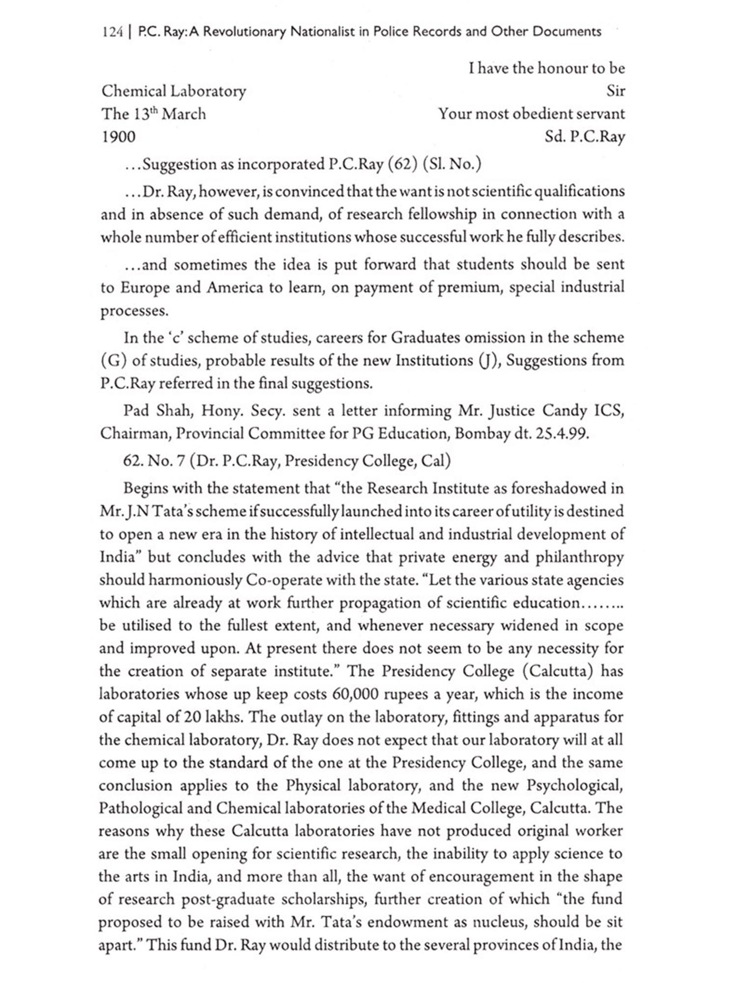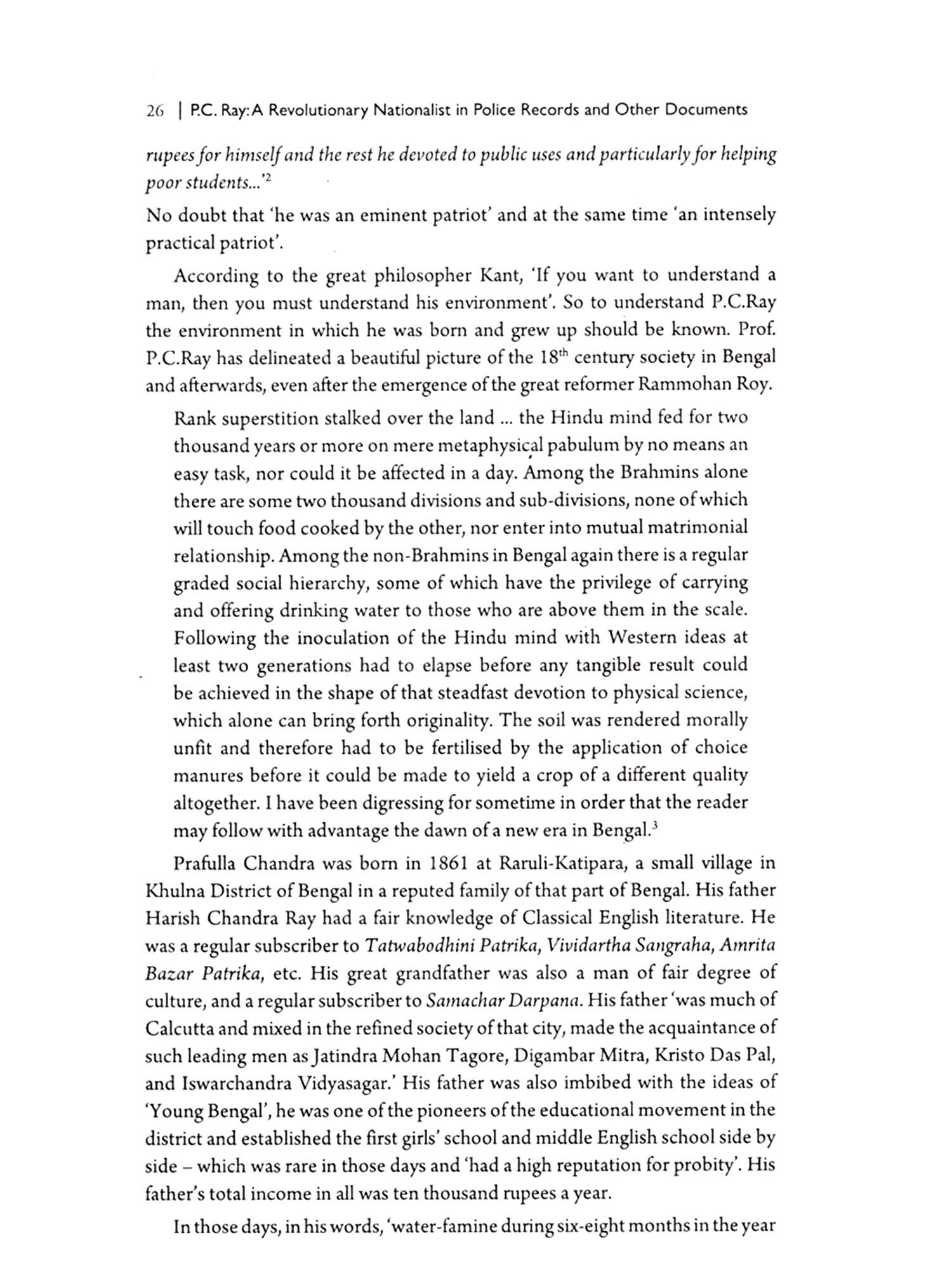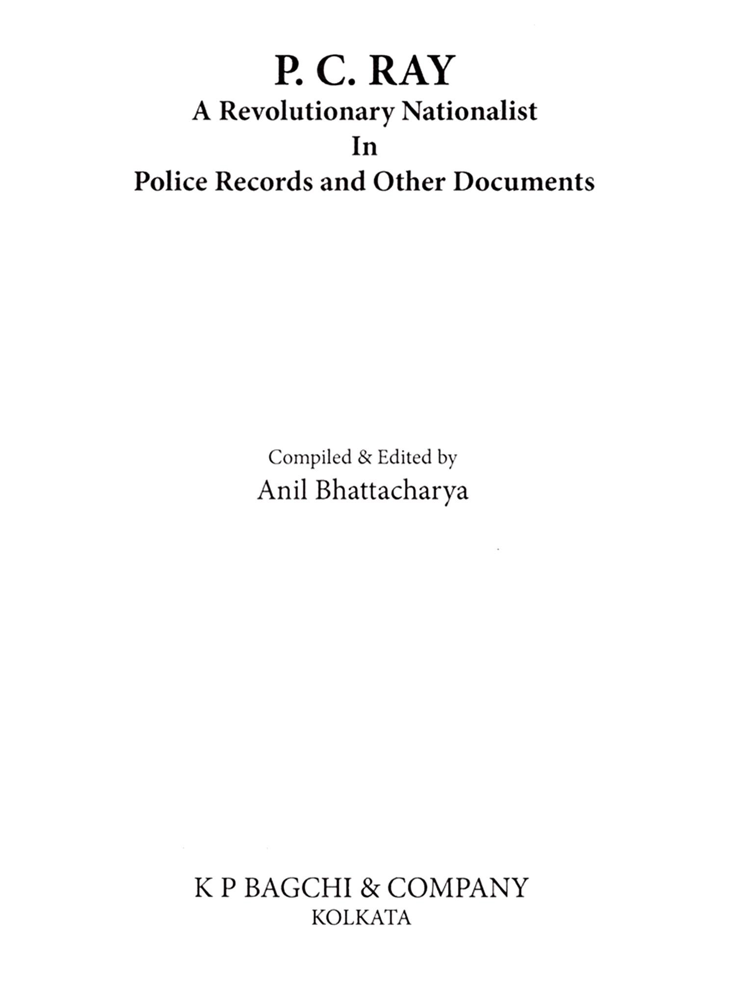 In this book 'P. C. Ray: A Revolutionary Nationalist in Police and other Records the Police and other IB records are collected from the Archives of the Government of West Bengal, Calcutta. I acknowledge the kind permission of the Government of West Bengal to visit the archives and help from the staff of the archives and the officials. Almost two years had been spent for collection of the relevant documents. The other revolutionary references of P. C. Ray are also collected from different sources. I am indebted to the authorities of the libraries eg the National Library, Kolkata, Bangiya Sahitya Parishad, Kolkata, Mahajati Sadan, R.K.M. Institute of Culture, Golpark, Bengal Chemical Library, Sri Chaitnaya Library, Kolkata, and others, for permitting me to collect the relevant documents/materials. Personal collection from well wishers, friends are also acknowledged.