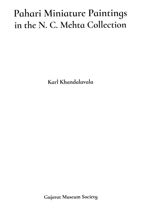 I wish to express my gratitude to Shri Sadashiv Gorakshkar, Director of the Prince of Wales Museum, for the invaluable help he has given me coming twice with me to Ahmedabad for cataloguing and discussions and also taking upon himself a large share of the burden of the production of this volume. I also wish to thank Dr. V. C. Ohri for translating all the inscriptions and Dr. B. N. Goswamy for elucidating several matters in connection therewith. Dr. Usha Bhatia assisted me very ably in extensive documentation and Mrs. Radhika Lalbhai listed all the relevant material from the collection while both helped in various other ways for which I am thankful to them as also to Shri T. Ravindran for his patience in the typing of the text. The colour blocks are themselves their own high tribute to the skill of Mr. Burjor Poonawala and Mr. Dadi Poonawala of the Commercial Art Engravers, the block-makers, while Mr. G. U. Mehta and Miss Katey Cooper of Vakil & Sons, the printers, have spared no pains to maintain their standard of book production for which they are widely known. I thank all of them for their personal interest as friends in all the publication work which they have carried out for me over many years.