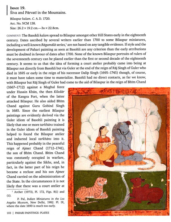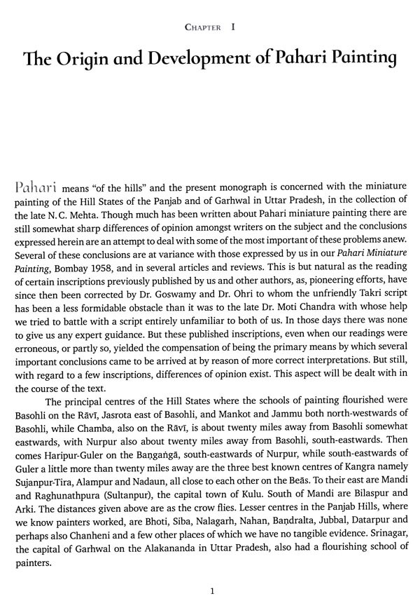 The present volume is not intended to be a history of Pahari Painting. Its primary purpose is to catalogue all the important Pahari miniatures in the N.C. Mehta Collection. However, several sets and individual paintings of significance outside the collection which have a bearing directly or indirectly on the material herein have been discussed. In doing so I have proceeded on the assumption that the reader has a basic knowledge of the subject. The conclusions expressed herein are to be found not only in the several sections which form part of the text but also in the "Comments" relating to individual paintings. It is accordingly necessary to read them in conjunction with each other.