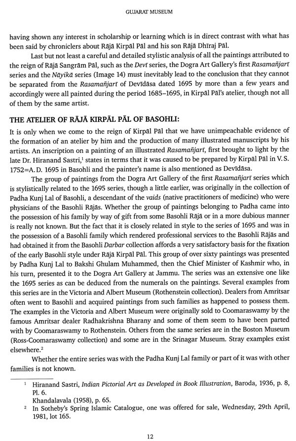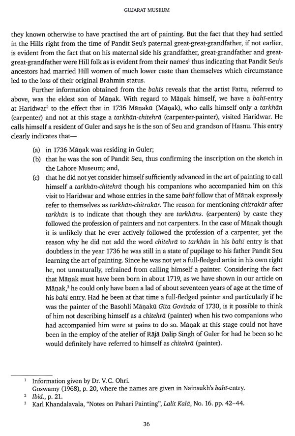 The late Nanalal C. Mehta was one of the pioneers in the field of Indian Miniature Painting. Heir to a long tradition of scholarship in Indological studies maintained by several members of the Indian Civil Service, Nanalal had the eye of an aesthete, the perception of an antiquarian and a sound background of Sanskrit and Hindi literature. Not only did he build up a valuable collection but also published his researches. He brought to light the now famous Vasant Vilas manuscript of the Gujarati School as also the Guler Gita Govinda series of the Tehri-Garhwal Darbar. Moreover, he established that the colophon of the Lahore Museum's Basohli Gita Govinda set was the original one dated 1730 and that the colophon on the Guler series was a copy. His Studies in Indian Painting, Bombay, 1926, brought to the notice of scholars a wealth of material, hitherto unknown, particularly the splendid miniatures in the collection of the late Sitaram Sah of Varanasi. But his most exciting discovery was the Chaurapanchasika miniatures now published in a handsome volume by his talented daughter Leela Shiveshwarkar. When he died in May 1958, his collection passed into the hands of his wife, the late Mrs. Shanta Mehta, who generously decided to donate the most important part of it to the Gujarat Museum Society, Ahmedabad, so that it should remain a fitting tribute to her husband's work of a lifetime. This collection has recently been added to by his daughter Leela Shiveshwarkar from paintings belonging to her father thus further enhancing its importance.