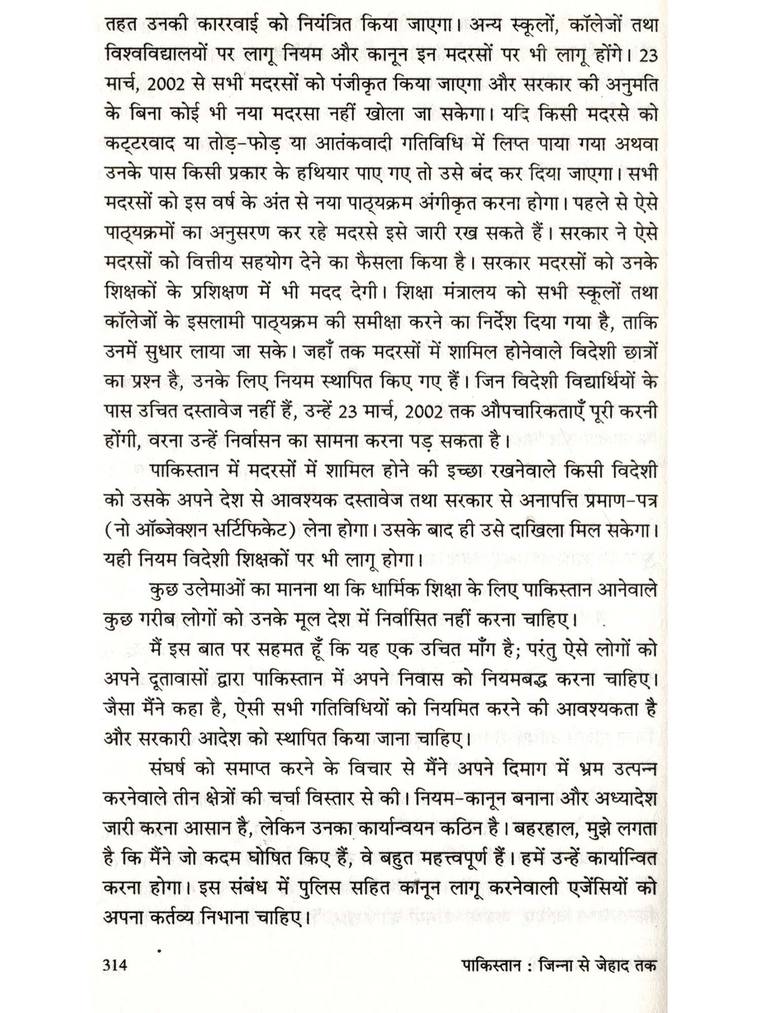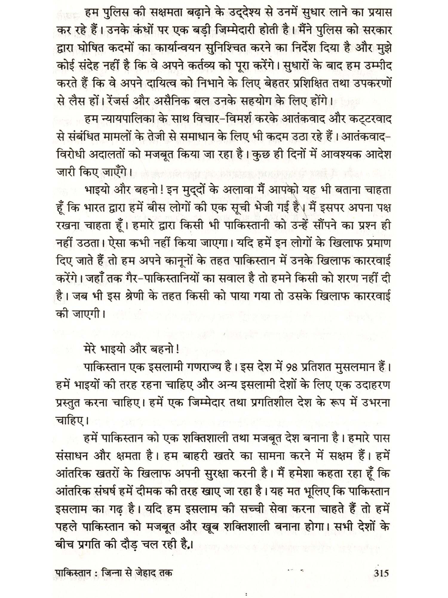 12 जनवरी, 2002 को दिए गए अपने ऐतिहासिक भाषण में जनरल परवेज मुशर्रफ ने घोषणा की कि कश्मीर पाकिस्तानियों के खून में है। हालांकि यह अच्छी भाषण-कला का उदाहरण हो सकता है, परंतु तथ्य सर्वथा भिन्न हैं। वास्तव में सिंध और बलूचिस्तान के पाकिस्तानी लोग कश्मीर के मामले में उतने ही उदासीन हैं जितना दक्षिण भारतीय वन दस्यु वीरप्पन अमेरिकी घटनाओं पर होगा। जिन्ना से लेकर मुशर्रफ तक सभी पाकिस्तानी शासक निरंतर यह समझने में असमर्थ रहे हैं कि पाकिस्तान भारतीयों, विशेषकर उत्तर भारतीयों, के खून में दौड़ता है। क्या यह बात भारत सरकार को पाकिस्तान में वह सब करने की अनुमति देती है, जो पाकिस्तान पंजाब, जम्मू-कश्मीर और भारत के अन्य भागों में करता रहा है? निश्चित रूप से नहीं। और यदि कभी भारत सरकार ने यह निर्णय कर लिया कि पाकिस्तान को उसकी भाषा में ही जवाब देना है, तो पाकिस्तान के लिए अपना अस्तित्व बचाना बहुत ही कठिन हो जाएगा। भारत दो दशकों से पाकिस्तान द्वारा प्रायोजित सीमा-पार आतंकवाद के हमलों को झेलता आ रहा है। यदि भारत पाकिस्तान के नीति-निर्माताओं को उनकी ही दवाओं का स्वाद चखा दे तो पाकिस्तान चूर-चूर हो जाएगा। किसी राष्ट्र की बुनियाद ही जब नफरत पर रखी गई हो तो उसे ऐसे परिपक्व राजनीतिज्ञों की आवश्यकता होती है, जो अगली पीढ़ी के बारे में सोचें, न कि क्षीण दृष्टिवाले राजनेताओं की, जो केवल अगले चुनाव के बारे में सोचते हैं। यह पाकिस्तान का दुर्भाग्य है कि वहाँ हमेशा सत्तालोलुप राजनीतिज्ञों और जनरलों का गठजोड़ देखने को मिलता है, जो देश की सेवा से अधिक सत्ता में अपना स्थान स्थायी बनाने में रुचि रखते हैं।