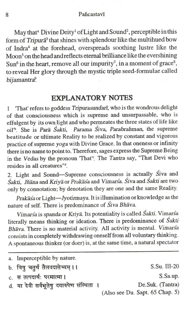 Sakta school holds advaita as the ultimate Reality in an equal perspective with Kashmir Saiva Mysticism and of the same ideal as that of the monistic Vedanta. This is evident from the sacred and mysterious monosyllable (Pranava) attributed to each Thought and consisting of the corresponding seed-letters (bijaksara). The Pranava of Vedic thought is AUM. Correspondingly, the Tantric Pranava of Saiva and Saktaschools are 'Aham' and 'Hrim' respectively. Since all the pranavas or bijaksaras end in the Bindu, it is natural that the Bindu or Anusvar is the material cause for all the factors. It is the unconditional Brahman or the all- pervading Supreme Truth from which emanate all the conditional entities. Para-Bindu is the immeasurable entity into which all this manifestational phenomenon finds repose. This power of creation and absorption, quite inseparable from its holder Siva, is called Sakti. The magnificence, grace and beauty of this primordial Power make up eternal bliss. In consequence, there is a latent agreement among all mankind and this truth must be the one we seek. Accordingly, religions in general are at one with each other. Each has a philosophy antagonistic to the special dogma of the• other. The Vedic Rsis have already declared: "That Brahman is surely different from the known, and again, It is above the unknown- such was the utterance we heard of the ancient ' teachers who explained it to us". The Pancastavi manures growth in consciousness to that sublime Truth.