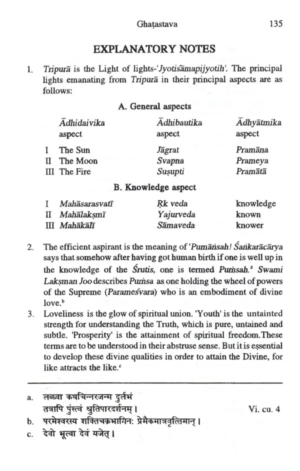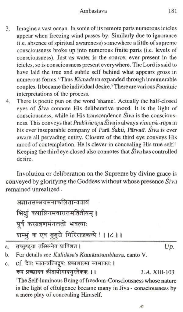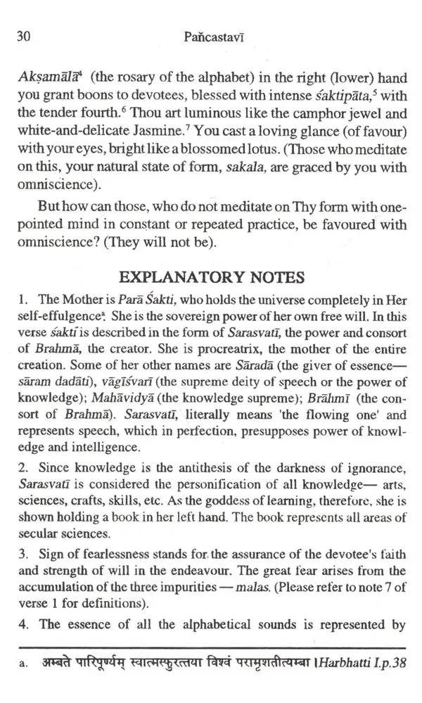Pancastavi is an ancient work of more than a thousand years of vintage, addressed to the Supreme Mother of the Universe, Mahatripurasundari. The Hymn consists of five laudations, each with its distinct theme: Laghustava (21 verses) highlighting the dynamic power of the Goddess; Carcastava (31 verses) reflective in substance; Ghatastava (24 verses) speaking of the creative Sakti on the threshold of manifestation: Ambastava (32 verses) invoking the Goddess as the benign Mother: Sakalajananistava (38 verses) celebrating the glory of the Source of All. The verses are cast in various metres and like most of the ancient hymns are prayers of devotion, simple in appearance but carrying a power that communicates only to the receptive in soul. It is easy to miss the real import of these hymns while admiring the poetic excellence of the compositions. Fortunately, however, by the grace of the Devi some adepts have been moved to experience and bring out the inner meaning of these deceptively simple poems. We are fortunate that a genuine sadhaka-scholar of the eminence of Sri Jankinath Kaul has chosen to comment on these verses. With his unusual background of the combined knowledge of the traditions of the Veda, Vedanta, Tantra, elements of all these approaches, he has laid bare the esoteric content of each verse with amazing insight and authentic expression. One often comes across the question why the physical details of female anatomy come to be described repeatedly in our spiritual classics. Kaulji has a simple answer: each limb of the Divine Mother represents a particular power of manifestation. Right from the Vedic age, mystic truths are expressed to the common mind in the form of symbols of physical images. Our commentator has tapped for the benefit of our spiritual enlightenment an immense reservoir of yogic experience with meticulous accuracy and unfailing depth. Without his explanations and hints one would surely miss the precious content of knowledge and experience that is embedded in the Pancastavi. To cite a few of these expositions of moment to the spiritual seeker: