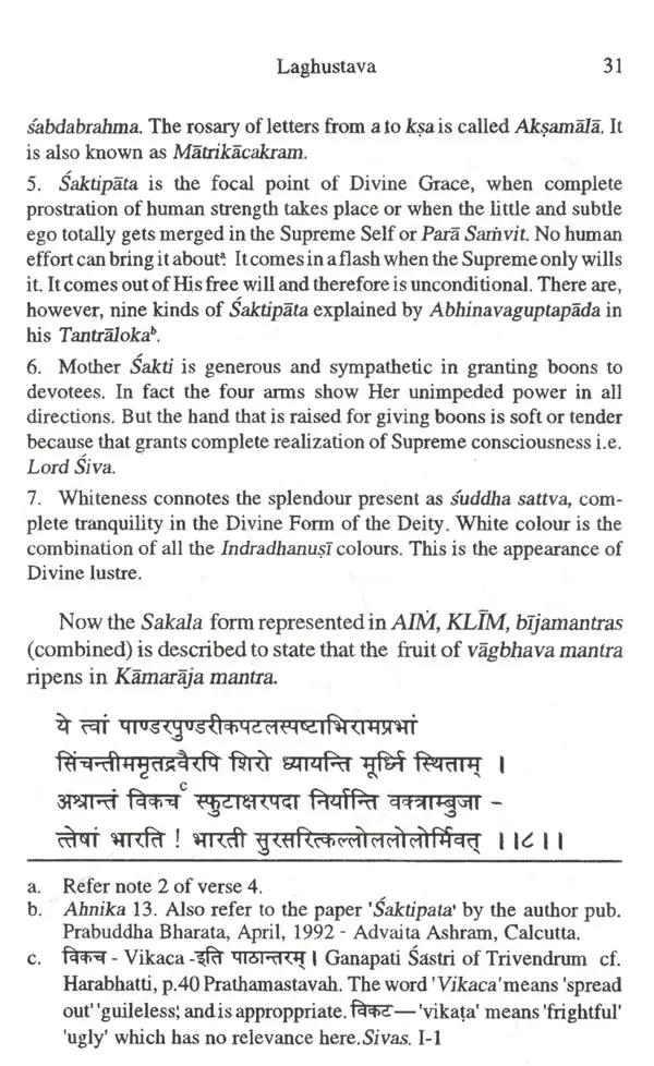 The text comprising one hundred and forty-six Sanskrit verses of different metres, adopts a graded approach to the domain of Para Sakti through Kundalini Yoga. The notable factor in the first three hymns is that activity and knowledge aspects of this phenomenal world are traced to the volition aspect of the Deity in devotional mood, befitting a loving child who approaches its ever vigilant mother in any and every circumstance on the earth. This mode of Mother-worship has a universal appeal. Divine Grace (anupaya) is invoked in the fourth hymn and in the fifth hymn is revealed Divine union-the unquestionable oneness (anuttara) of Supreme Beauty with perennial joy.
