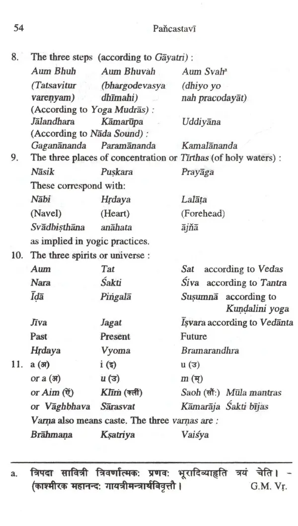 Three-dimensional immanence (III. 1): Causal, subtle and gross; knower, known and knowledge; Pasyanti, Madhyama and Vaikhari; sleeping, dreaming and waking states; Agni, Surya and Soma; Prana, Apana and Samana; Susumna, Pingala and Ida; Future, present and past; Tamas, Rajas and Sattva; Svah, Bhuvah, Bhur.