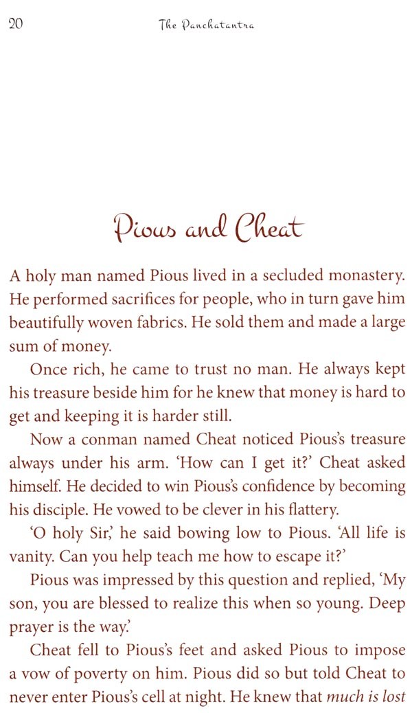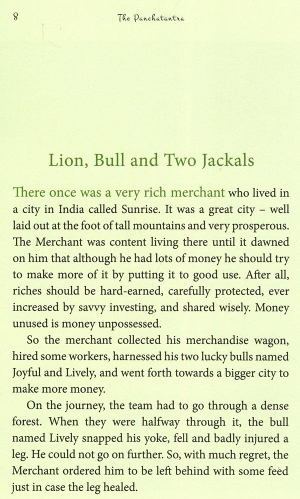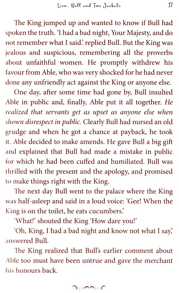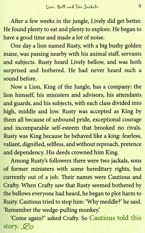 Each story, or group of stories, is separated into the frame story of the Lion, Bull and two Jackals, and the stand-alone or nesting stories that illustrate the lessons of the frame story. The frame story presents the do's and don'ts of life and is told on the coloured pages while the stand-alone stories in coloured text on white pages illustrate the point or lesson articulated in the frame story. This arrangement helps the reader to choose to read or ignore the frame stories that deal with life lessons. The frame story can be read without interruption of the illustrating stories. The book can be read in its entirety to experience the original design of this book of stories.