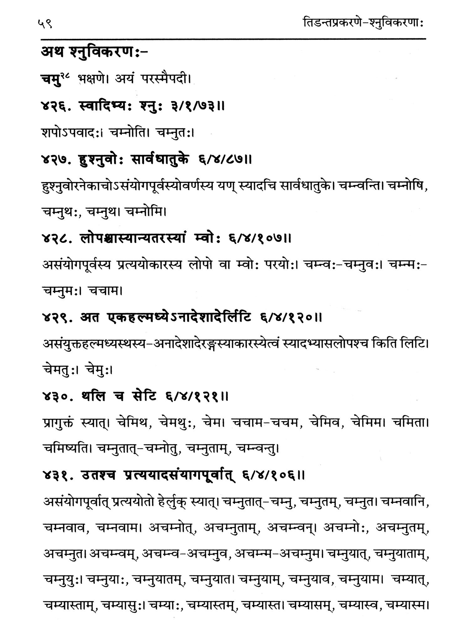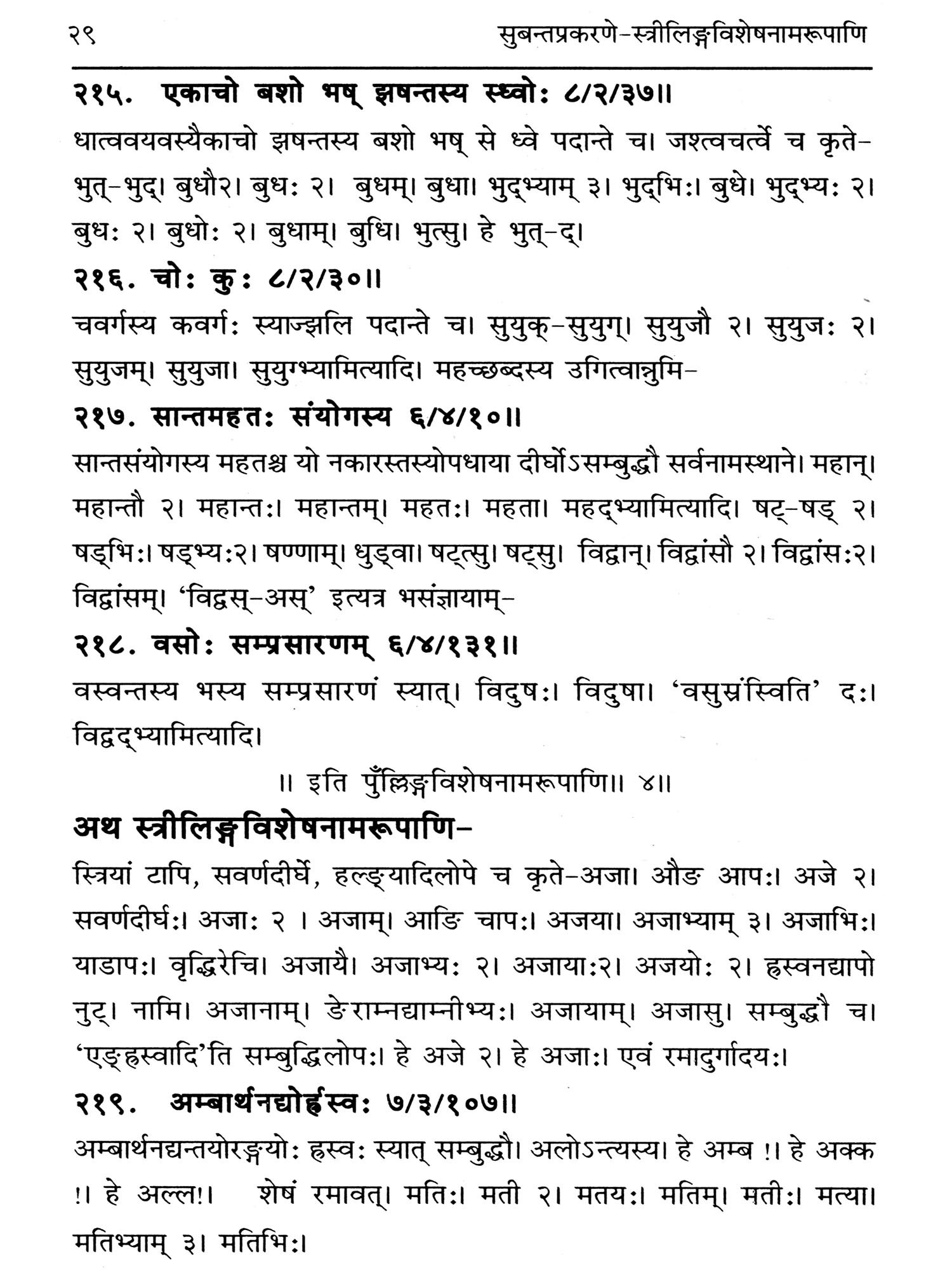 इस ग्रन्थ का प्रारम्भ संज्ञाप्रकरण से होता है जिसे चार घाटों में विभाजित कर वैज्ञानिक ढंग से सरलतम रूप में सुस्पष्ट उपस्थापित किया गया है। इस प्रकरण में स्वरों के मात्र तीन भेद ह्रस्व, दीर्घ, प्लुत ही दर्शाये गये हैं, तथा बाह्य प्रयत्नों को नहीं दर्शाया गया है। संज्ञा प्रकरण को पढने के बाद छात्र के मन में ग्रन्थ के प्रति उत्साह और आत्म विश्वास जाग्रत हो उठता है, जिससे छात्र आगे के प्रकरण अच्सन्धि, प्रकृतिभाव, हल्सन्धि, विसर्गसन्धि पर्यन्त शीघ्र ही विना किसी रुकावट के विषय के प्रति अपना धैर्य तथा रुचि स्थापित कर आत्मविश्वास के साथ सुबन्तप्रकरण में कब प्रवेश पा जाता है इसका पता ही नहीं चलता। इस प्रकरण में एकशेष करने की प्रक्रिया को नहीं दिखाया गया है क्योंकि एकशेष से पहले द्वन्द्वसमास आदि की समस्या पैदा होती है, अतः इसका उल्लेख इस ग्रन्थ में नहीं किया गया है। सुबन्तप्रकरण में पहले सर्वनाम तत्पश्चात् विशेषनाम को पुल्लिंग, स्त्रीलिंग, नपुंसकलिंग इन तीनों लिंगों में विभक्त कर क्रमशः दर्शाया गया है। तथा इस प्रकरण में मात्र १७ सर्वनाम शब्द ही दर्शाये गये हैं जो सामान्यतः प्राथमिक व्यवहारोपयोगी तथा आवश्यक माने जाते हैं।