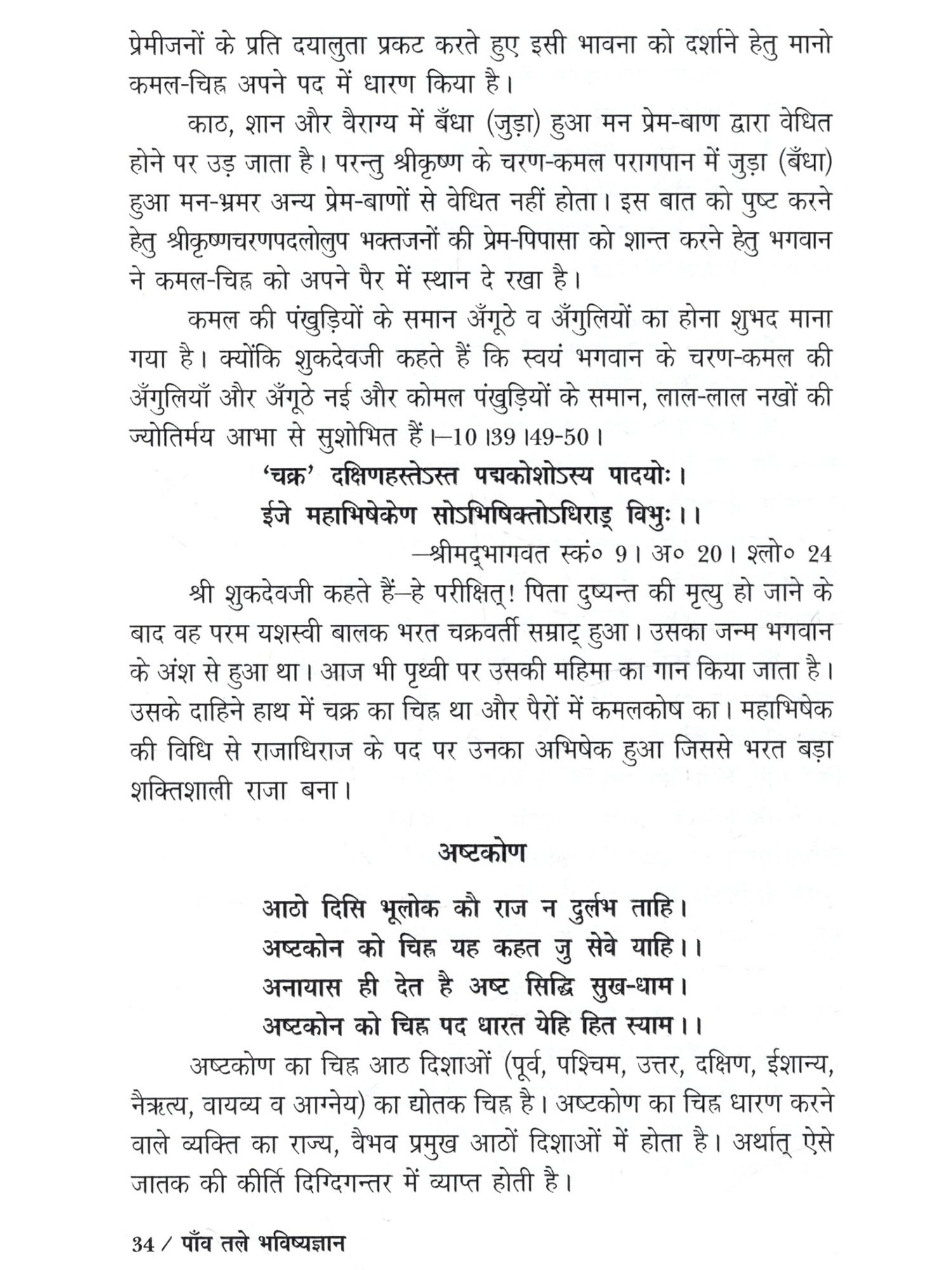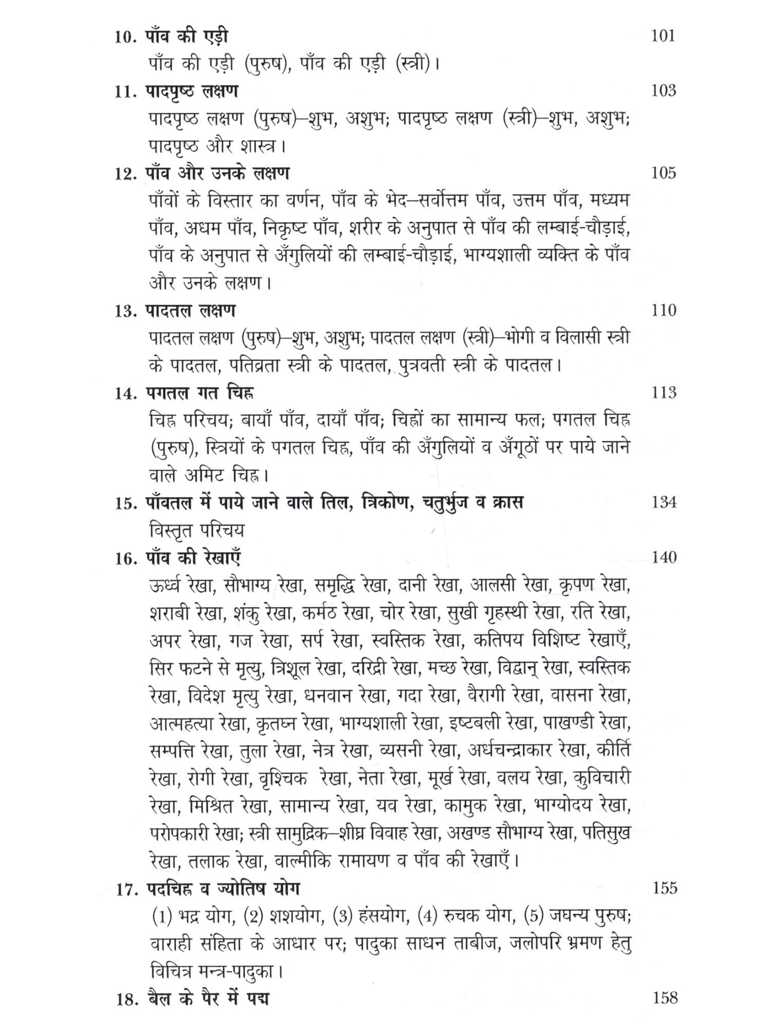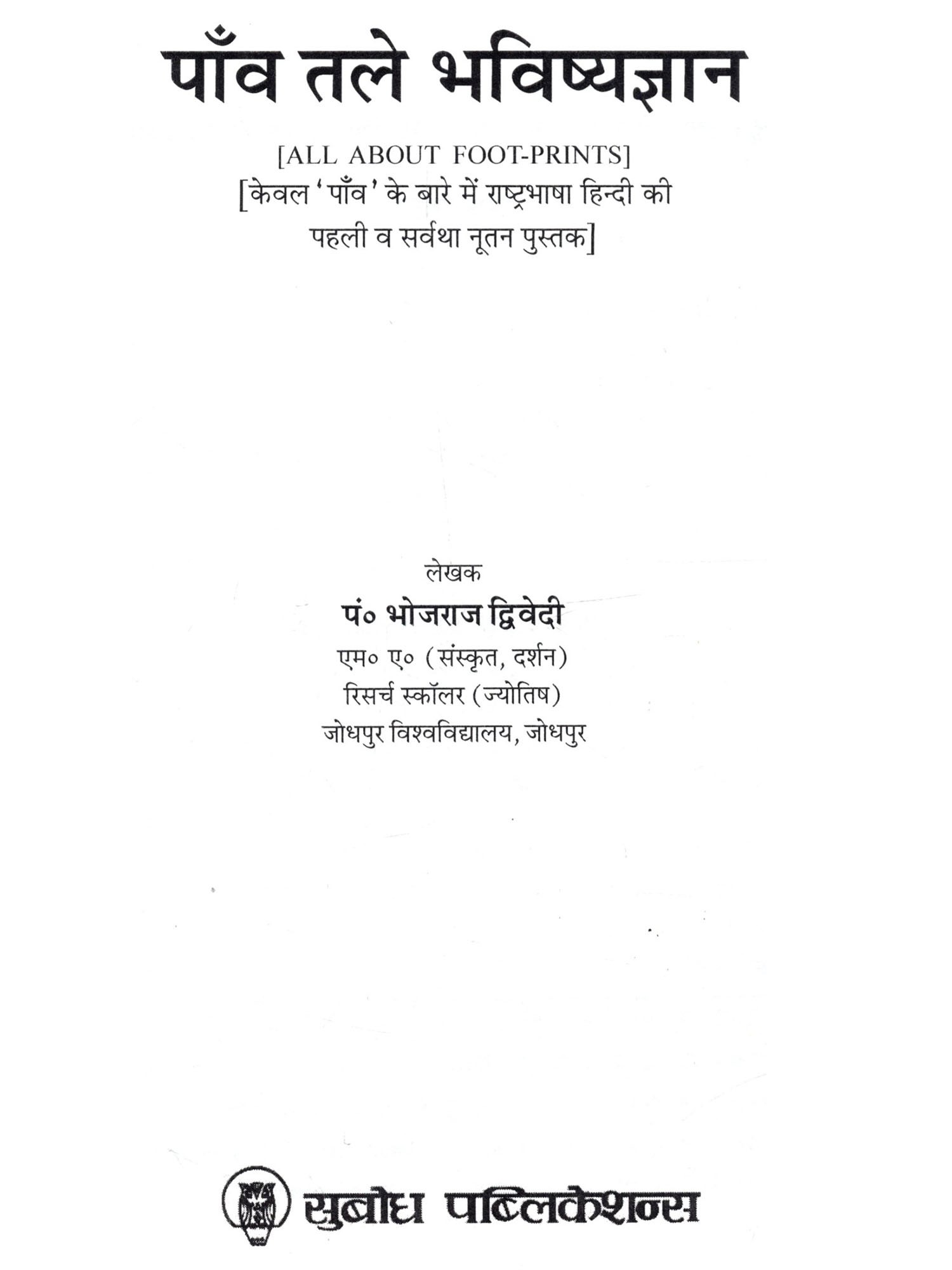 पाँव तले भविष्य ज्ञान जहाँ ज्योतिष साहित्य में विद्वानों ने एक-एक शाखा पर, एक-एक विधा पर अनेक ग्रंथ लिखे, वहाँ पाद रेखायें, पैरों के तले ही कुचली की कुचली रह गई। शास्त्रीय धरातल पर आधारित, आधुनिक वैज्ञानिक सर्वेक्षण के साथ... पाँव के सांगोपांग अध्ययन पर, लिखी गई विश्व इतिहास की पहली पुस्तक, अनेक आकर्षण ब्लाकों व चित्रों के साथ।