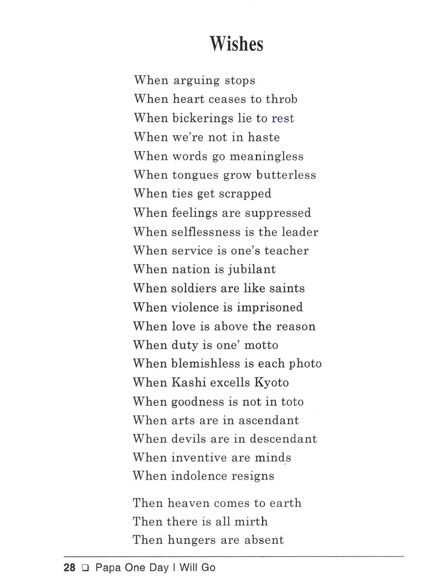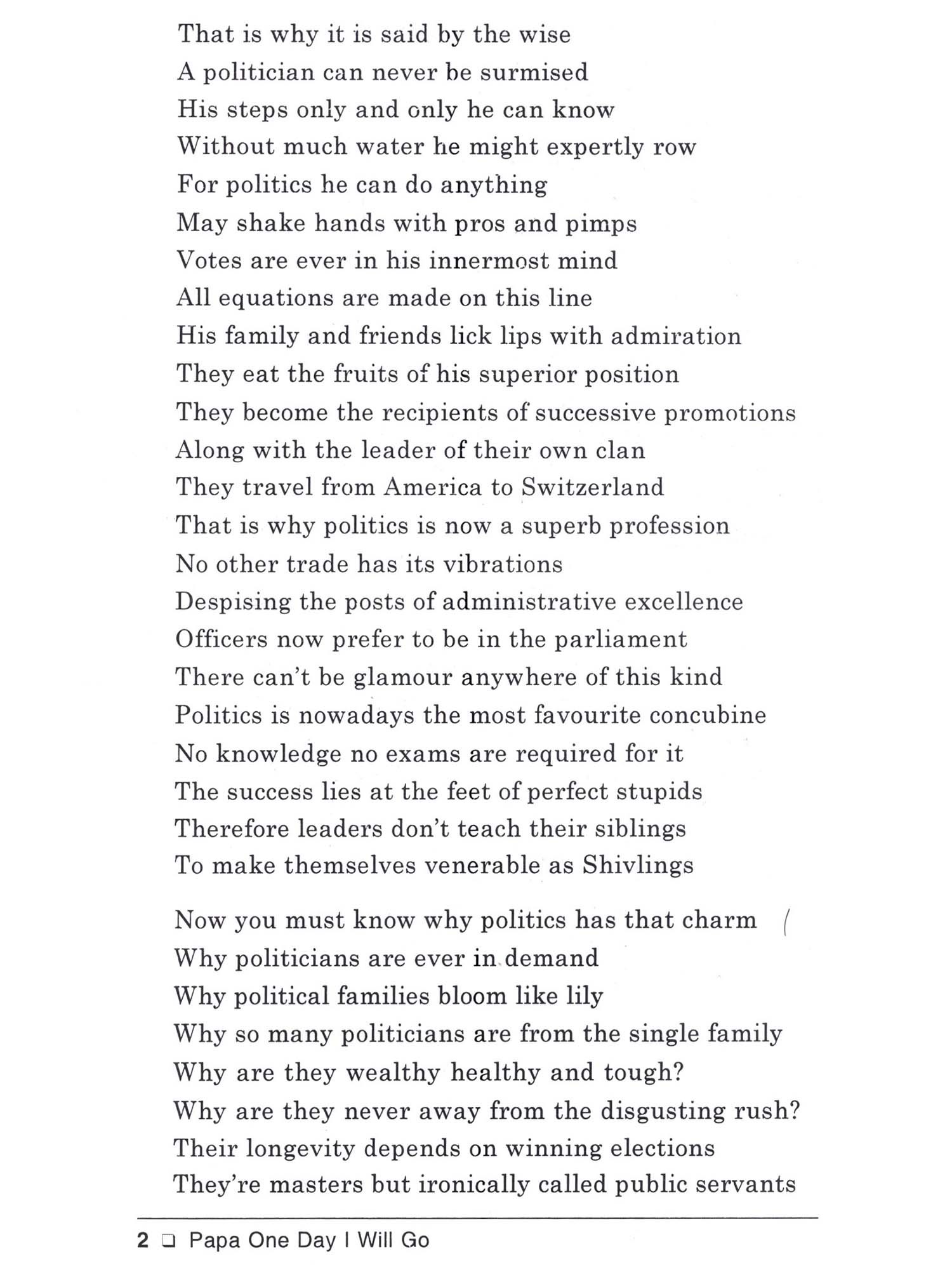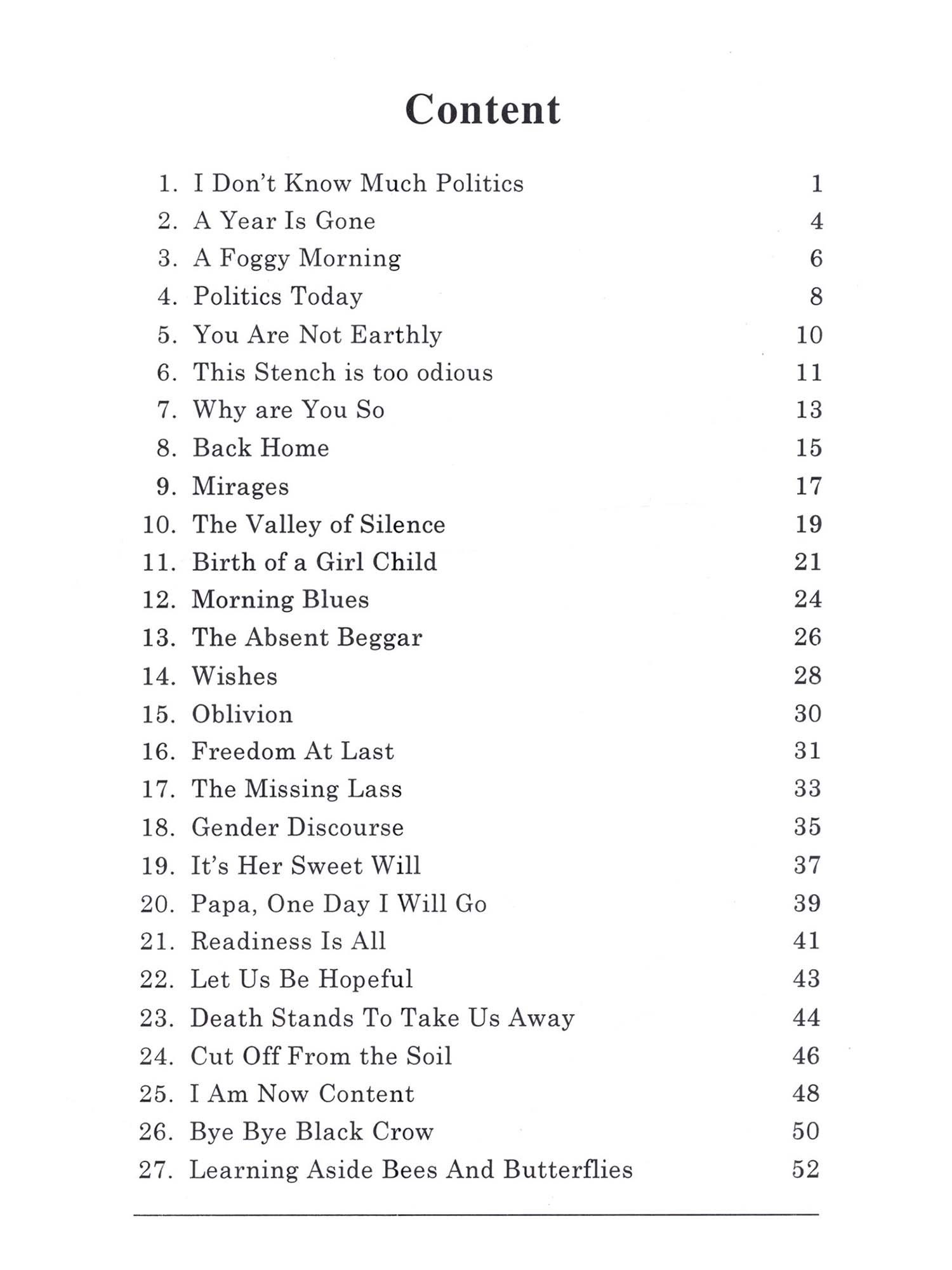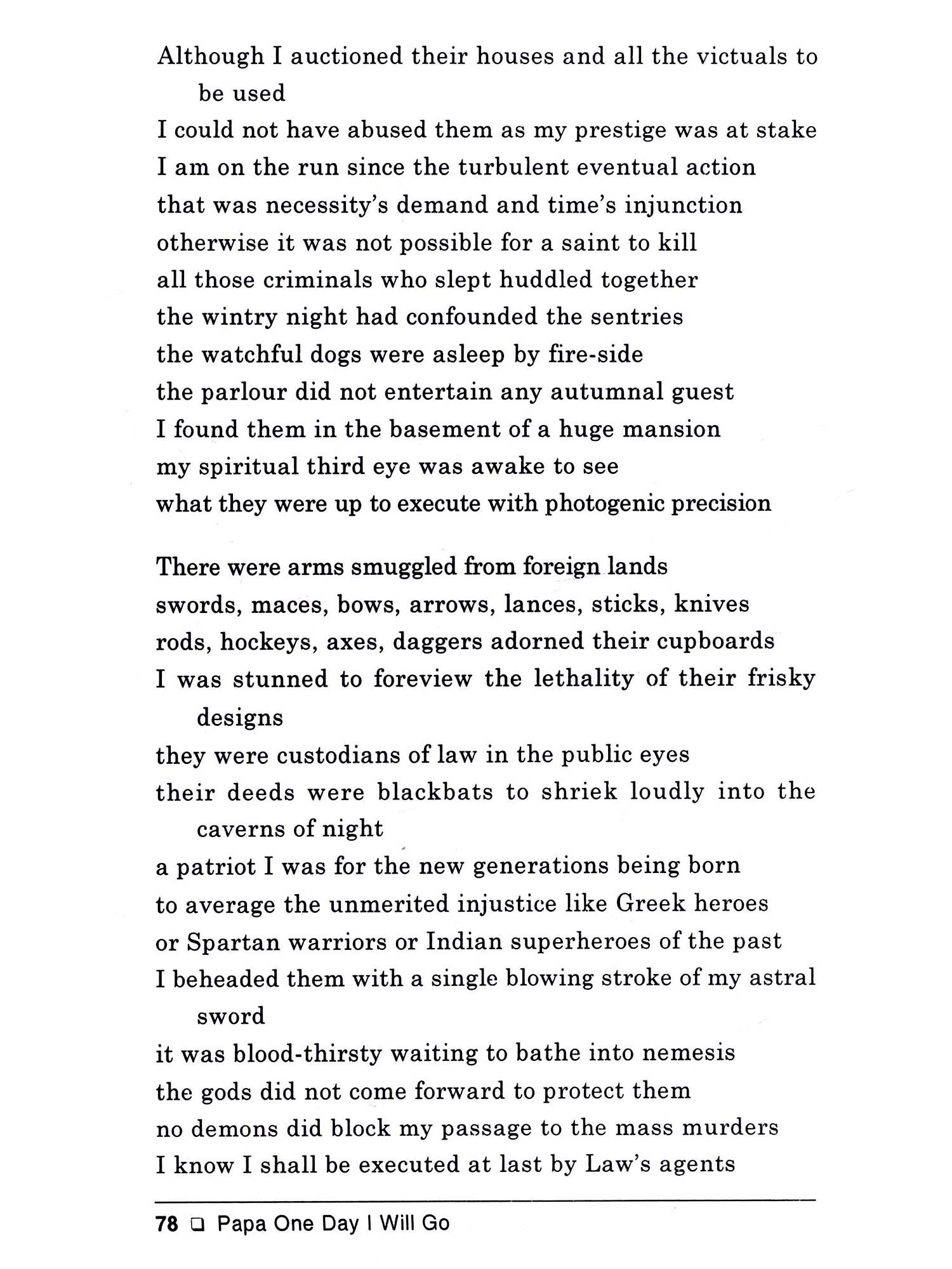 Papa, One Day I Will Go is my sixth collection of English poems. These poems incorporate my ideas of life and the world. The medium of poetry offers the writer to utter his views most precisely. Among all the genres of literature poetry is most spontaneous and close to the heart. The sentiments expressed in the text of a poem directly touch the strings of our hearts. Be it related to any theme, the poem tries to unfold the truth which is often under the cover of false and misleading declarations. The duty of a poet is to let the public know what the truth is. Poetry enables the reader to recognise not only the truth but also his own true being. The theme of poetry is as vast as the universe itself. As W.H. Auden said in one of his essays that anything between earth and heaven could be the subject matter of poetry. It's so ture. We read poems which are composed on diffirent topics. They record the perception of the poet most truthfully. A poet is an average human being with extrordinary vision and skills to express his perceptions with the help of words, symbols and facts of life. His objectives are to make the readers aware of the realities of life. His expressive capabilities make him unique and uncommon. What goes mostly ubobserved by the common men and women comes automatically within the purview of the poet. Without getting didactic, he presents his opinion remaining unbiased and truth-oriented. He awakens the dormant sensibilities of his readers. He is not disinterested and depersonalised. Rather he is very much interested and his personality is artistically reflected through the text of his poems. There is no harm if the poet is interested in what he is speaking to the readers. This increases his credibility. His interest is to make the reader awakened to the hard realities of life. In the poem entitled 'A Year is Gone', the poet looks at the death of a year from a different perspective. Years come and go as usual in a routine way. Poeple celebrate the New Year by bidding goodbye to the old one. But the persona in this poem finds the death of a year nothing but an illusion. The way he thinks of the death of a year is most significant: Death of a year is simply an illusion It is created to mitigate temporal confusion Minutes, days, weeks, years and millennium Are nothing but our intellect's inventions That's why it's futile to make fuss Over an issue that is not in syllabus Instead of getting depressed over the death of the bygone year, the poet exhorts his readers to enjoy life as it is there before them. The final lines unfold the poet's views most conspicuously. "The passion for living', in the opinion of the poet, is 'in itself a reward' whereas other considerations seem to him 'a tale most absurd'. The poetic persona in the poem 'A Foggy Morning' is ready to go for his daily morning walk but the onset of the dense fog prevents him to step outside.
