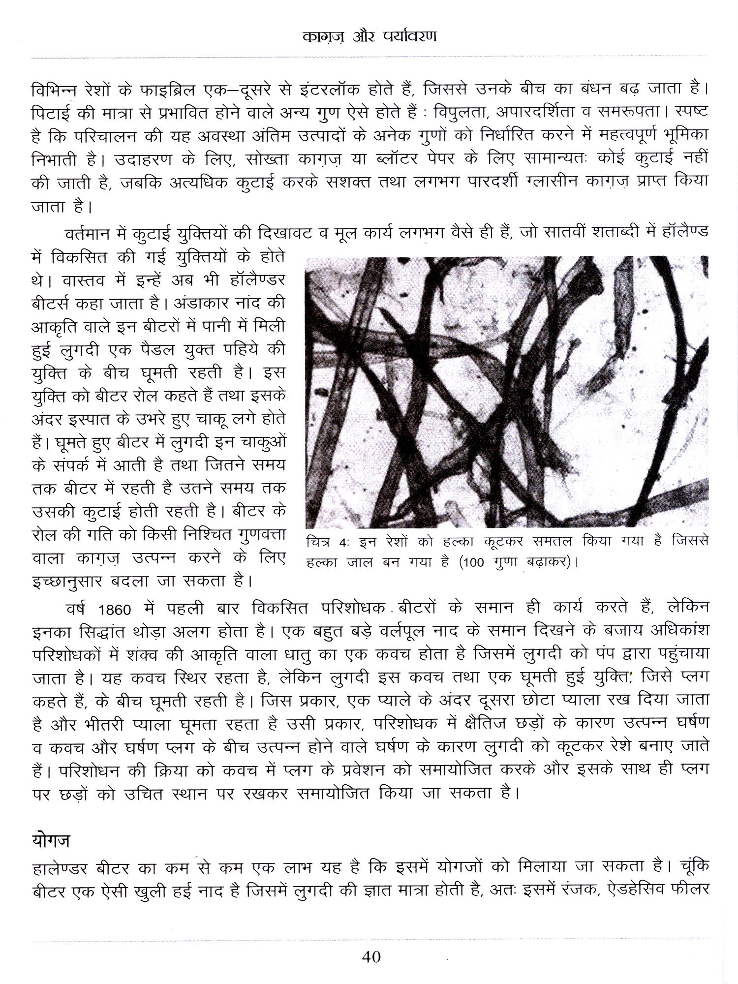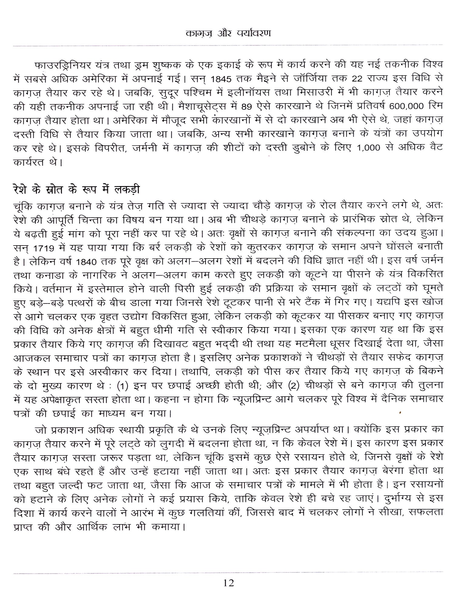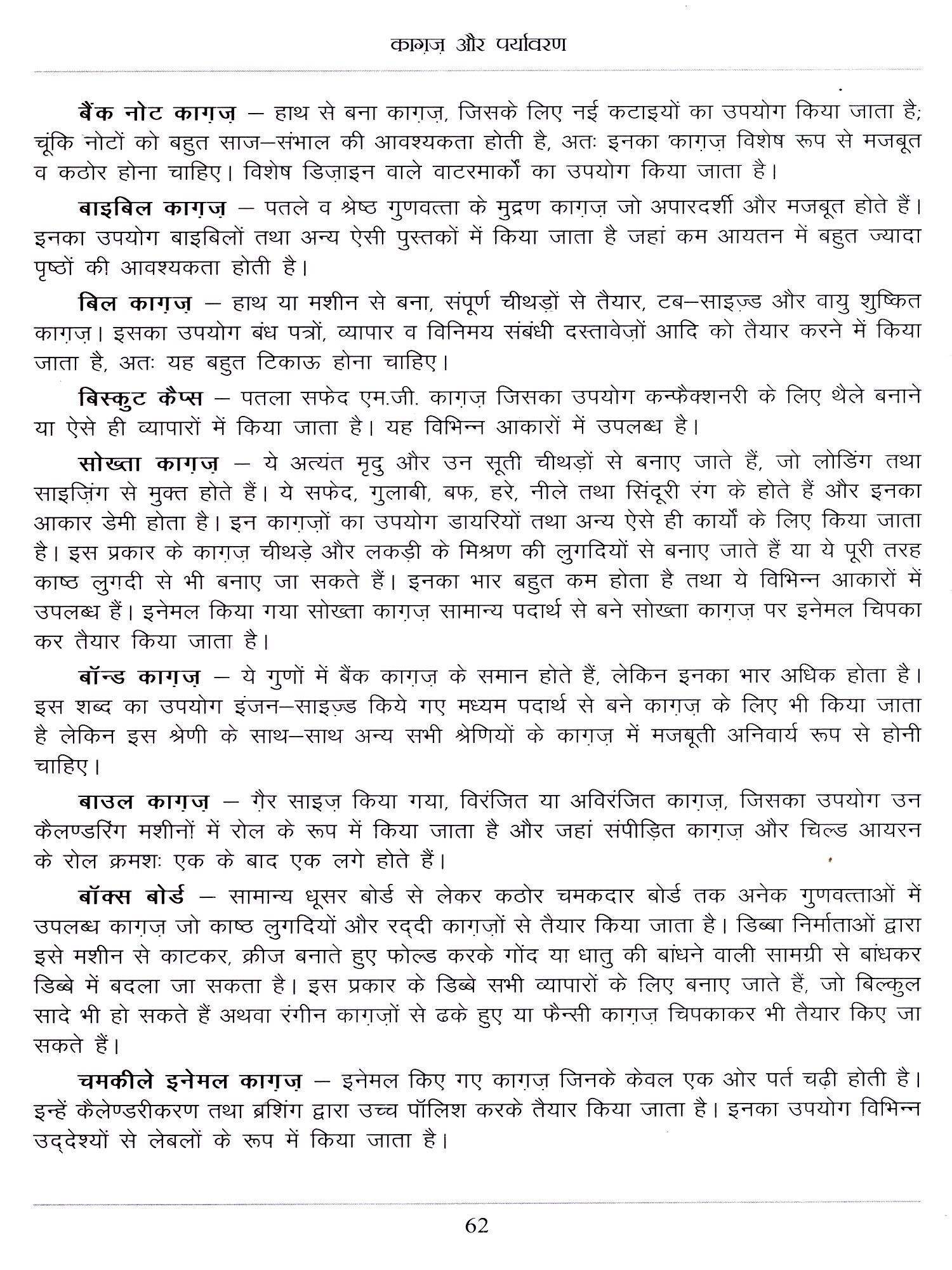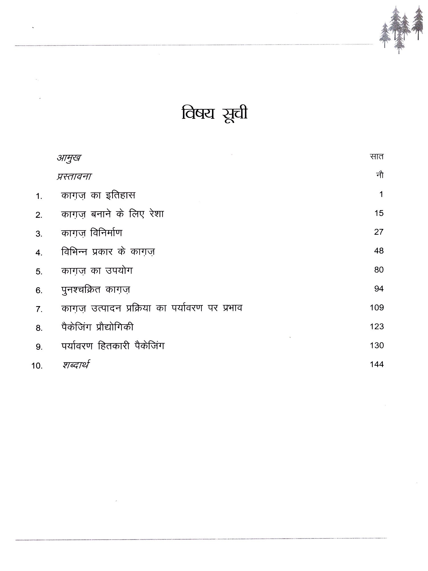 इस पुस्तक को सात भागों में बांटा गया है। जैसे कागज़ का इतिहास, कागज बनाने के लिए रेशा, कागज़ विनिर्माण, विभिन्न प्रकार के कागज, कागज का उपयोग, पुनश्चक्रित कागज, कागज़ उत्पादन प्रक्रिया का पर्यावरण पर प्रभाव, पैकेजिंग प्रौद्योगिकी व पर्यावरण हितकारी पैकेजिंग। पुस्तक में उच्च गुणवत्ता वाले व सरल चित्रों के माध्यम से प्रौद्योगिकी को दर्शाने का प्रयास किया गया है। मेरा हमेशा यही सपना रहा कि मुद्रण प्रौद्योगिकी से संबंधित पुस्तकें हिन्दी में लिखी जाएँ ताकि हिन्दी भाषी क्षेत्र के पाठकों और खासतौर पर विद्यार्थियों को तकनीकी ज्ञान को समझने में मदद मिल सके।