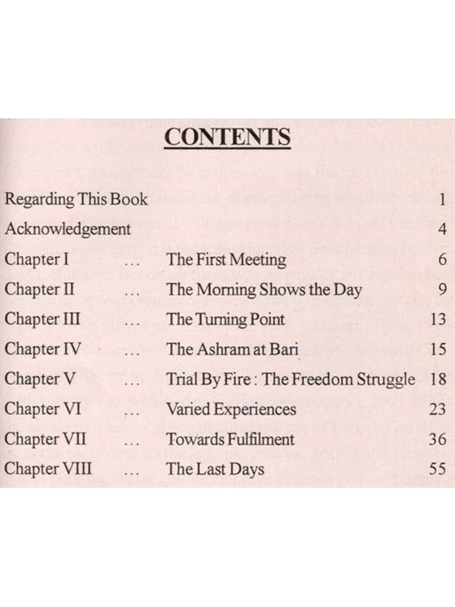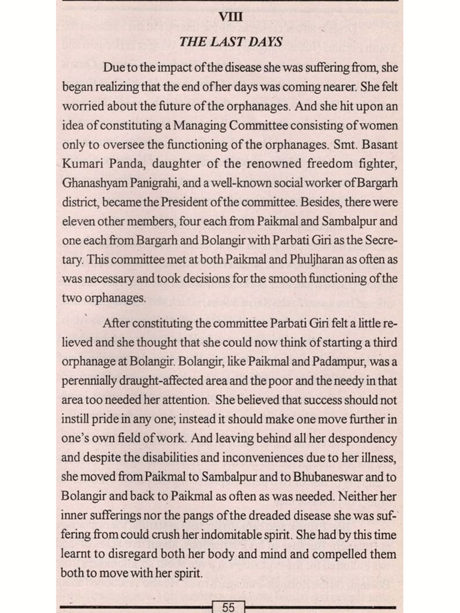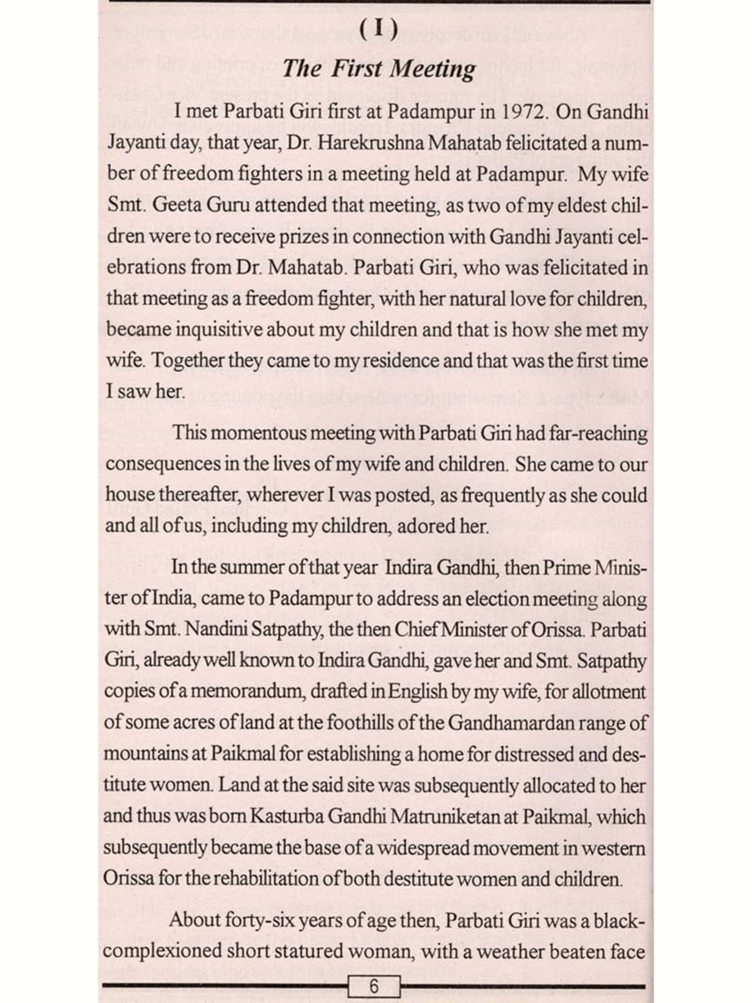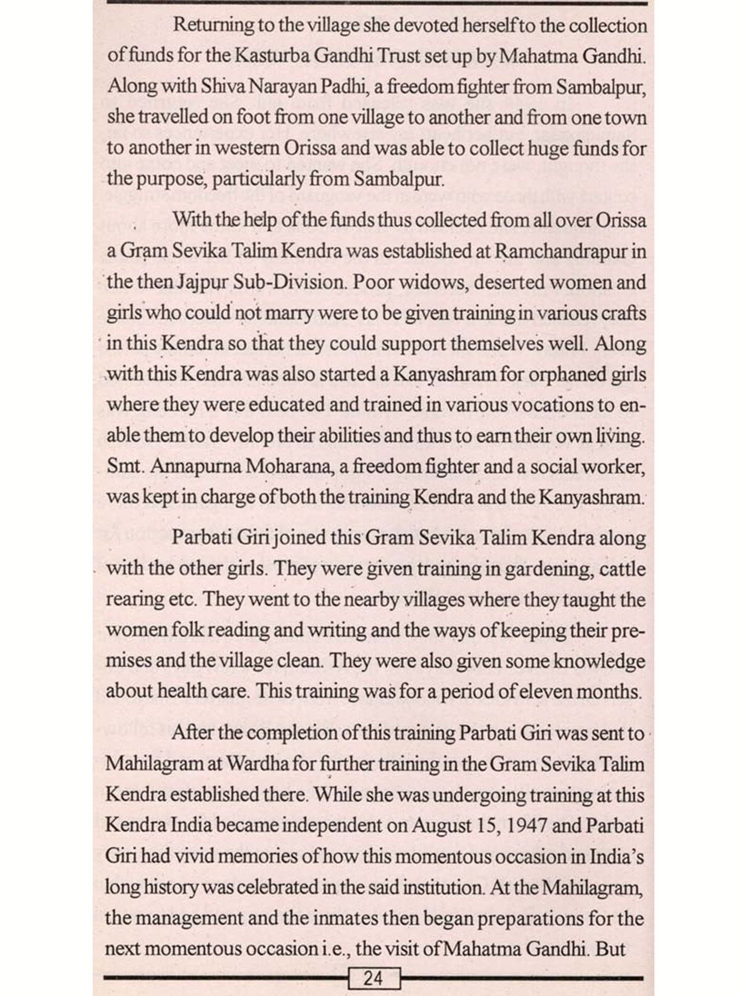 I am beholden to write a few lines in a book which speaks of the self-less life and living of a great freedom fighter and noble woman leader of our country, Late Parbati Giri. She was born in a village called "Samalai Padar" in the Bargarh sub-division of undivided Sambalpur district on 19th January, 1926. She belonged to a middle-class family, but her father was a Gountia, the headman of the village. Parbati Giri was born at a time when the Freedom Movement of the country was gaining momentum under the charismatic leadership of Mohandas Karamchand Gandhi. Parbati came to prominence when she left home at a very young age and joined "Gandhibadi Parivar". During Quit India Movement, she captured the court of the S.D.O., Bargarh and was imprisoned for two years. She refused to write a bond not to partici-pate in the freedom movement while in jail. In Sambalpur Jail, she came in contact with another dedicated freedom fighter Late Prabhabati Devi. Her association with this great lady resulted in tremendous transformation in their personalities paving the path towards self-less social service. After independence, Parbati Giri stayed in Wardha Ashram of Mahatma Gandhi for some time and learnt the quality of self-abnegation.