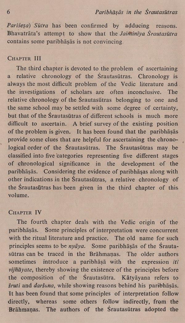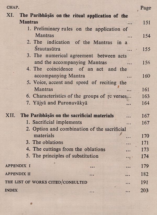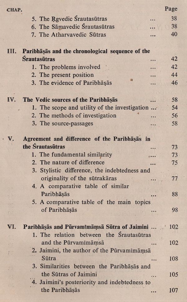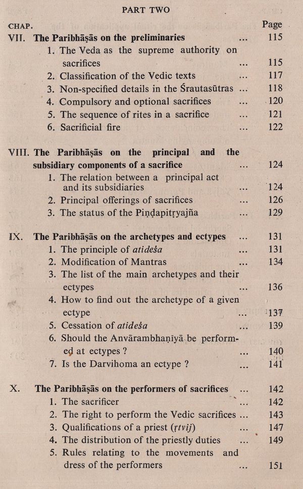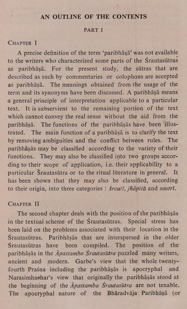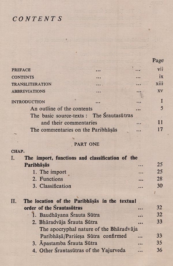 The present work aims at a study of the canons of interpretation known as paribhaṣa laid down in the principal Srautasutras: their nature, origin, development and contents. It is a revised version of the dissertation entitled "The Paribhaṣas in the Srautasutras-A Study", accepted by the University of Calcutta for the award of Ph.D. Degree. The volume comprises twelve chapters, numbered in one arithmetical sequence and grouped in two parts. Part one deals with the nature, origin and development of the paribhaṣas and part two deals with their contents. This study concerns itself with the sutras characterized as paribhaṣa. The term paribhaṣa was not well-defined and it appears that no definition was strictly adhered to when the sutras were characterized as paribhaṣa. Not only the basic interpretative clues, but also the general rules were regarded as paribhaṣa. They contain some heterogeneous topics, and some insignificant rules too crept into the paribhasas. Greater emphasis has been laid on the authors of the creative period, who may reasonably claim originality in codifying the paribhapas. The collections of the local libraries are too poor to keep us abreast of all the significant publications. Most of the foreign publications, particularly those in languages other than English, are only titles for us. There is every possibility, therefore, that some relevant works have missed my notice. If any such reference is missing, it is neither intentional nor out of dis- regard for the merit of the work; the omission is due to the deplorably inadequate facilities for Vedic research here. This is also the reason why in some cases editions other than the standard ones of the texts have been referred to. It is a matter of regret that there is not a single centre of Vedic studies in the whole of eastern India. To the authorities, both ancient and modern, whose relevant works have been used by me, I wish to express my debt. I am grateful to my esteemed teacher Dr. Krishnagopal Goswami Shastri (formerly Ashutosh Professor & Head of the Dept. of Sanskrit, Calcutta University) for his kind supervision of my work and valuable suggestions. I take this opportunity of expressing my gratitude to my teachers, Shri Sachindranath Ghose Shastri (formerly Head of the Department of Sanskrit, Krishnath College, Berhampore), who made me acquainted with the Vedic texts for the first time in my college days, and Shri P. N. Pattabhiram Shastri (formerly Reader in Sanskrit, Calcutta University), who instilled in me the interest in the Srautasutras. I am indebted to Dr. Asko Parpola, Dr. Klaus Mylius and Dr. C. G. Kashikar for reprints of some of their publications. My cordial thanks are due to Pundit Madhusudana Vedanta- Sastri, Librarian of the Sanskrit Sahitya Parishat, Calcutta, for his ungrudging help. The publication of the present volume was much delayed for various reasons. I am thankful to Sri Shyamapada Bhattacharya of Sanskrit Pustak Bhandar for undertaking the publication and to Sri Suresh Dutta of Modern Printers and his staff for their cooperation. I regret the misprints that might have occurred because of inadvertence. Scholars will lay me under obligation if they kindly favour me with their valuable suggestions and criticism which will be very useful for my future work.