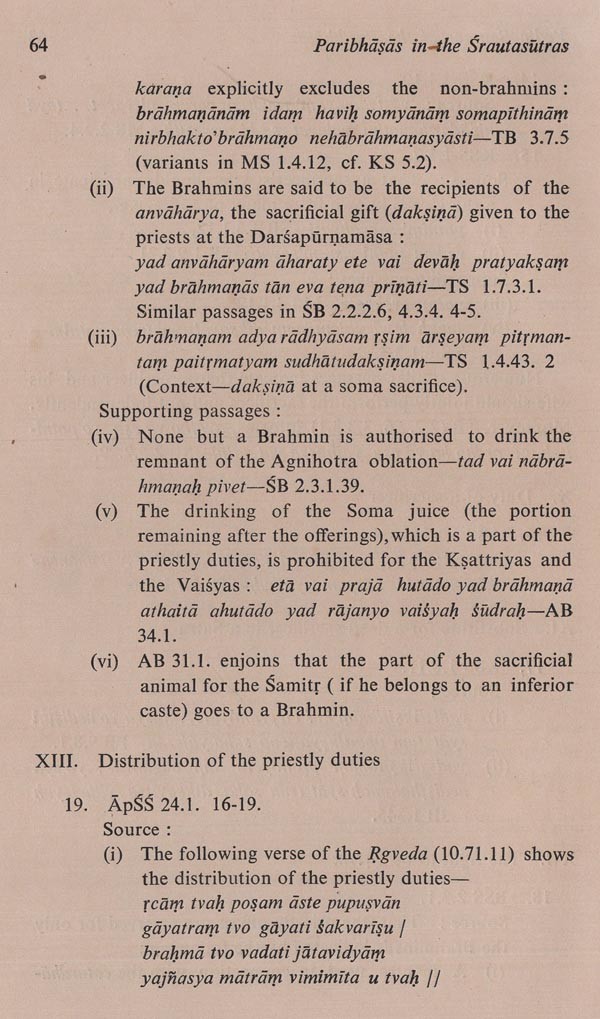 Sacrifices are the central theme of the Vedic religion and literature. It has been proclaimed that a sacrifice is indeed the best deed, yajno vai sresthatamam karma. Even the gods obtained their elevated status by the performance of sacrifices. A sacrifice is the safe boat for crossing the troubled waters of this world, yajno vai sutarmanauḥ." This boat must be free from defects so that the passengers taking refuge in it should not be endangered. The Vedic texts accordingly warn us that any flaw in the performance of a sacrifice may lead to disastrous results. For example, Tvastṛ's son (Vṛtra) was killed by Indra, Pusan lost his teeth, and Bhaga his eyesight, Bhallaveya fell victim of a chariot-accident, and Așadhi Sausromateya lost his life-all for committing errors in the sacrificial procedure. Hence the correct procedure is a desideratum. The sacrificial procedure is given in the Vedas, especially in the Brahmana portions. In ancient period the Aryans per- formed the Vedic sacrifices under the directions contained in the Mantra and the Brahmana texts. With the development of ritual and ritualistic controversies, the necessity for more concise and systematic treatment of the sacrifices was felt, and the Srautasutras were composed to serve the purpose. The Srautasutras are thus the connecting link between the Vedic and the post-Vedic literature of India. Though they are based on the Brahmanas, they show considerable difference in matter and the manner of expression. In some cases of sacerdotal controversy, the Brahmanas record several conflicting views, whereas a Srautasutra gives only one. On the other hand, a Srautasutra at times gives several optional views not recorded in the corresponding Brahmanas. It appears to be a natural development, since some of the older alternative views lost importance and new ones developed in the course of time. The Brahmanas show, often with the help of legends and mystic interpretations, the origin and the propriety of the rites and the meaning of the mantras employed in sacrifices. The Srautasutras furnish a well-connected and systematized description of the rites in due sequence from the beginning to the end of a sacrifice. They avoid legends and mystic interpretations, which are the chief interest of the Brahmanas. They are less discursive and more practical. The authors of the Srautasutras assimilated some ritual details from other different schools than their own, on the supposition that the Veda comprising all the branches is the authority on the Vedic sacrifices and that the texts of one's own school should be supplemented by those of other schools whenever necessary. Such mutual impact of the schools and their Srautasutras also gave rise to s differences between a Brahmana and its Srautasutra.