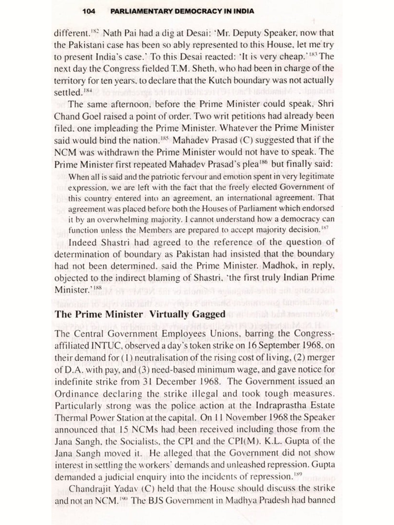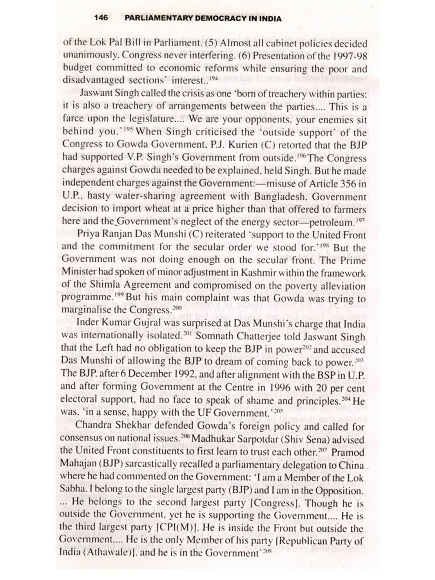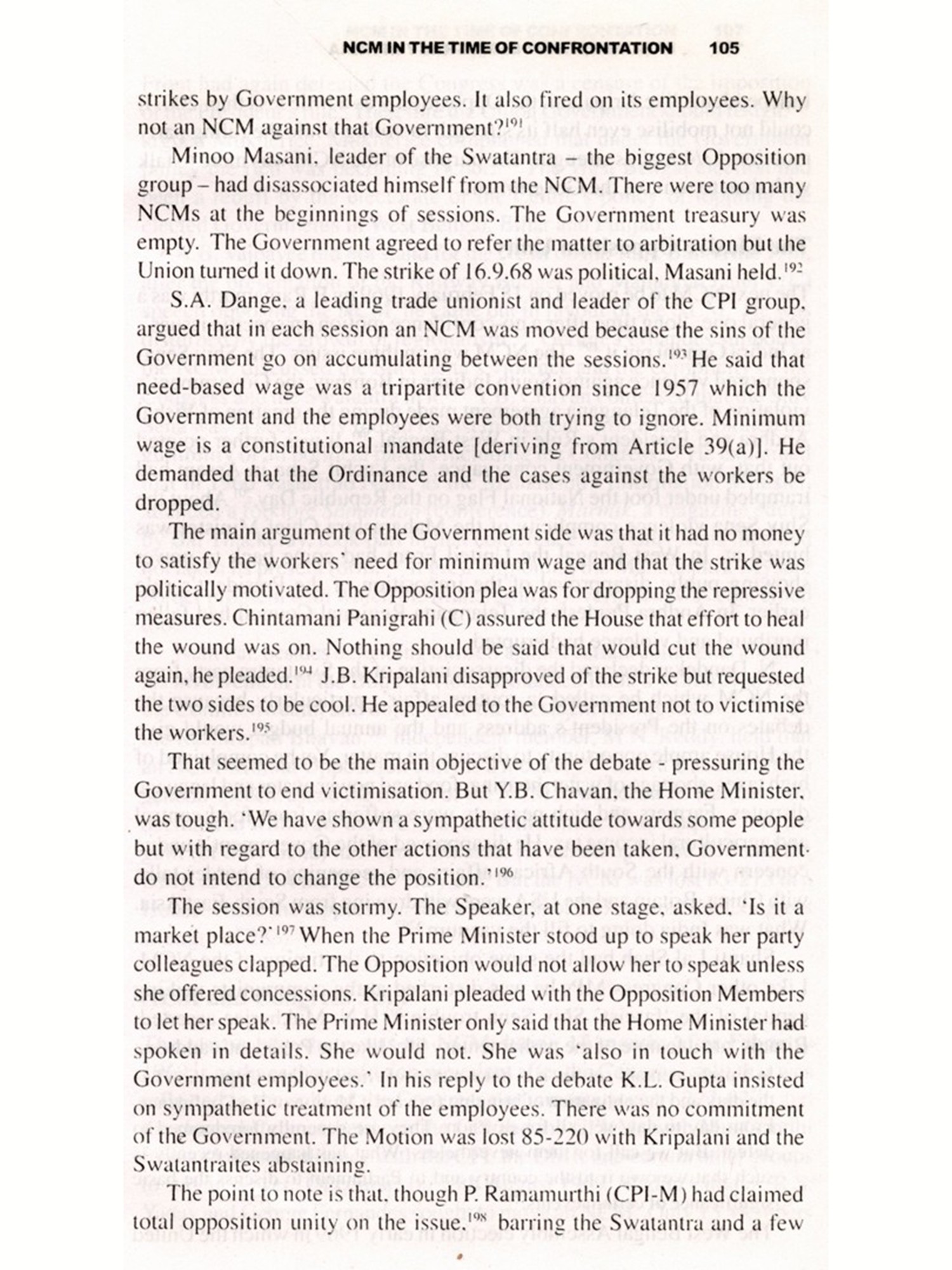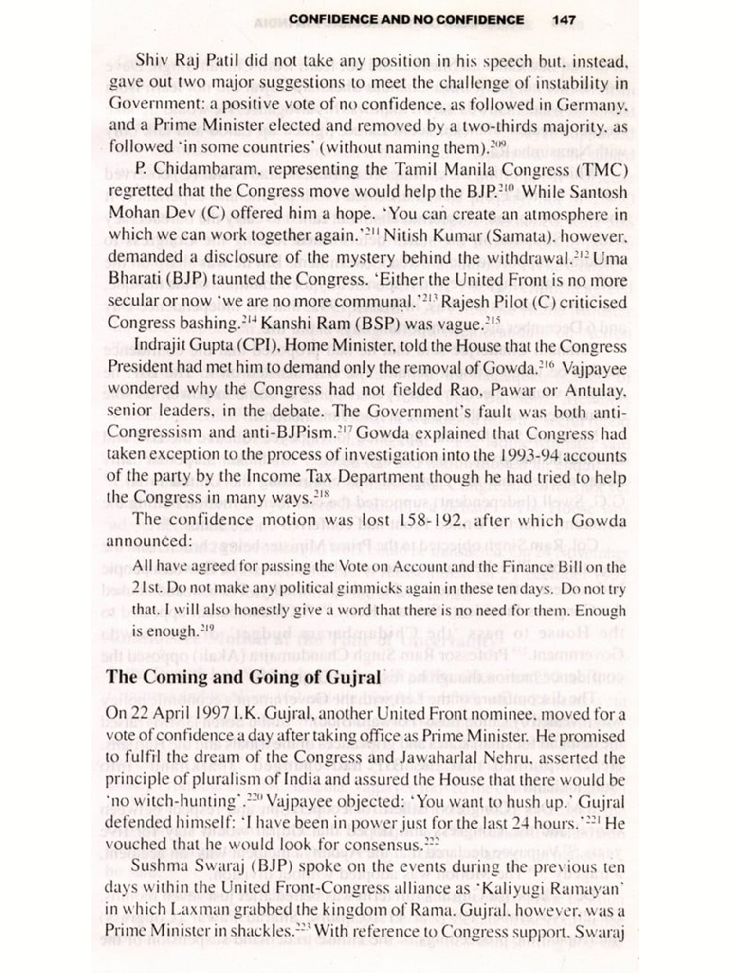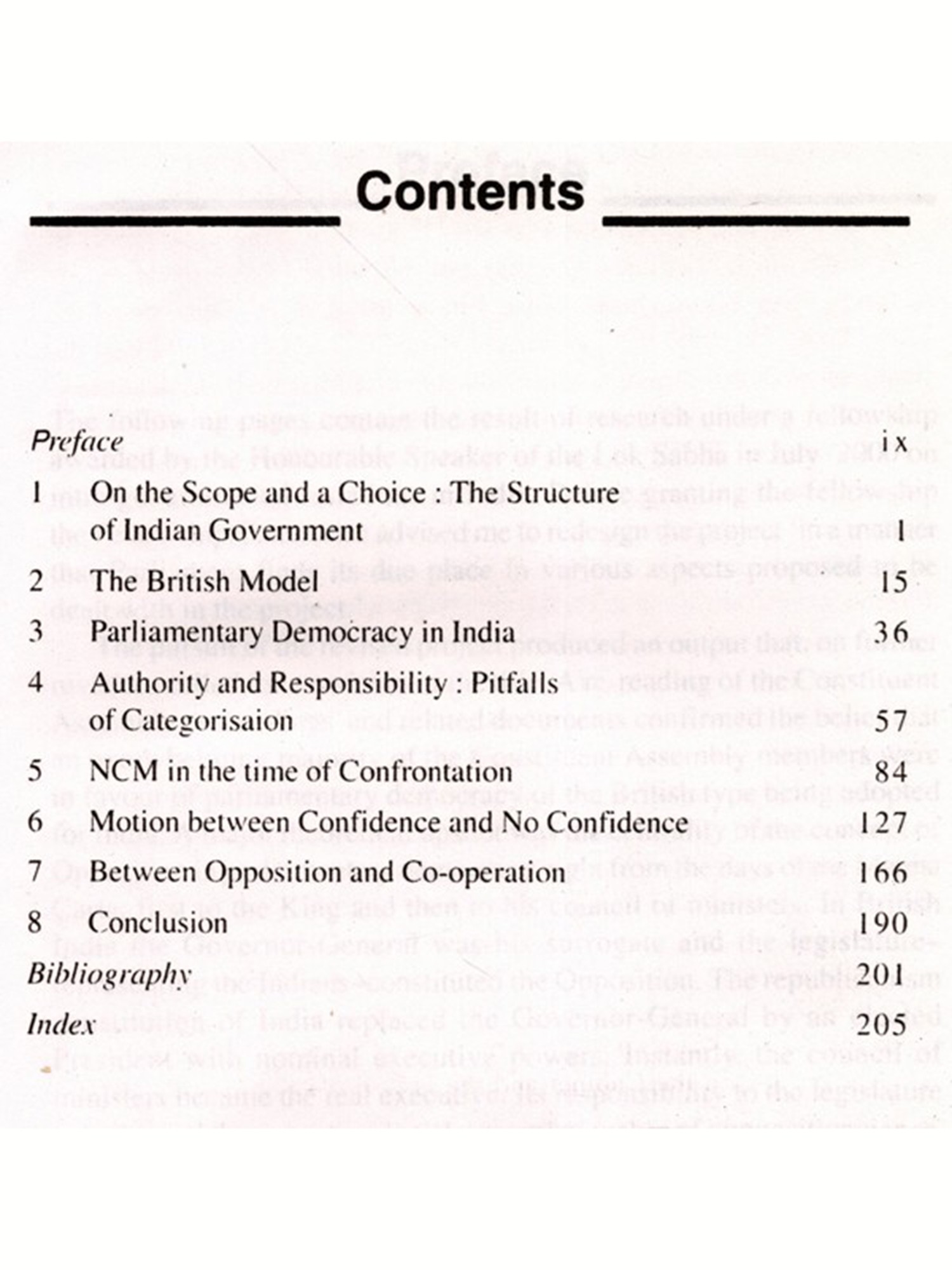 A random survey of the Lok Sabha Debates revealed that nothing embodies opposition, and enforces ministrial responsibility, more than the debates on no-confidence and confidence. The constraint of time and space did not allow a fuller treatment of these debates. The limited treatment of such debates in the first thirteen Lok Sabhas here, however, has shown their enormous value in the working of parliamentary reform, both politically and procedurally, even though the confidence motions have often and the no-confidence motions always failed. The unstinted co-operation of Shri N.K. Sapra, the then Director, Lok Sabha Secretariat and his staff, particularly in the Lok Sabha Library. deserves to be acknowledged first. I have also used the libraries of the Delhi University and the Jawaharlal Nehru University. I have had the privilege of discussion with some officials and Members of Parliament, particularly Shri T.N. Chaturvedi and Shri Pranab Mukherjee of the Rajya Sabha and Dr. Biplab Dasgupta of the Lok Sabha. I have had the opportunity of testing some of my ideas in a workshop on the Indian Parliament organized by the Centre for Public Affairs, the India International Centre and the Konrad Adenaur Foundation at the India International Centre, New Delhi, on 25-27 August 2002 in a paper on Parliamentary Reform in India'. The proceedings of the seminar have since been published as The Indian Parliament: A Comparative Perspective, edited by Ajay K. Mehra and Gert W. Kueck (Delhi, Konark, 2003).