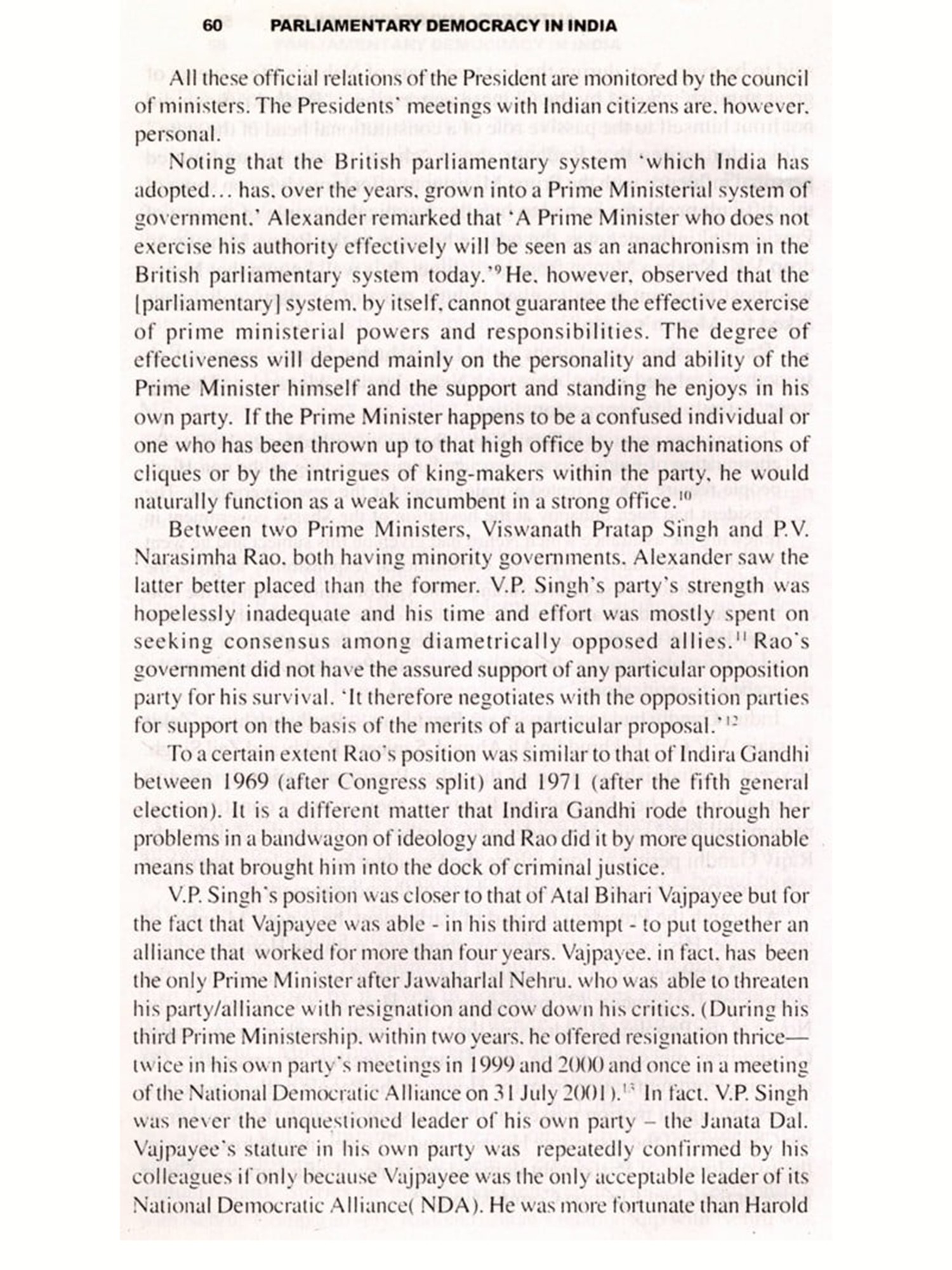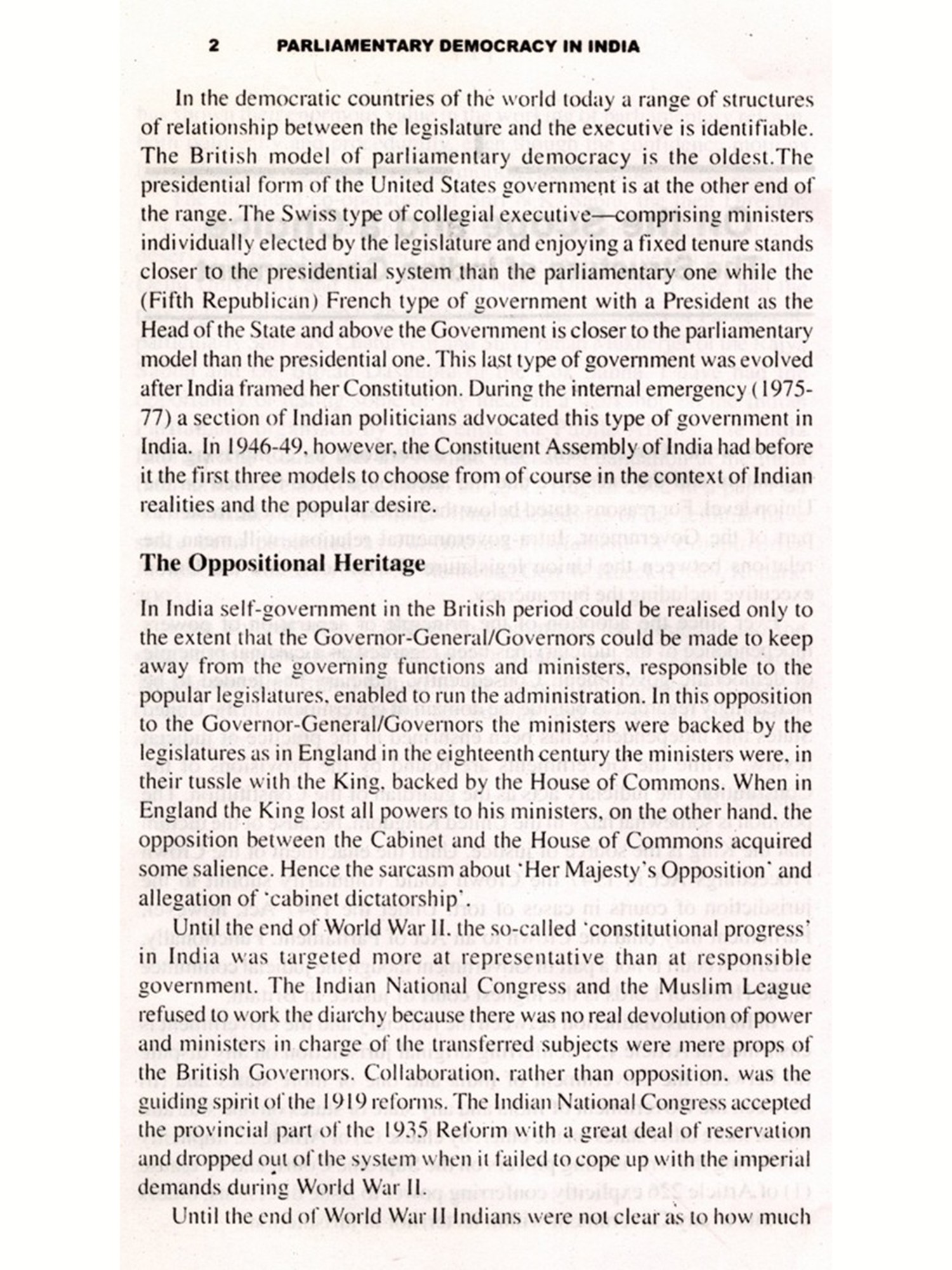 The pursuit of the revised project produced an output that, on further revision, called for a revision of the title. A re-reading of the Constituent Assembly proceedings and related documents confirmed the belief that an overwhelming majority of the Constituent Assembly members were in favour of parliamentary democracy of the British type being adopted for India. A major theoretical upshot was the centrality of the concept of Opposition in parliamentary democracy, right from the days of the Magna Carta, first to the King and then to his council of ministers. In British India the Governor-General was his surrogate and the legislature-representing the Indians-constituted the Opposition. The republicanism constitution of India replaced the Governor-General by an elected President with nominal executive powers. Instantly, the council of ministers became the real executive. Its responsibility to the legislature transformed the executive-legislature relationship of opposition per se. The legislature as a whole became the watchdog over the executive-including the administration. Within the legislature, however, opposition was institutionalised by the party system granting it a critical role. The Opposition is not only the conscience keeper of the Government but also the past and the future Government. In interacting with the Opposition the Government is talking with the past and the present. In a broad sense the Opposition has become a part of the Government.