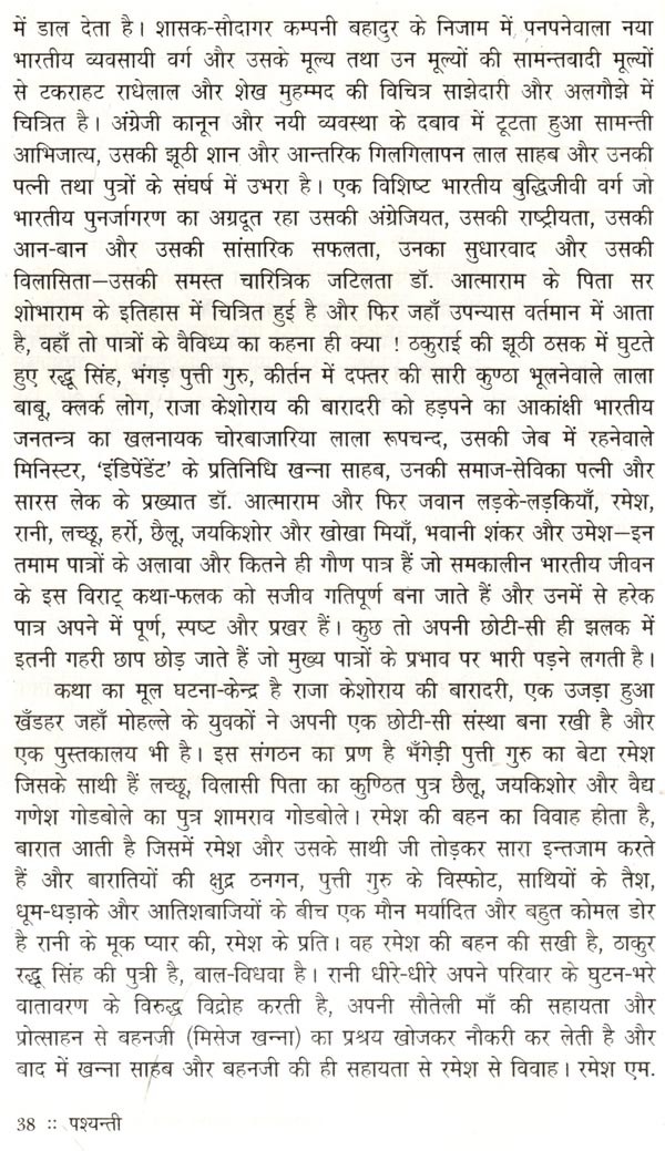 पश्यन्ती के निबन्धों में धर्मवीर भारती की एक ऐसी बहुआयामी साहित्य-दृष्टि मिलेगी जो इतिहास की हवाओं की हर हल्की से हल्की हिलोर पर संवेदनशील मुलायम पीपल पात की तरह काँप उठे, ग्रीक वीणा की तरह झंकार भी दे, और खुले हुए पाल की तरह तनकर, तेज़ हवाओं को आत्मस्थ कर, तूफ़ानों को चीरने का साहस-पथ भी निर्दिष्ट करे।
