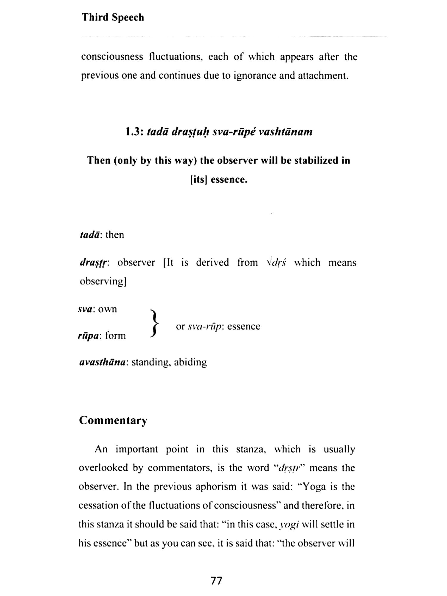 Over the past twenty years, I have dedicating myself into the research and exploration of the classical Yoga literature, and delving into the philosophy and wisdom of ancient India. During this period, I have repeatedly taught the four parts of the of Patanjali's treatise, the wise and enlightened ancient Indian sage. Moreover, I have spent approximately two years translating into Persian and providing a comparative commentary on the book ""Tarjamat ketäb Bātanjali fi'l-kalāş men al-ertebāk"" by Abu Rayhan al-Biruni, which stands as the first translation of the Yoga-Sutras from Sanskrit to Arabic. While immersed in the enchantment of Sanskrit verses and exploring their cause-and-effect relationship, a friend of mine inquired ""What message do these ancient treatises, hold for the contemporary people? Can you build a bridge between the silent wisdom of those sages and the tumultuous present era, or is this preoccupation with ancestors and a reaction to the inability of living in this era?!""