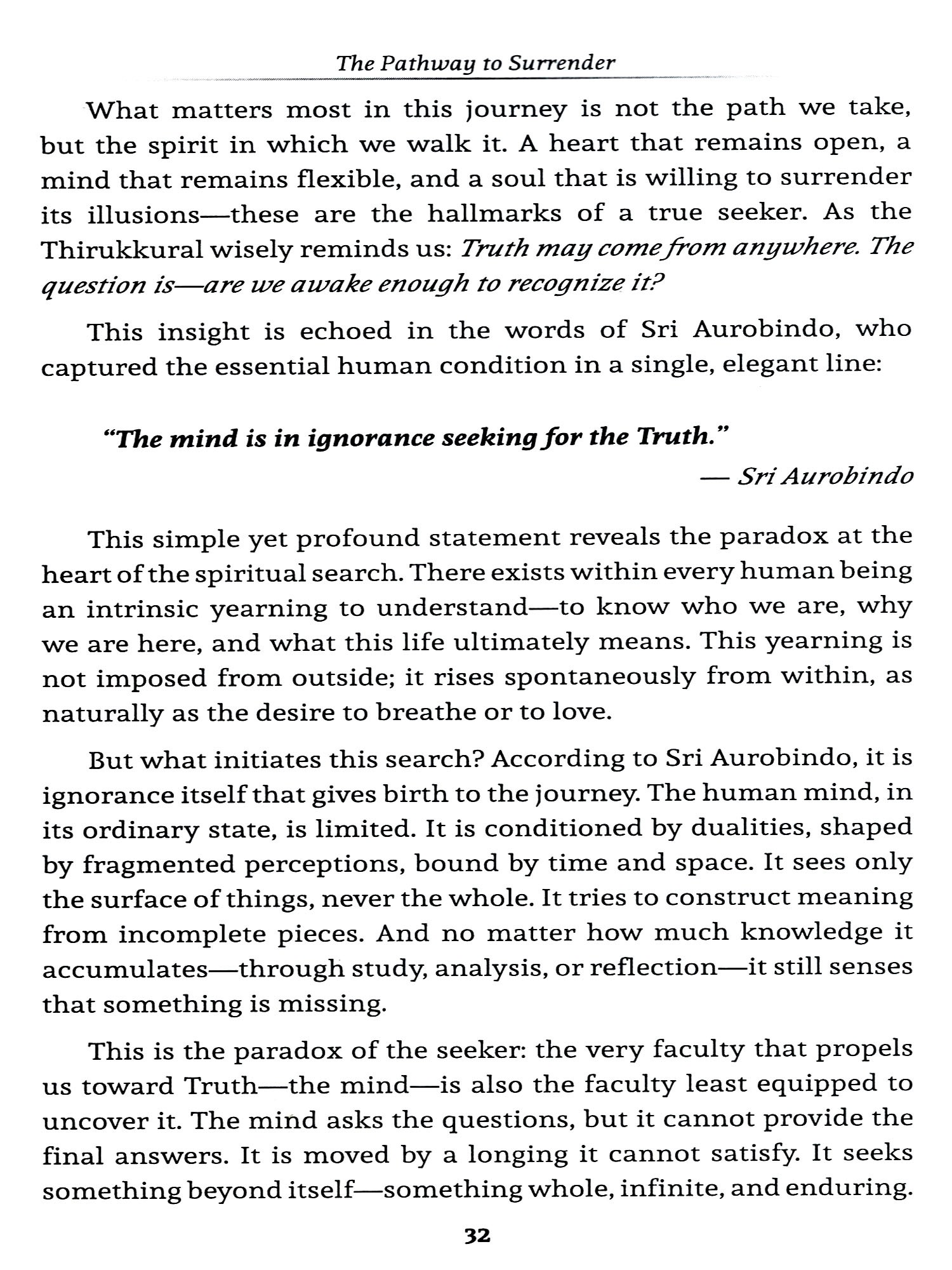 The Pathway to Surrender is a soulful guide that takes the reader through the stages of spiritual awakening-from the seeker's initial state of restlessness to the final, liberating act of surrender to the Divine. Drawing from Hindu scriptures and the teachings of saints like Ramana Maharshi, Ramakrishna, Aurobindo, Nisargadatta Maharaj. Thayumanavar and others, the book gently explores themes such as meditation, silence, love, ego, path of knowledge, path of devotion, divine grace and surrender. More than a theoretical treatise, it offers experiential wisdom to help readers recognize that true freedom lies not in control, but in letting go. In a restless world, this book is a call to stillness, simplicity, and surrender to the divine will. For a seeker of Truth, this book comes as a handy volume that gives the essence of Hindu spiritual wisdom. For students and academicians of Hinduism, this volume offers a distilled essence of the Hindu tradition, serving as a valuable resource for their academic and scholarly pursuits.