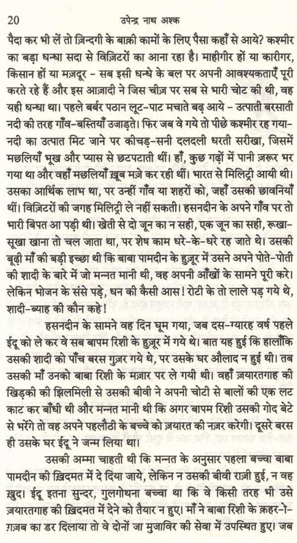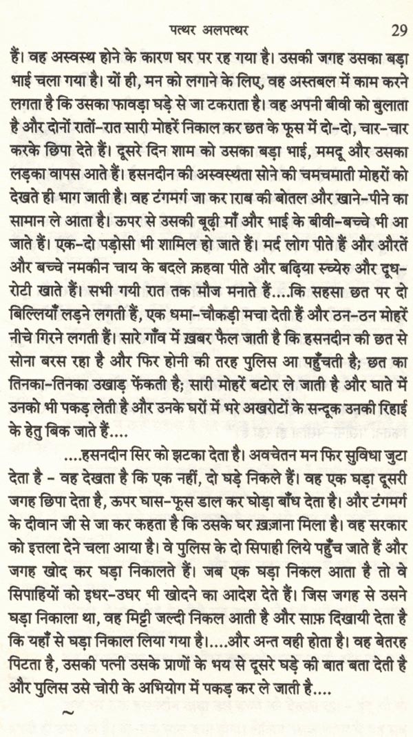 पत्थर अलपत्थर अपने छोटे से कलेवर में गरीबों के शोषण और उत्पीड़न की महागाथा है। कश्मीर की पृष्टभूमि पर लिखा गया यह पहला उपन्यास एक गरीब कश्मीरी घोड़वान हसनदीन की ज़िन्दगी के माध्यम से शुरू हुआ था, लेकिन पाठक इसकी पंक्तियों के बीच से उस आसन्न आँधी की झलक पा जाते हैं जिसने आज समूचे कश्मीर को अपनी गिरफ्त में ले रखा है। अश्क ने इस उपन्यास को ऐसे सधे हाथों और मार्मिकता के साथ रचा है कि उस सारे शोषण के प्रति, जो गरीब कश्मीरियों को सहना पड़ता है, पाठक के मन में क्रोध और बगावत की एक तेज़ लपट भड़क उठती है।