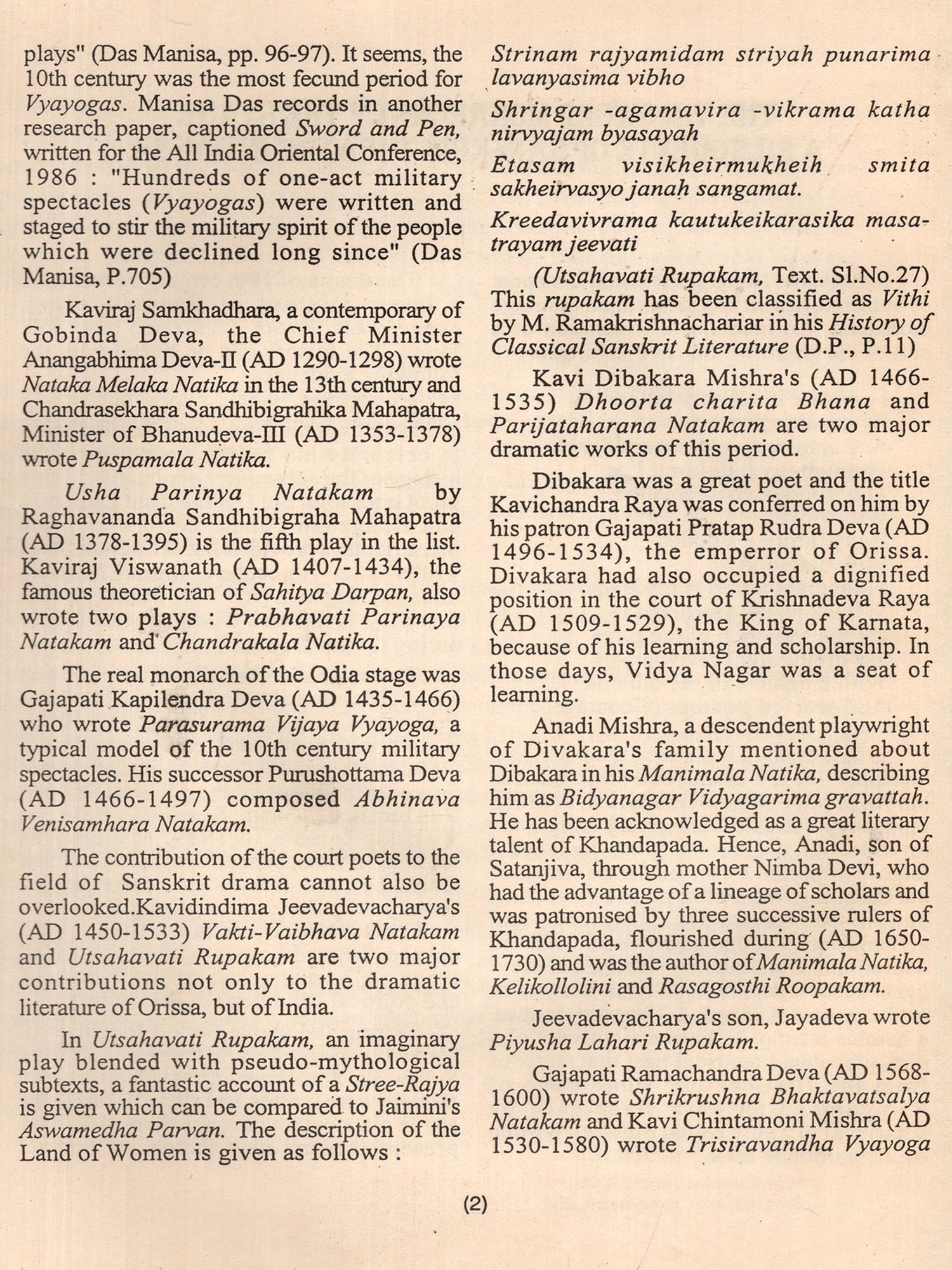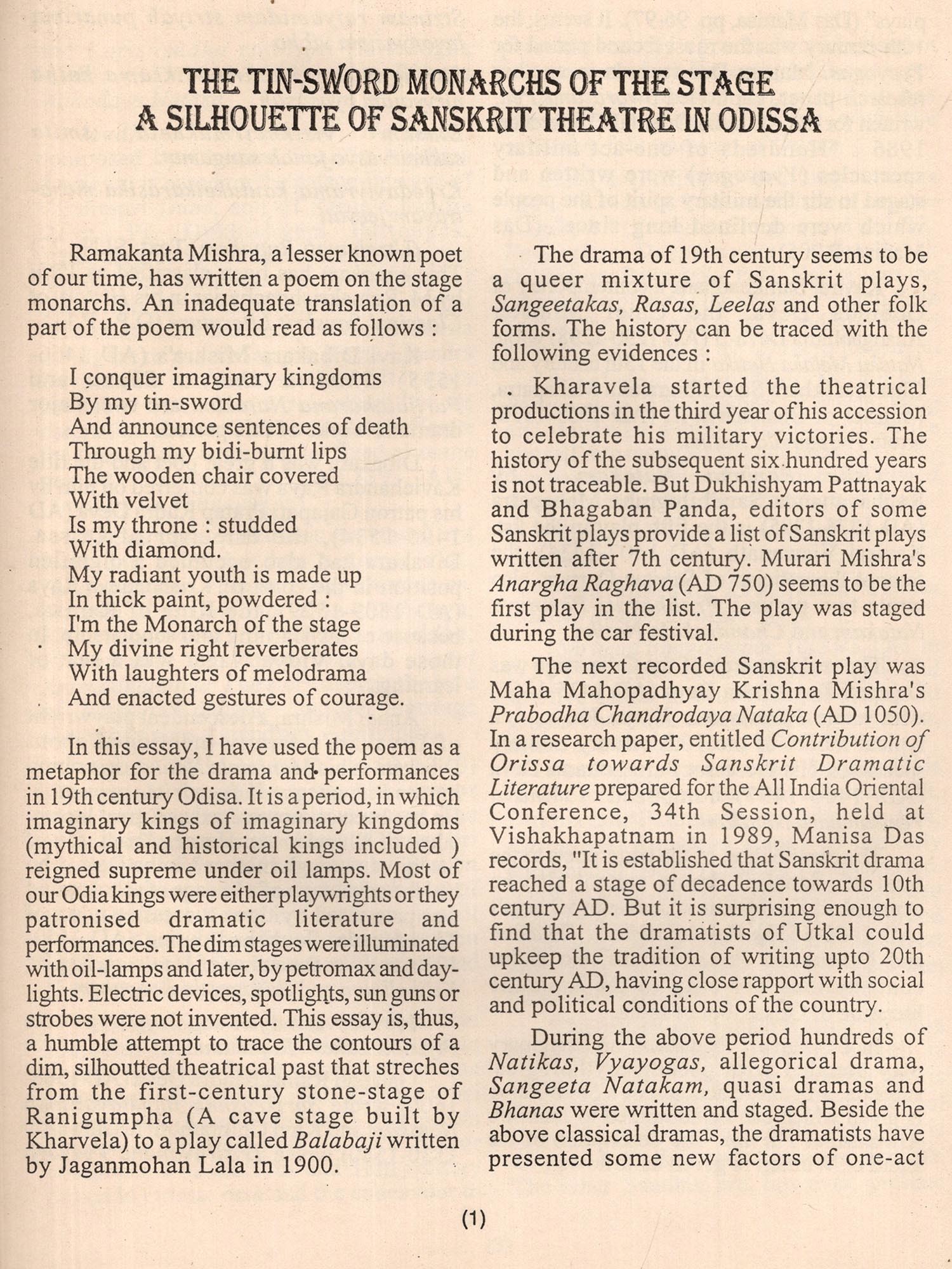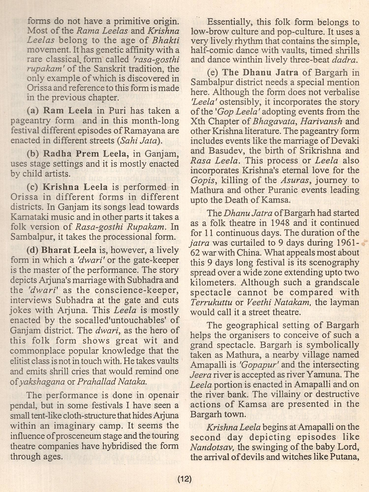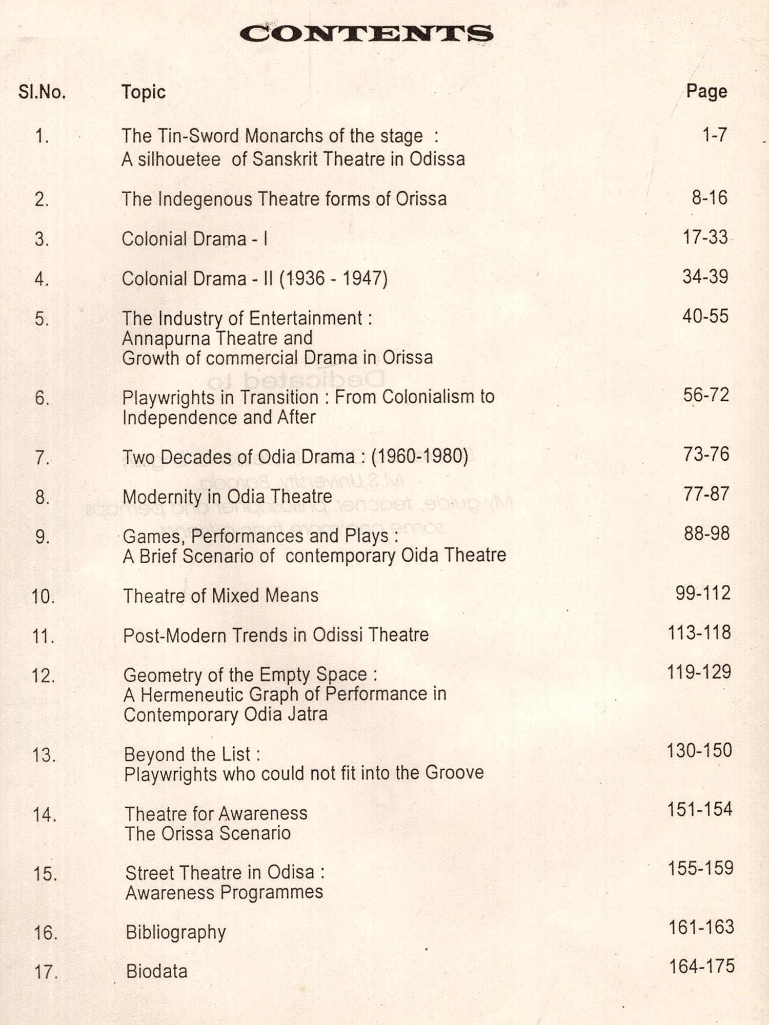 The book also records the socio-political history of Orissa at different phases of history. The changes in the theatrical taste of our people varies according to the demands of the changing culture. So, there are various movements through our history of theatre.